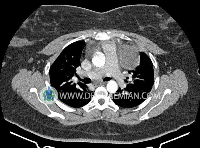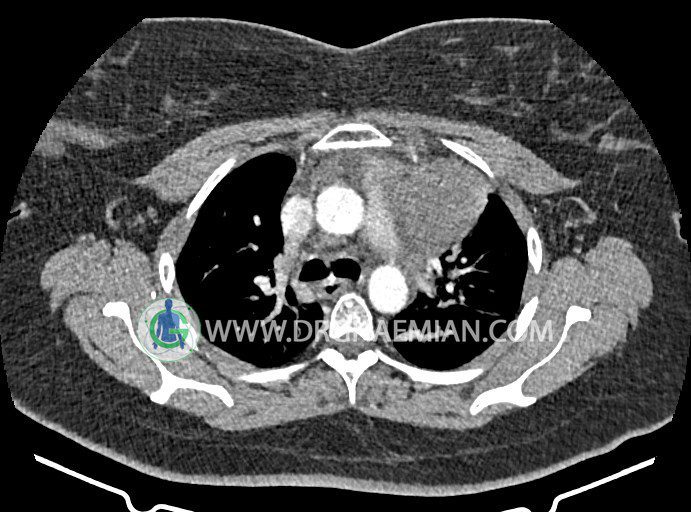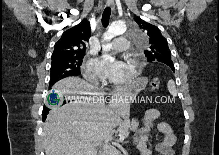 در سی تی اسکن اسپيرال ريه ها و مدياستن با کنتراست وريدی (مولتي ديدکتور 16 با مقاطع ظريف و بازسازي کرونال):