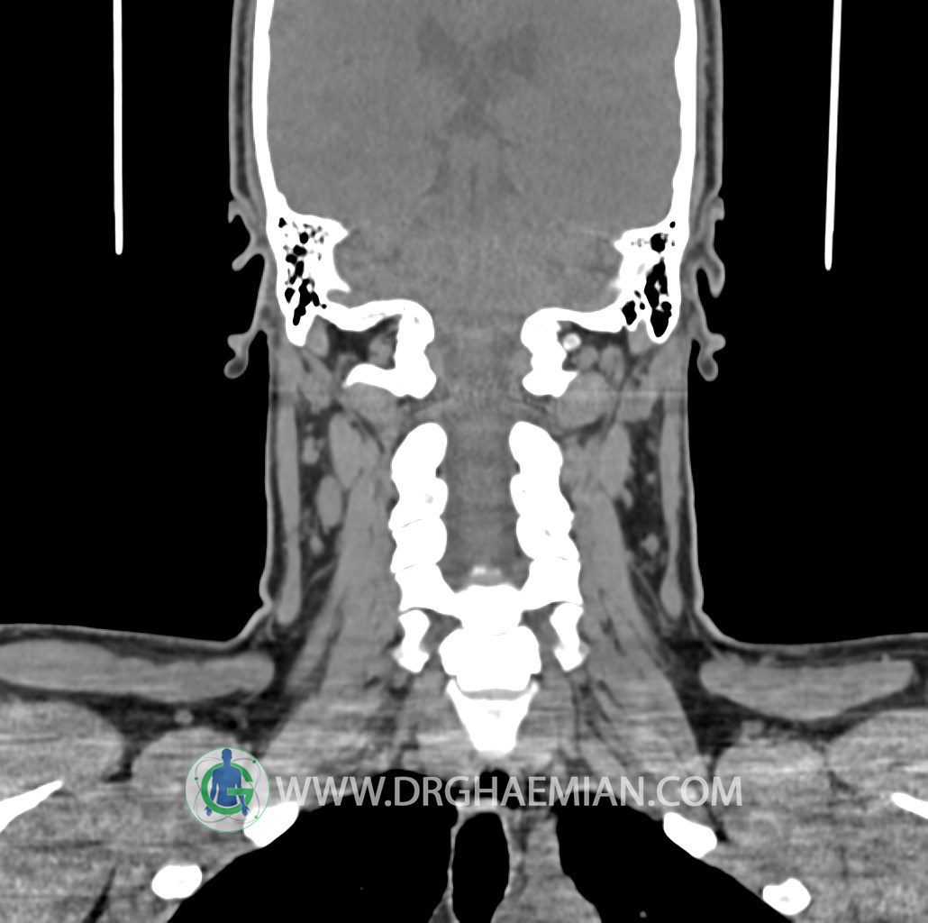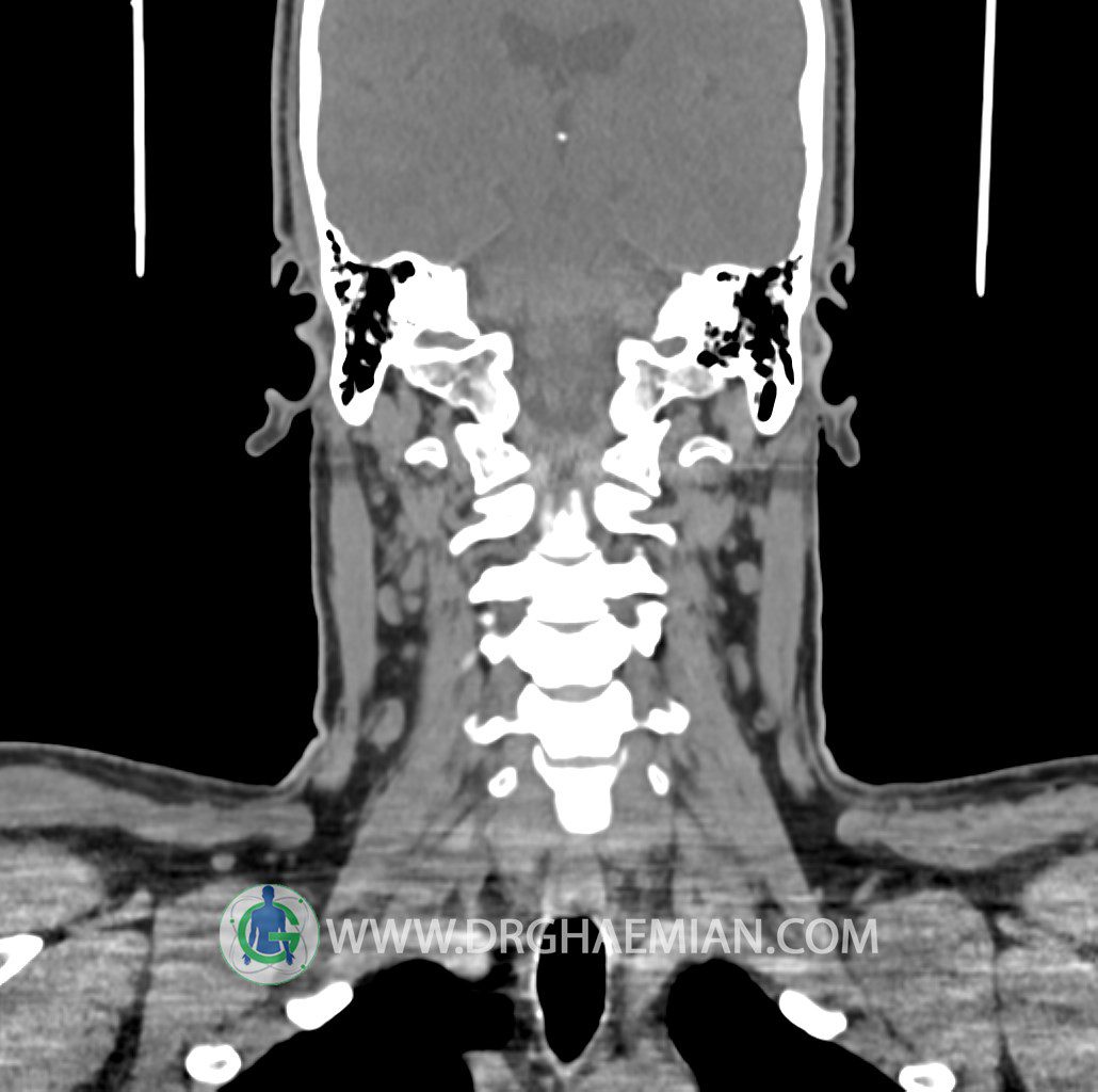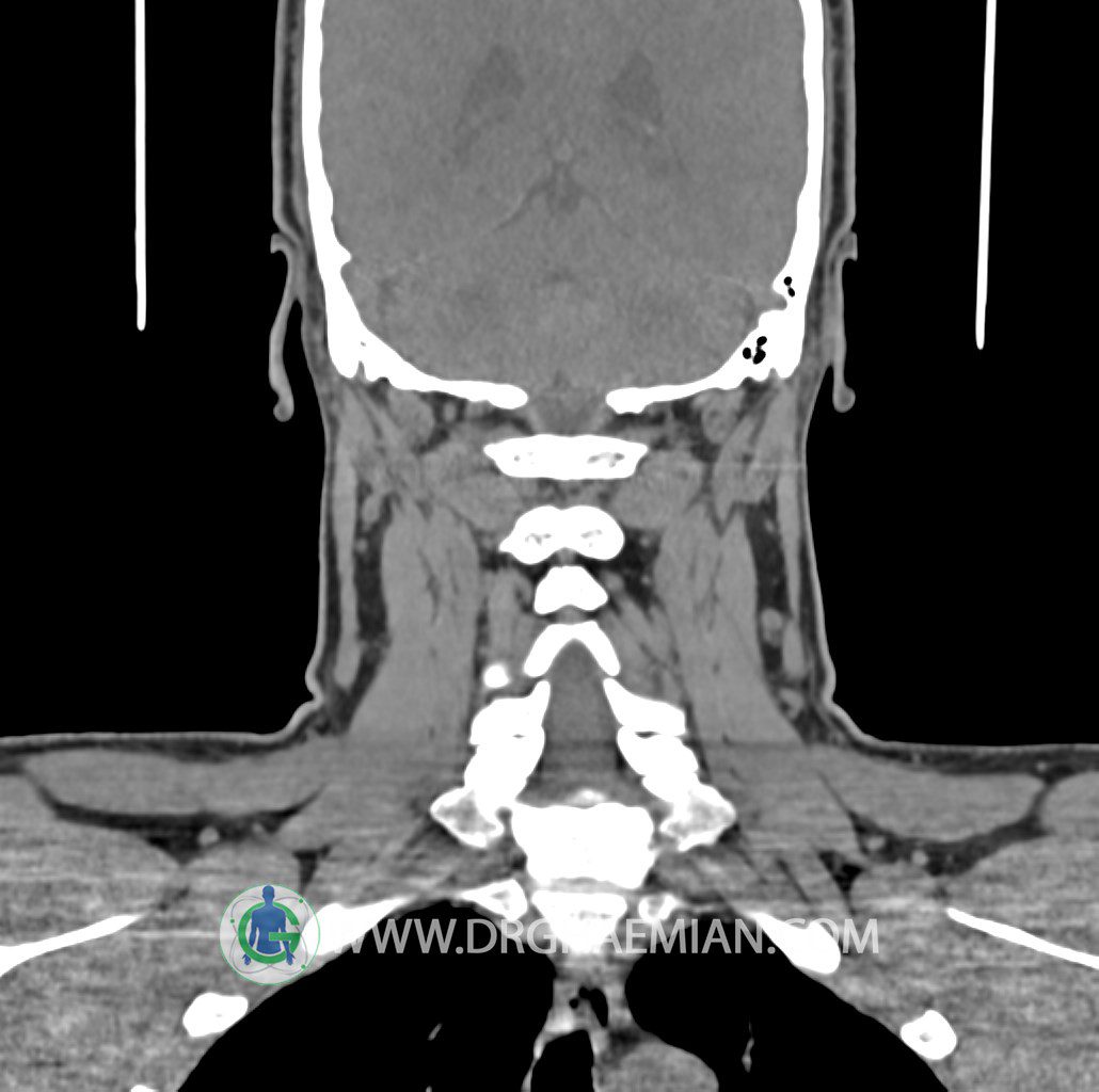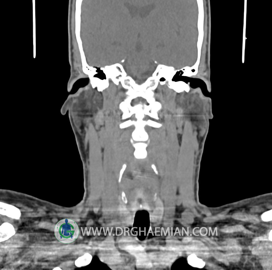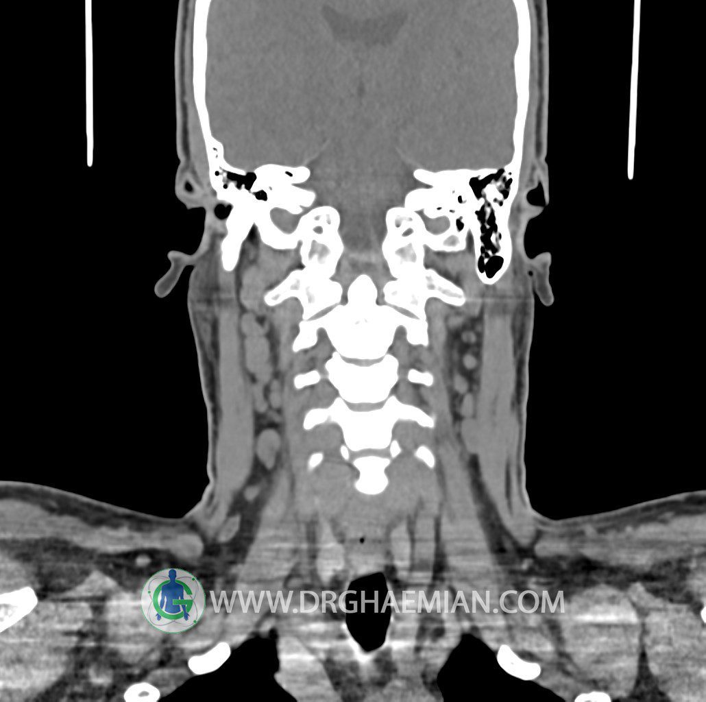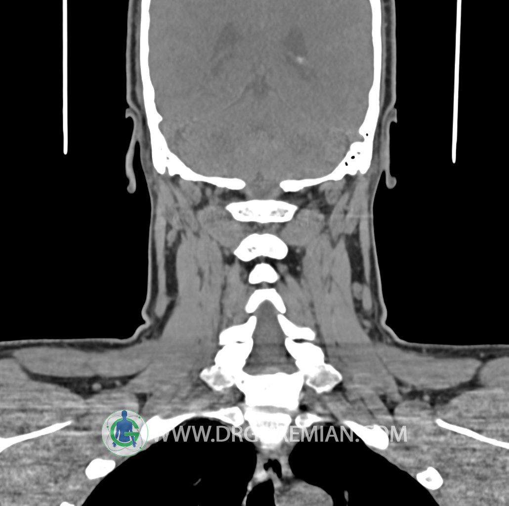 سی تی اسکن گردن یک روش تصویربرداری است که با استفاده از تشعات ایکس تصاویری با جزییات از ناحیه گردن ایجاد میکند. در این کیس لنفادنوپاتی گردن و تعدادی توده در پاروتید بیمار مشاهده می شود.