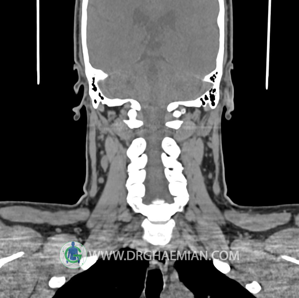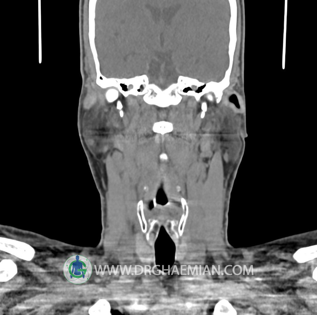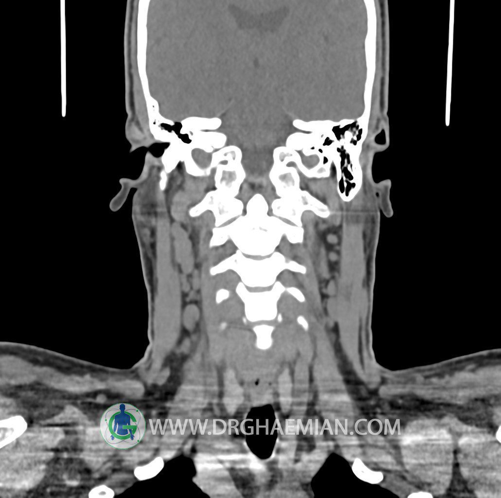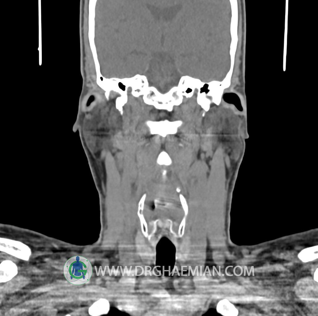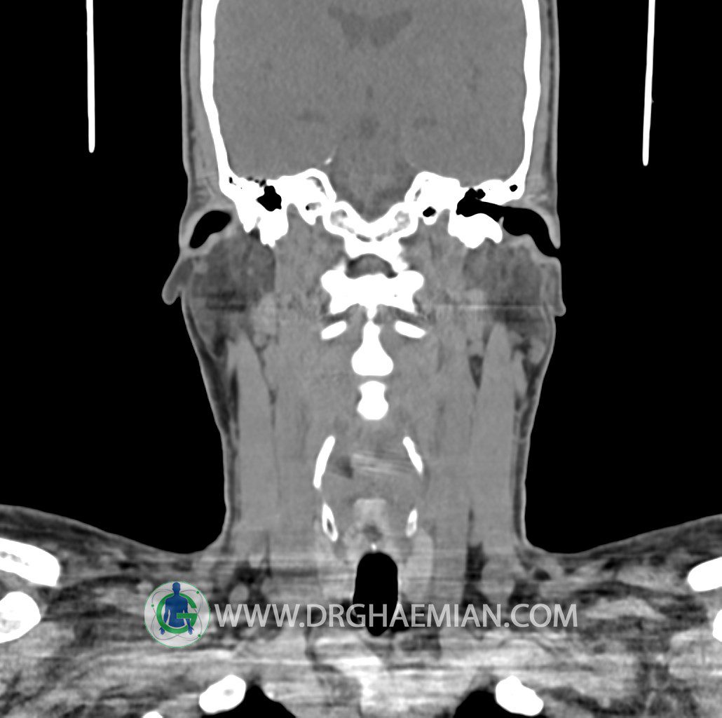 سی تی اسکن گردن یک روش تصویربرداری است که با استفاده از تشعات ایکس تصاویری با جزییات از ناحیه گردن ایجاد میکند. در این کیس لنفادنوپاتی گردن و تعدادی توده در پاروتید بیمار مشاهده می شود.
