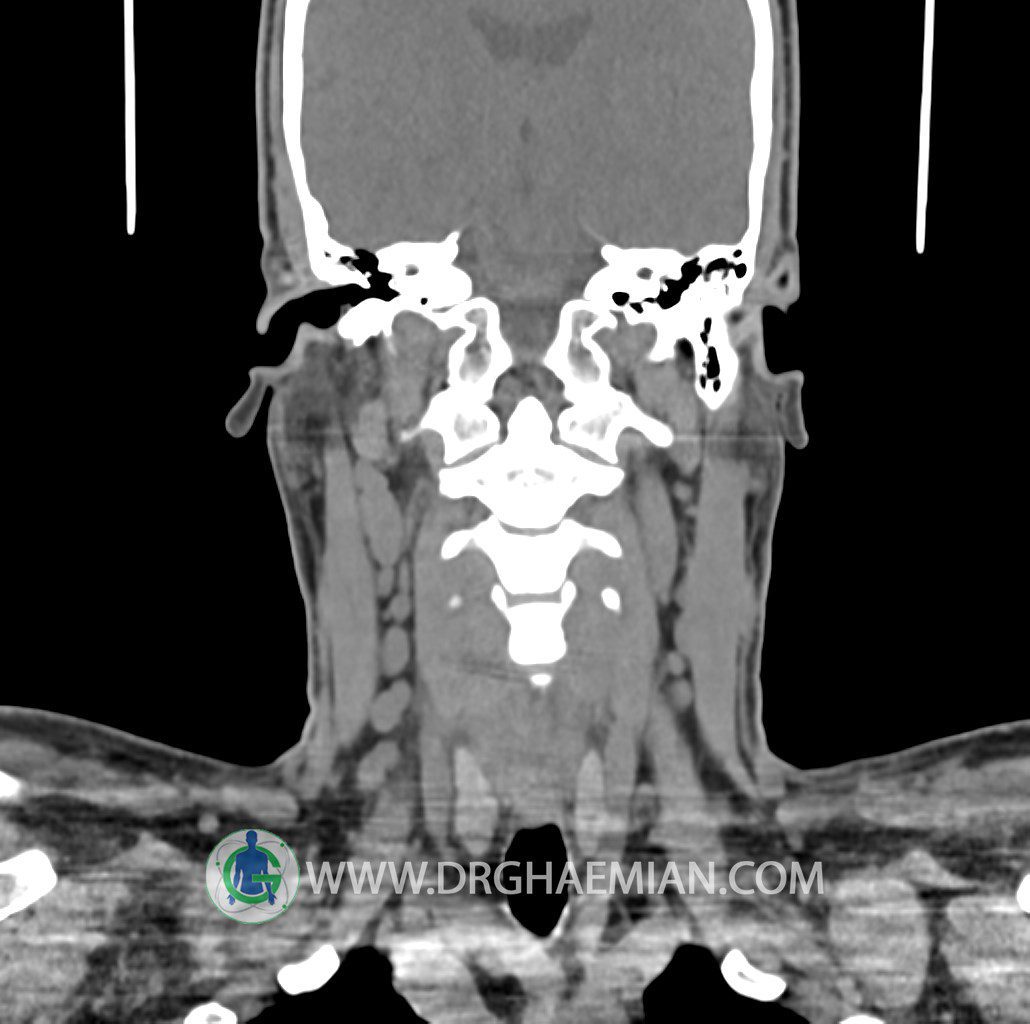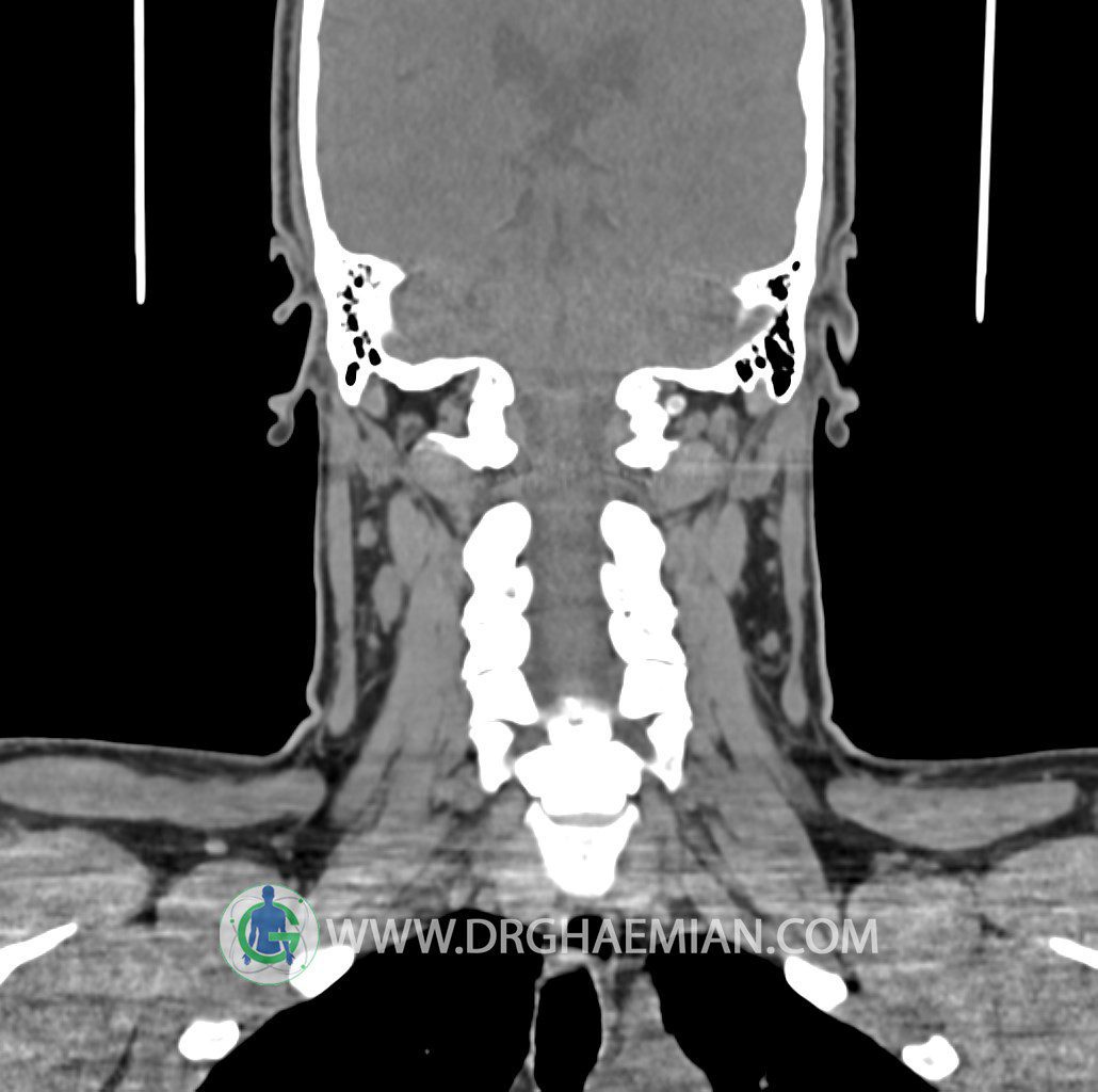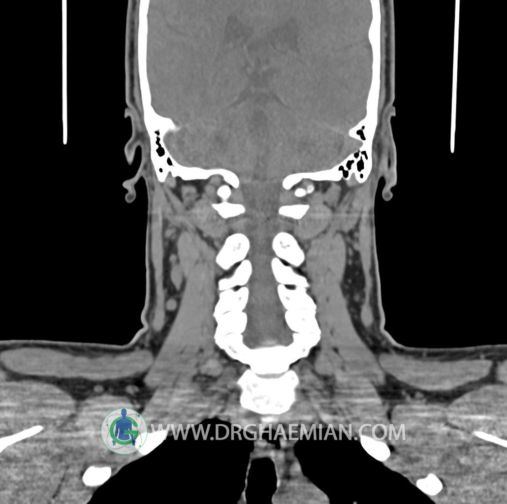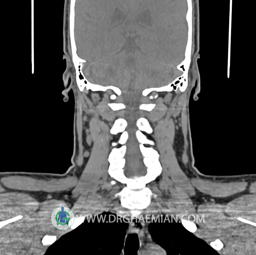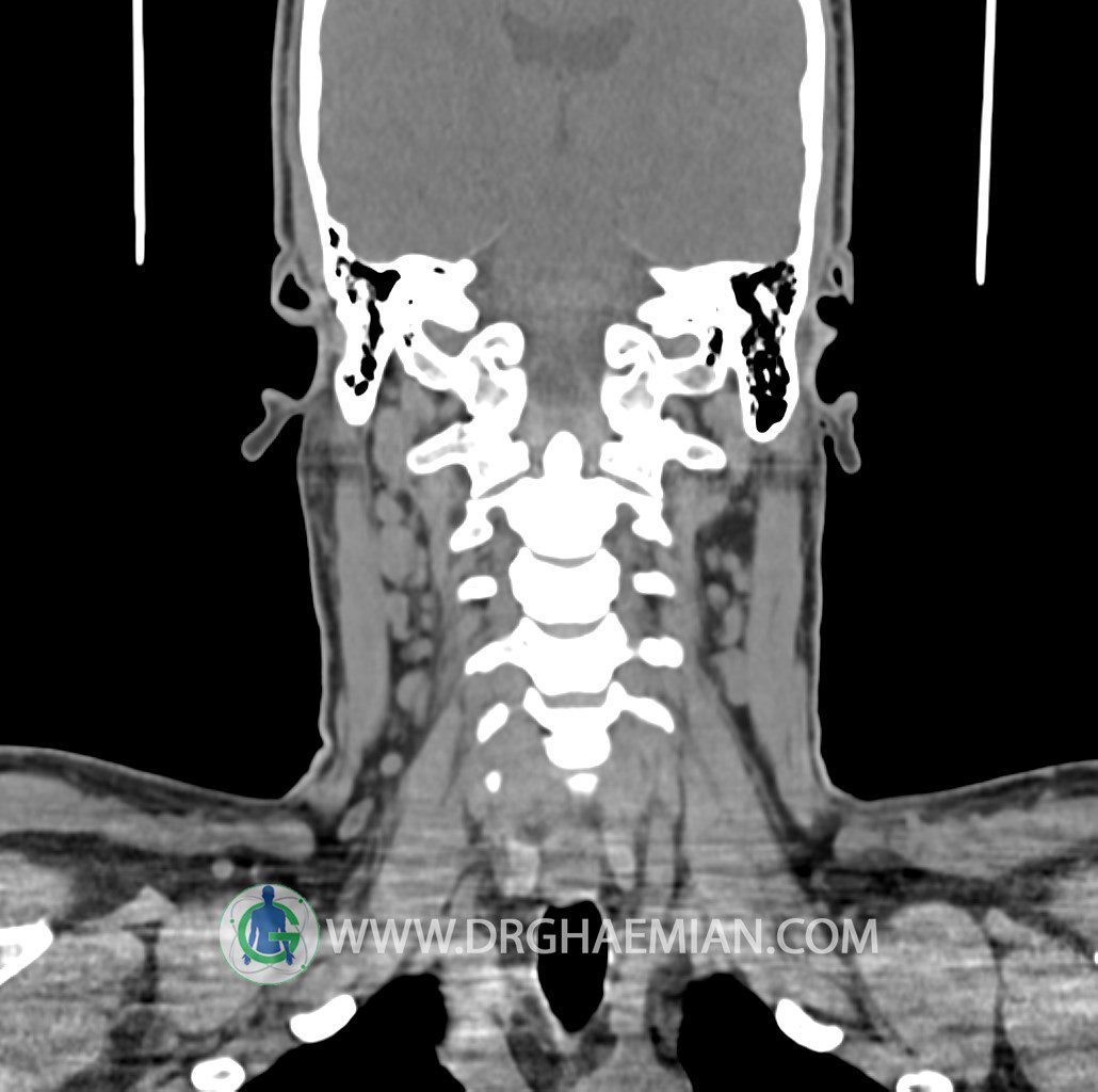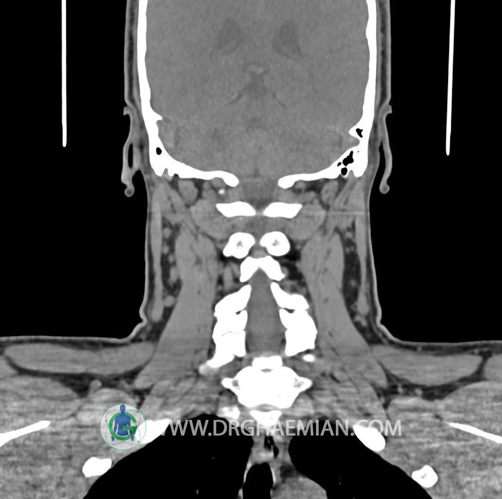 سی تی اسکن گردن یک روش تصویربرداری است که با استفاده از تشعات ایکس تصاویری با جزییات از ناحیه گردن ایجاد میکند. در این کیس لنفادنوپاتی گردن و تعدادی توده در پاروتید بیمار مشاهده می شود.