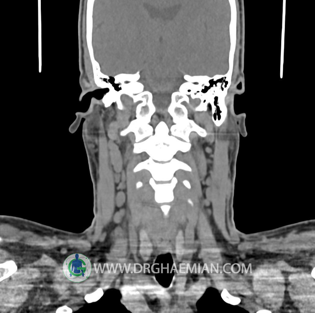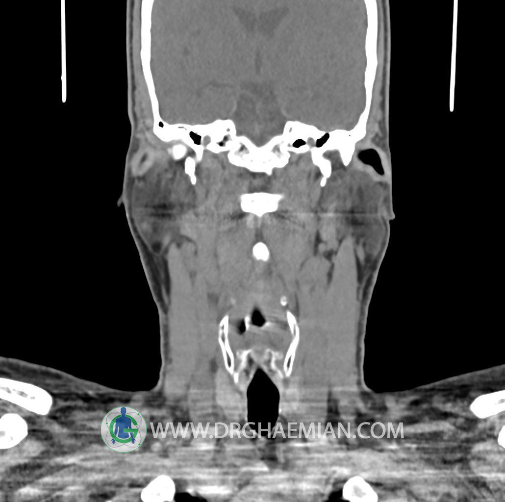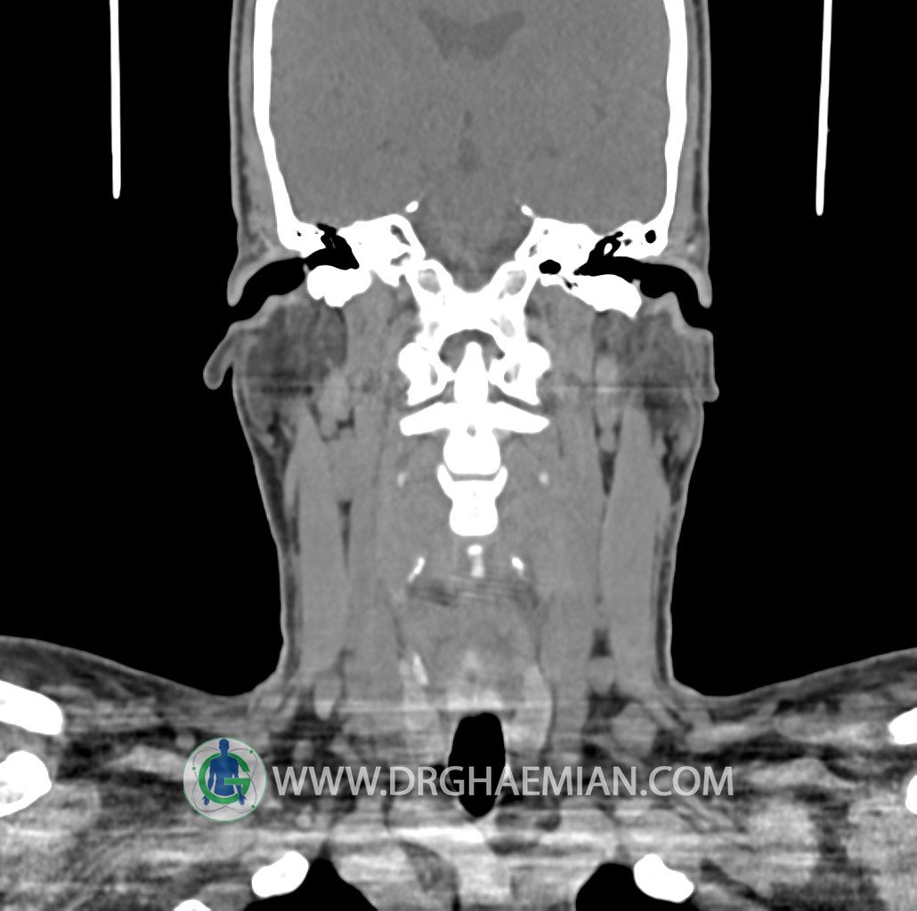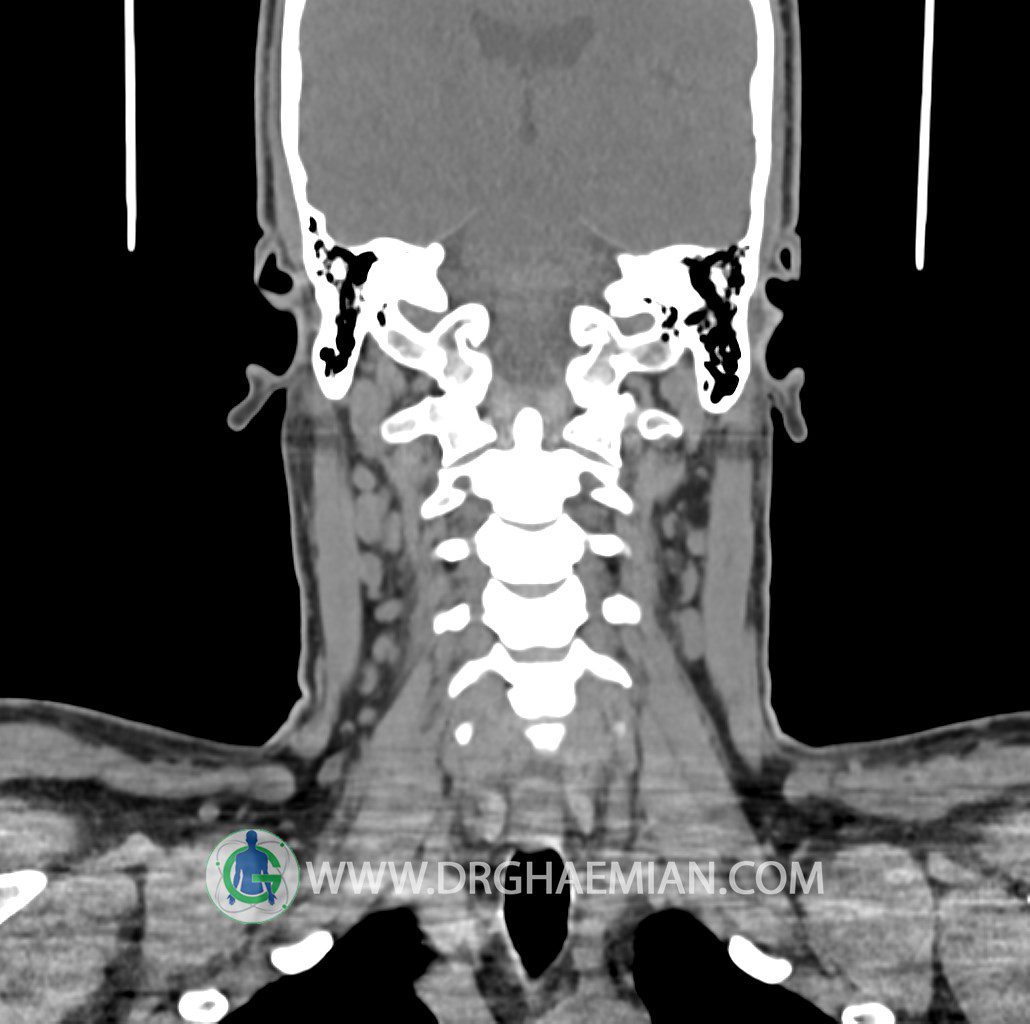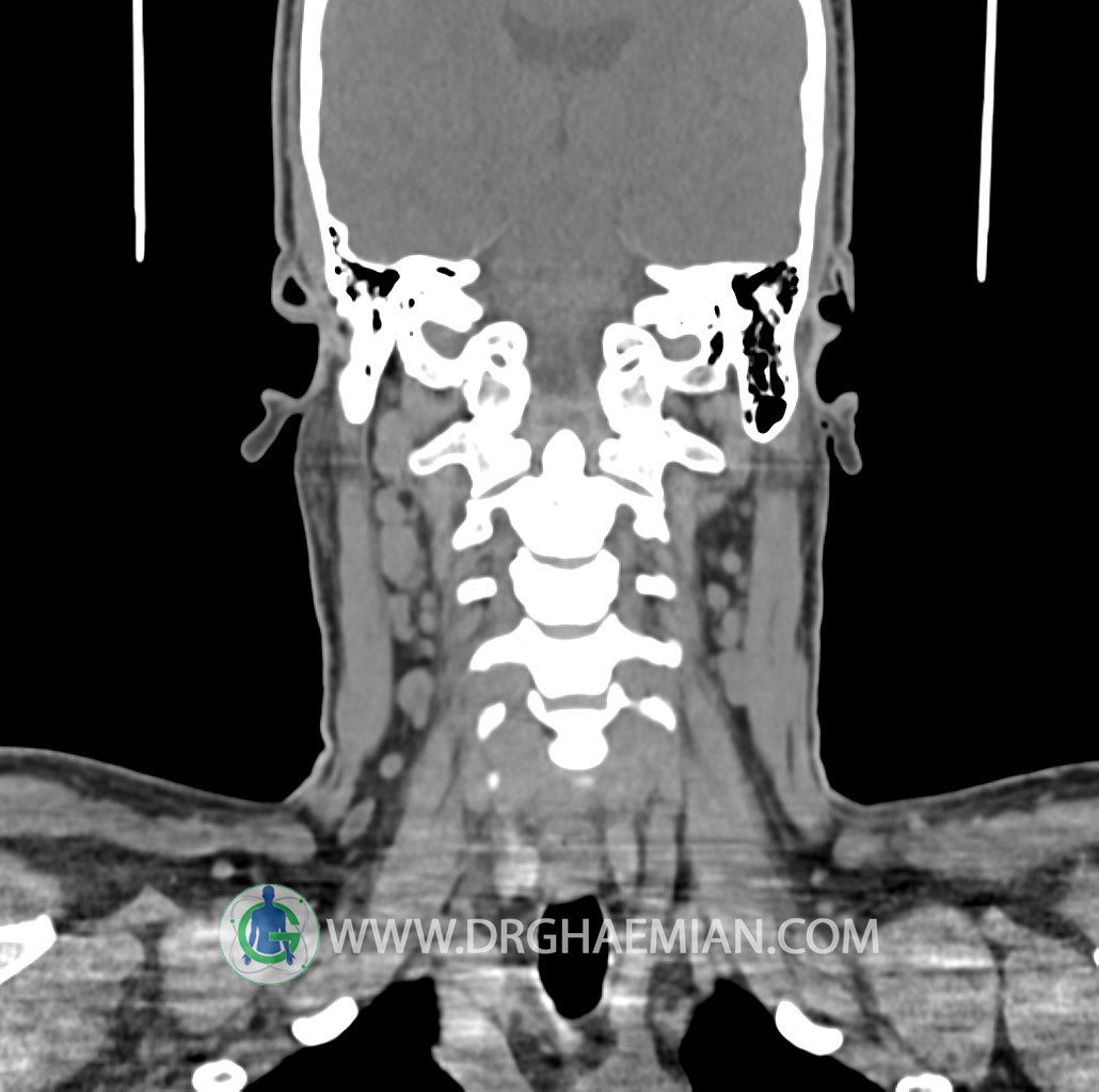 سی تی اسکن گردن یک روش تصویربرداری است که با استفاده از تشعات ایکس تصاویری با جزییات از ناحیه گردن ایجاد میکند. در این کیس لنفادنوپاتی گردن و تعدادی توده در پاروتید بیمار مشاهده می شود.