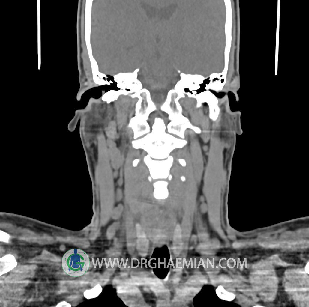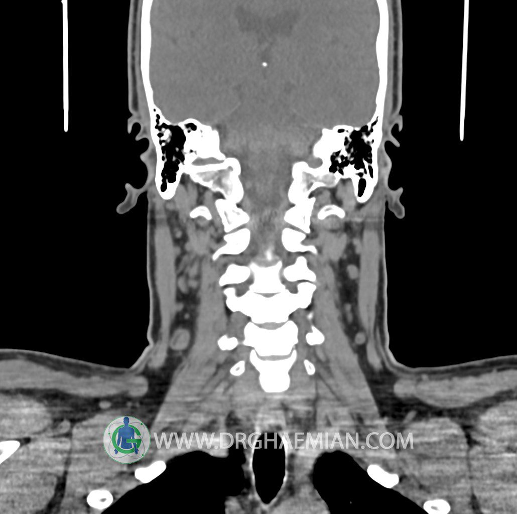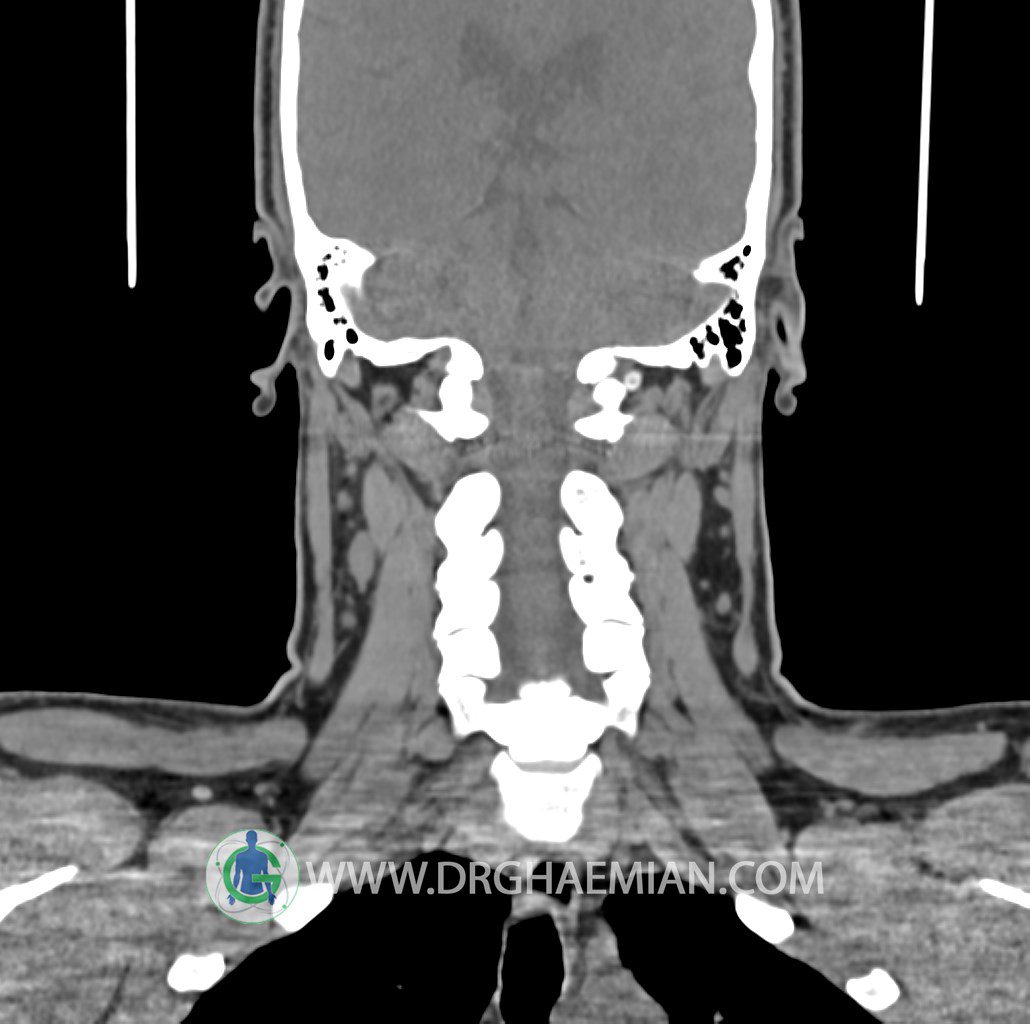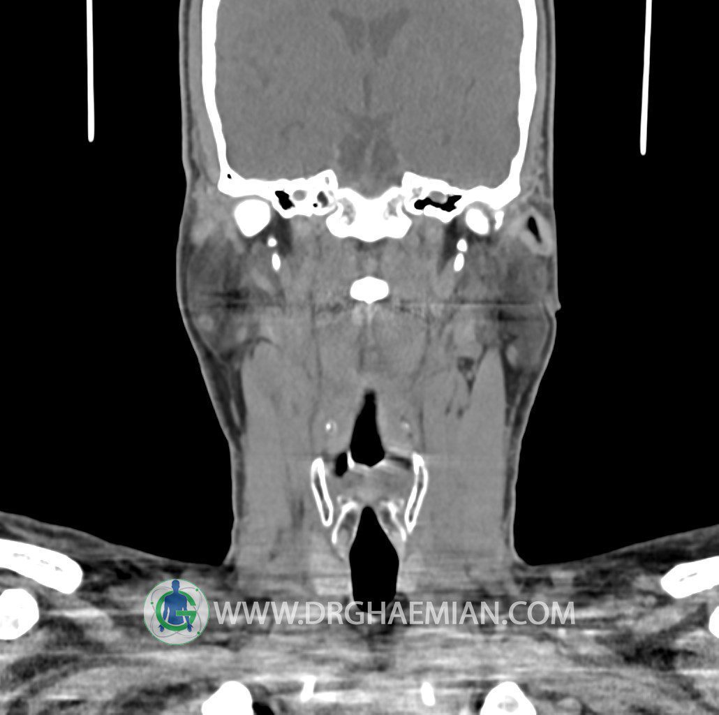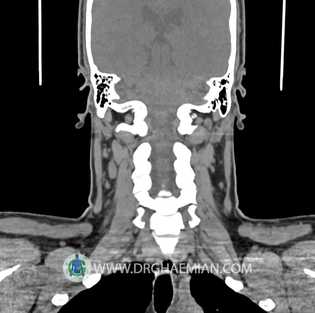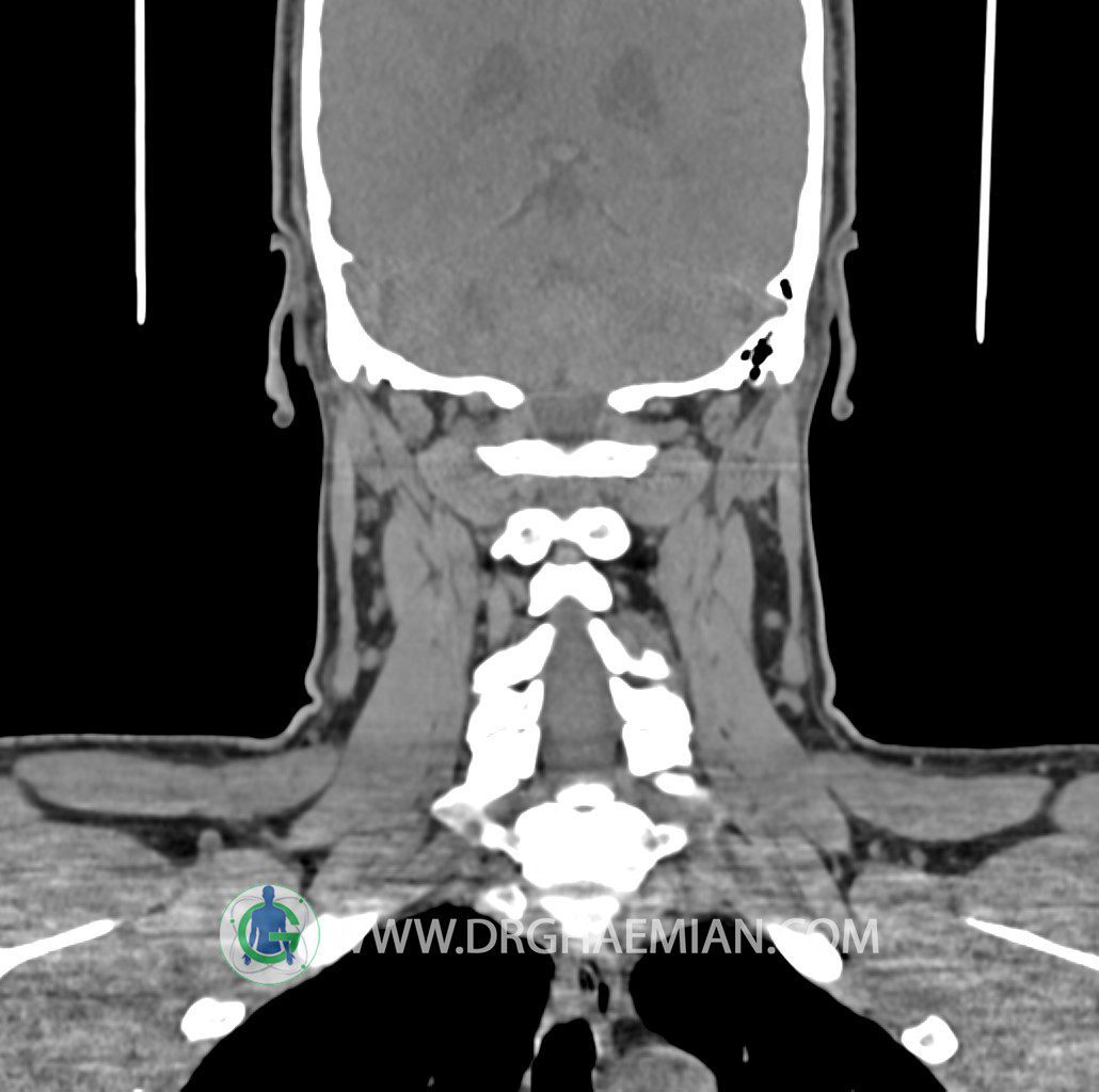 سی تی اسکن گردن یک روش تصویربرداری است که با استفاده از تشعات ایکس تصاویری با جزییات از ناحیه گردن ایجاد میکند. در این کیس لنفادنوپاتی گردن و تعدادی توده در پاروتید بیمار مشاهده می شود.