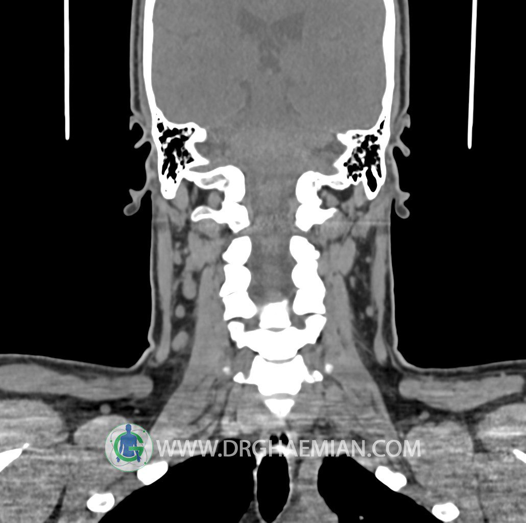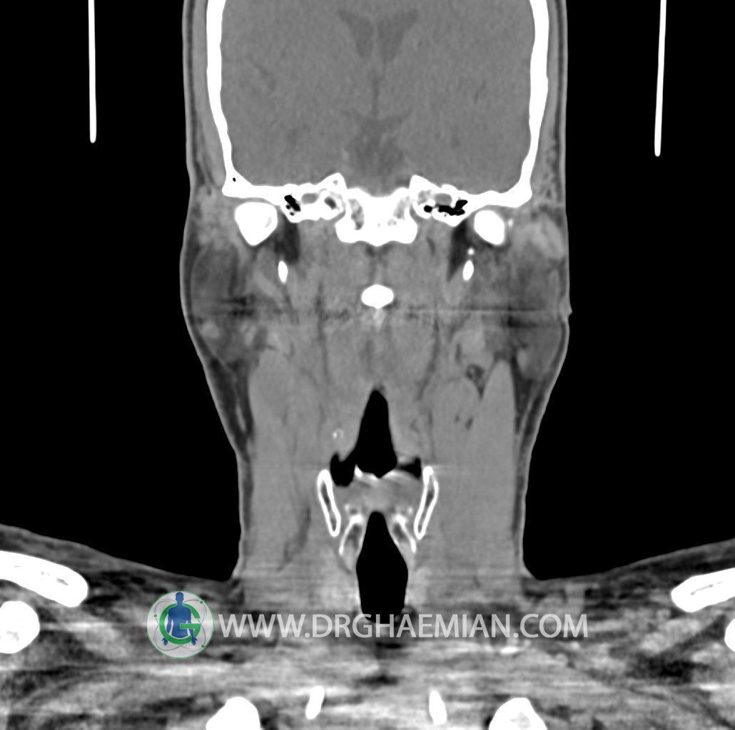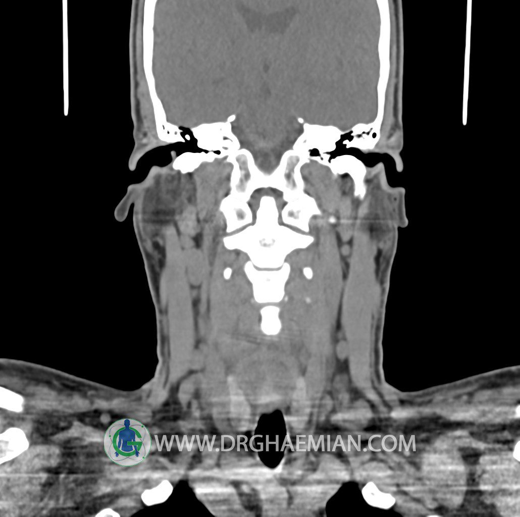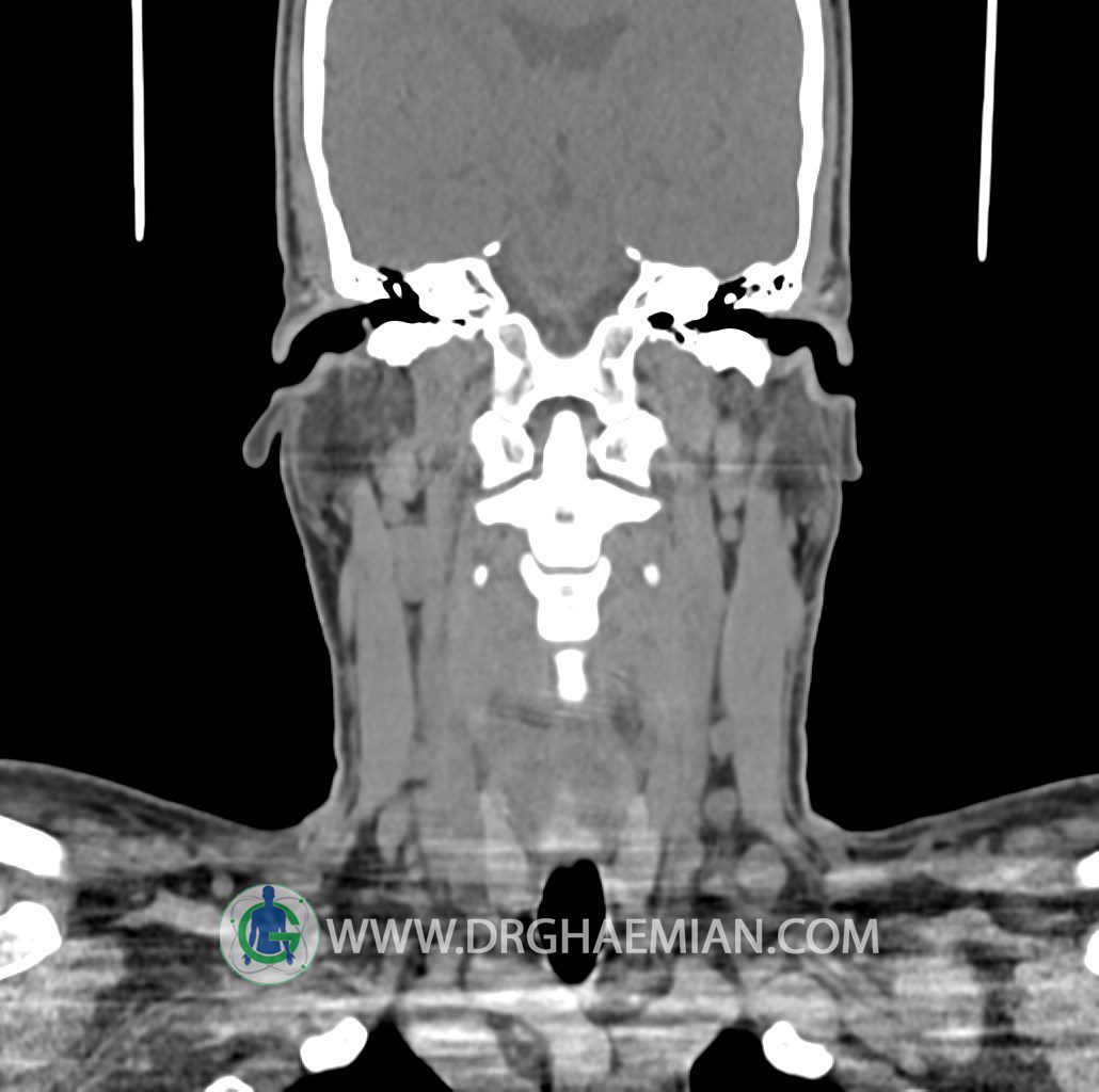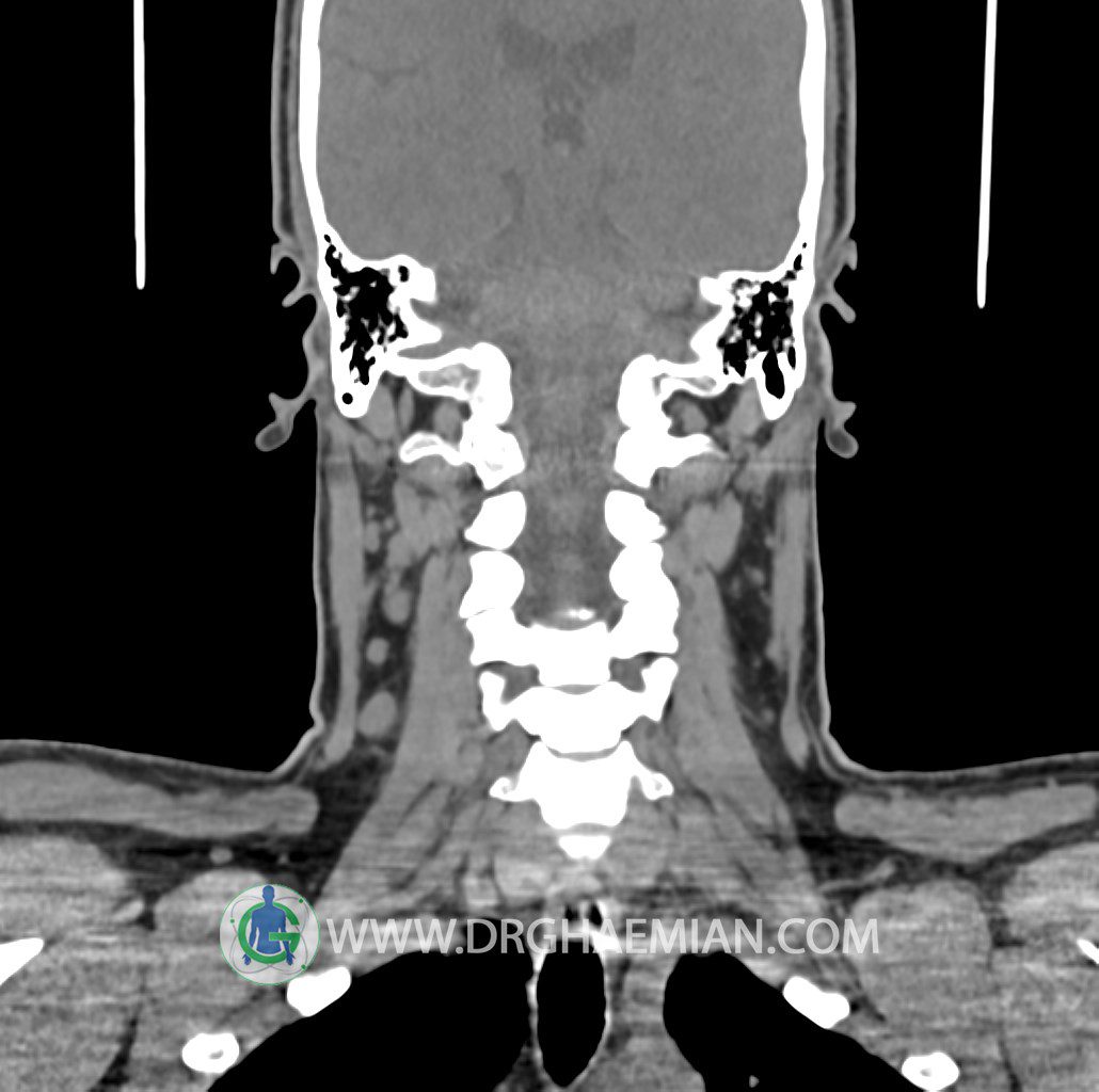 سی تی اسکن گردن یک روش تصویربرداری است که با استفاده از تشعات ایکس تصاویری با جزییات از ناحیه گردن ایجاد میکند. در این کیس لنفادنوپاتی گردن و تعدادی توده در پاروتید بیمار مشاهده می شود.