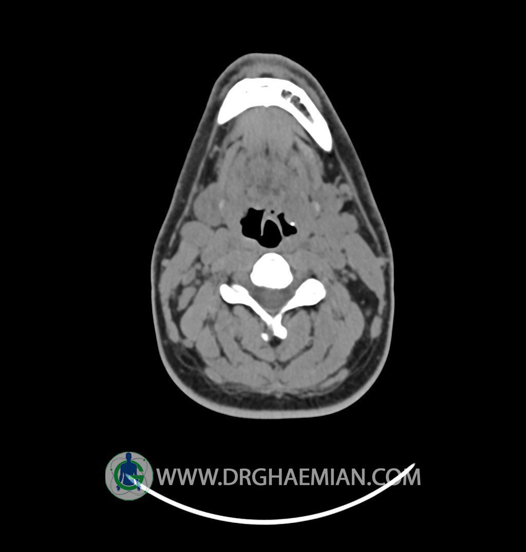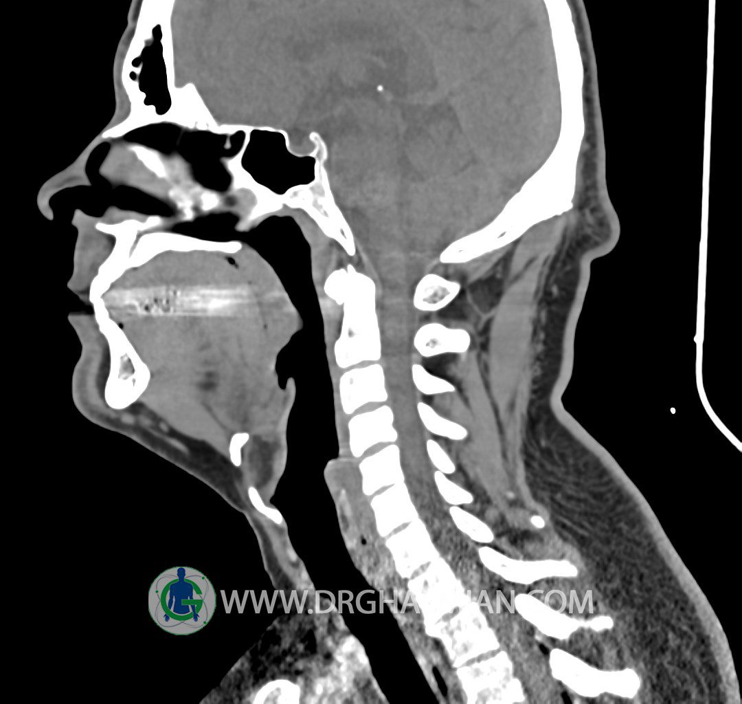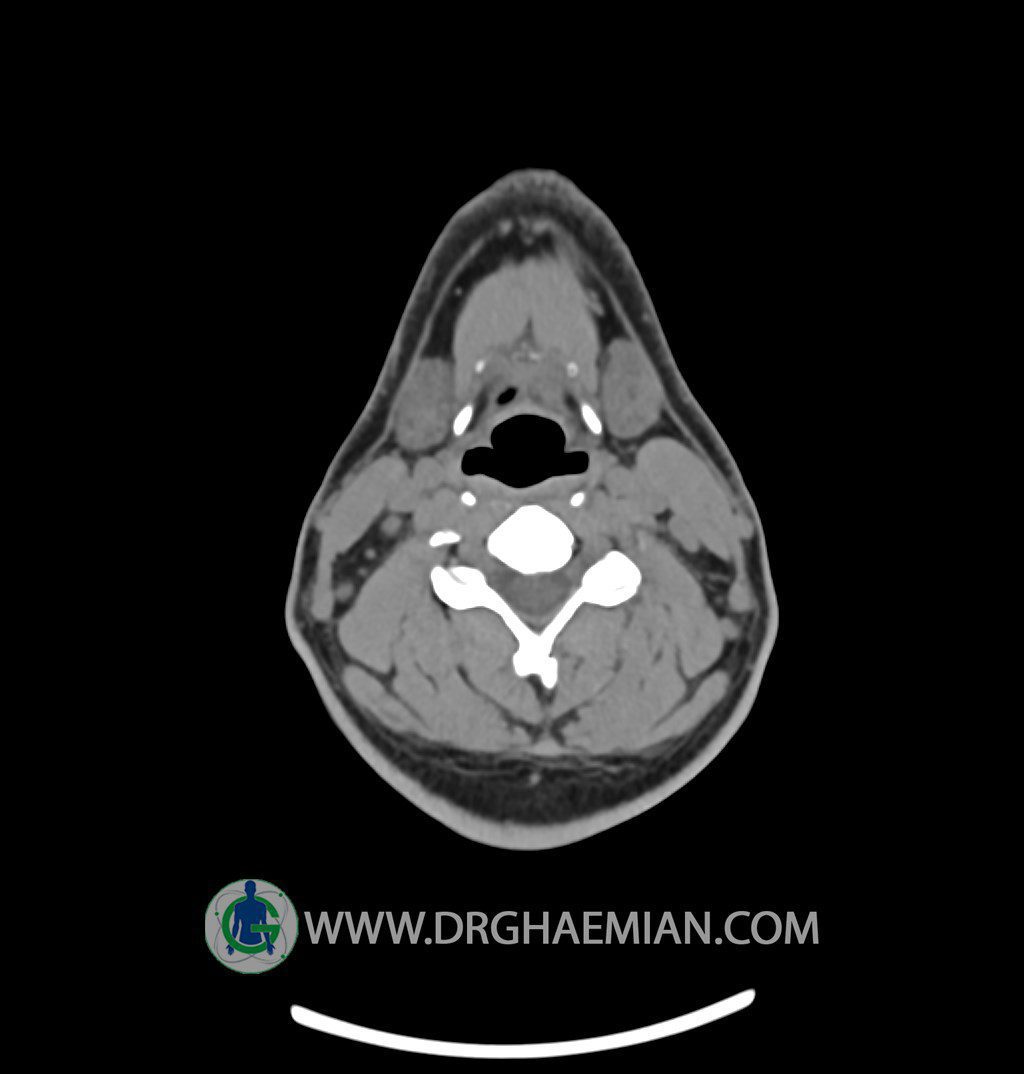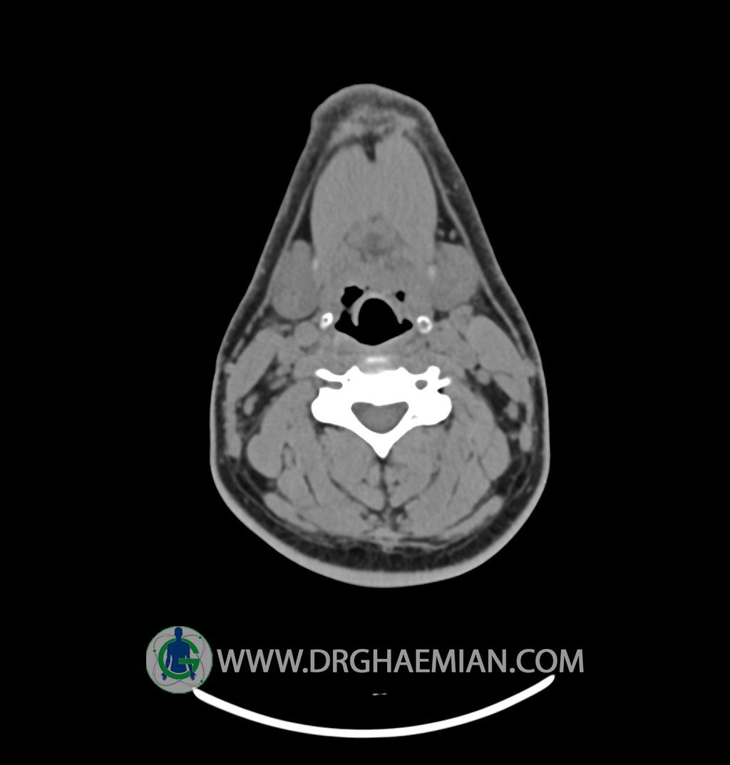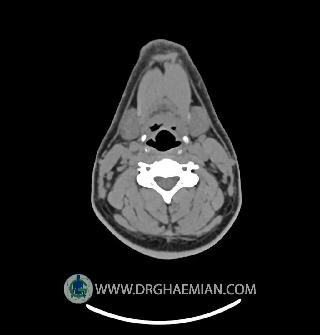 سی تی اسکن گردن یک روش تصویربرداری است که با استفاده از تشعات ایکس تصاویری با جزییات از ناحیه گردن ایجاد میکند. در این کیس لنفادنوپاتی گردن و تعدادی توده در پاروتید بیمار مشاهده می شود.