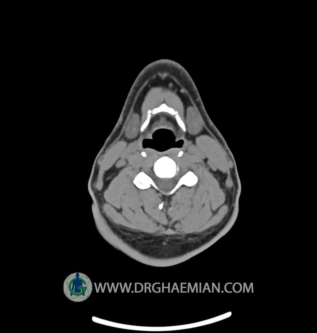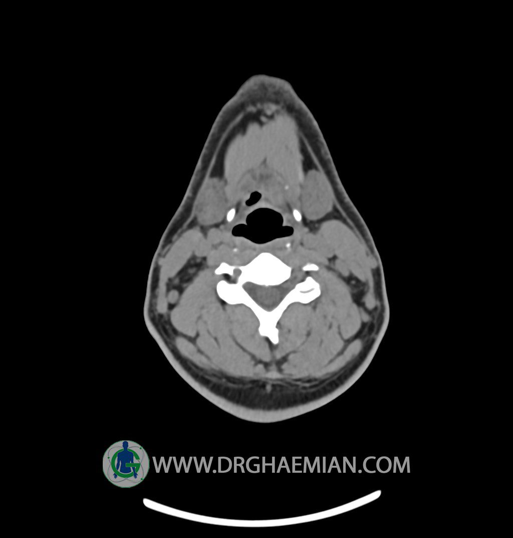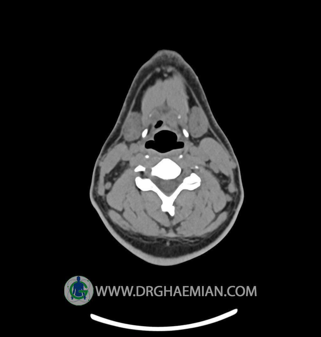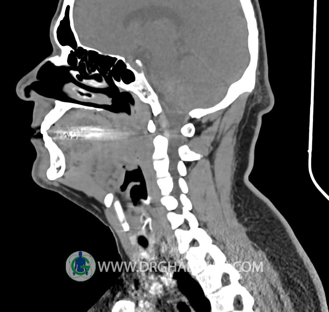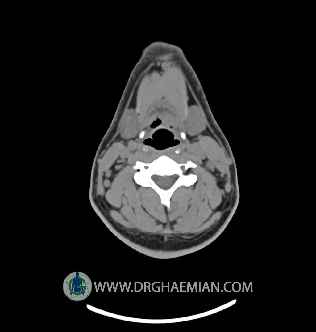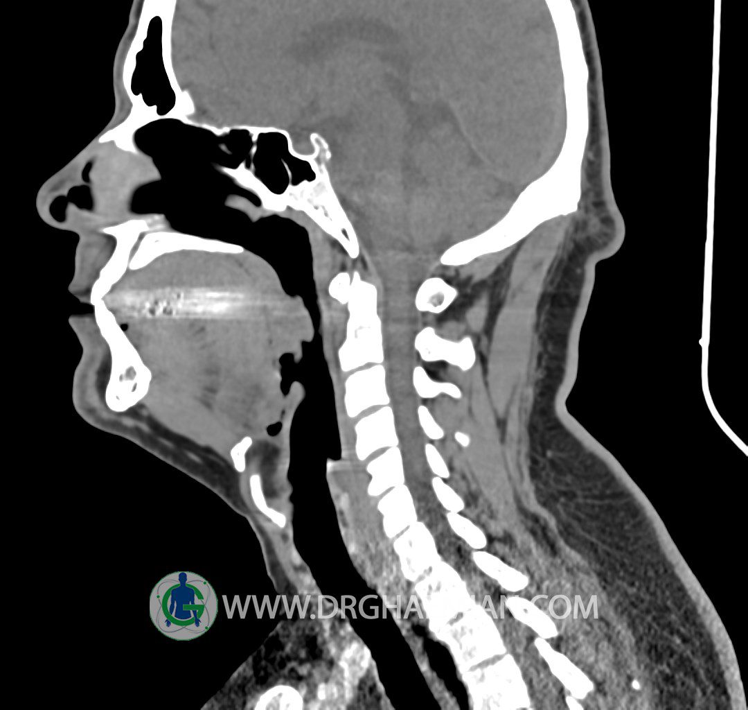 سی تی اسکن گردن یک روش تصویربرداری است که با استفاده از تشعات ایکس تصاویری با جزییات از ناحیه گردن ایجاد میکند. در این کیس لنفادنوپاتی گردن و تعدادی توده در پاروتید بیمار مشاهده می شود.