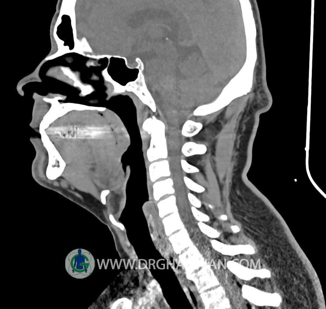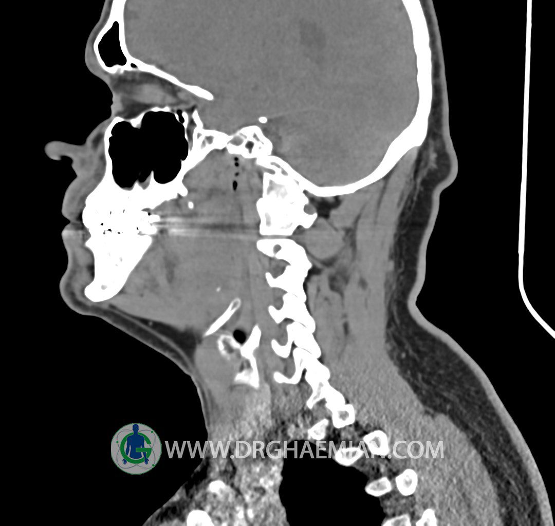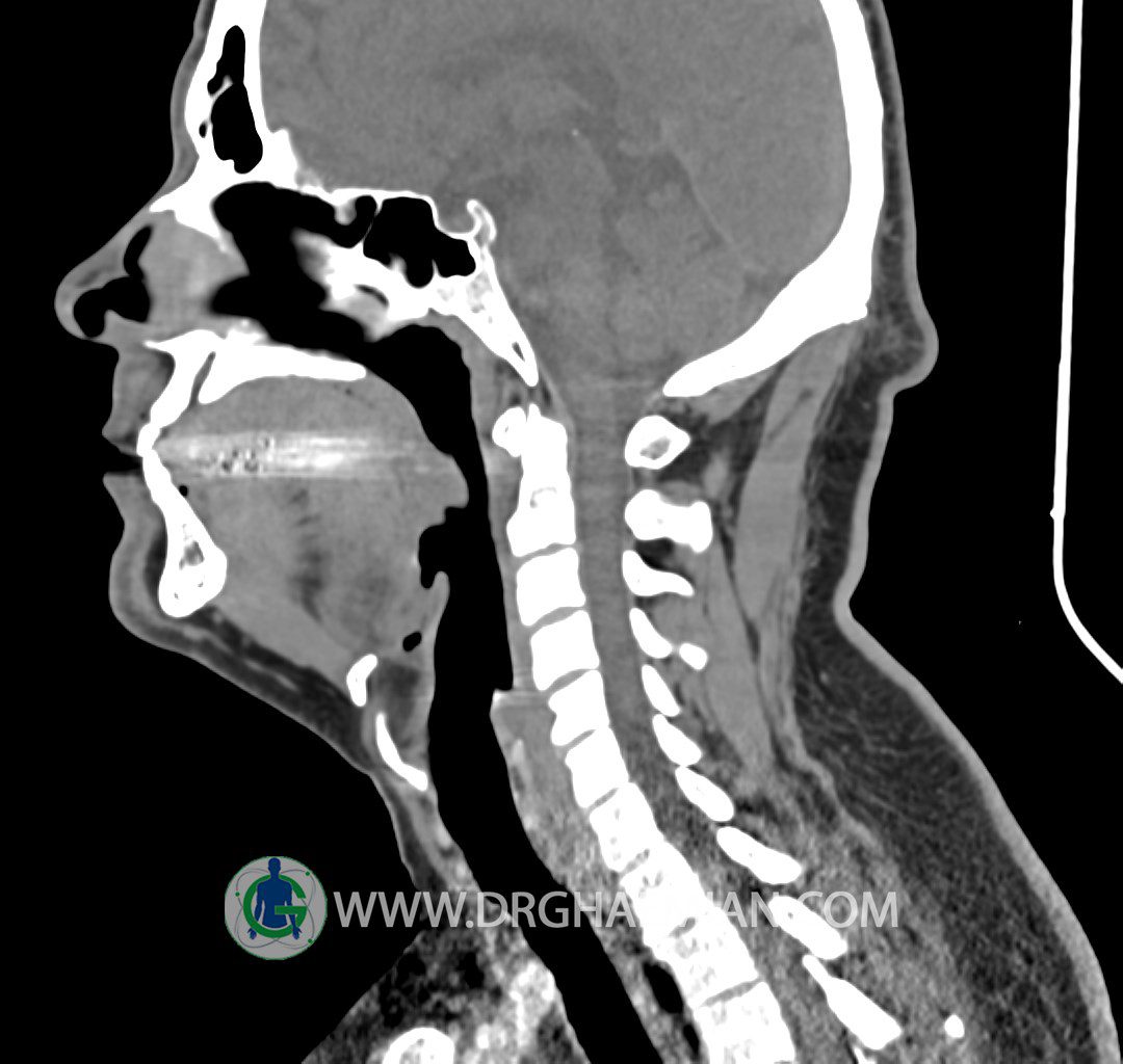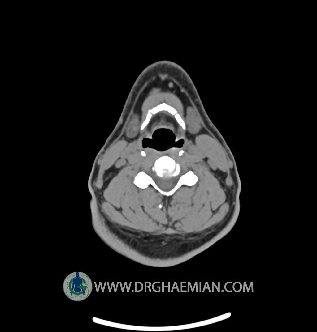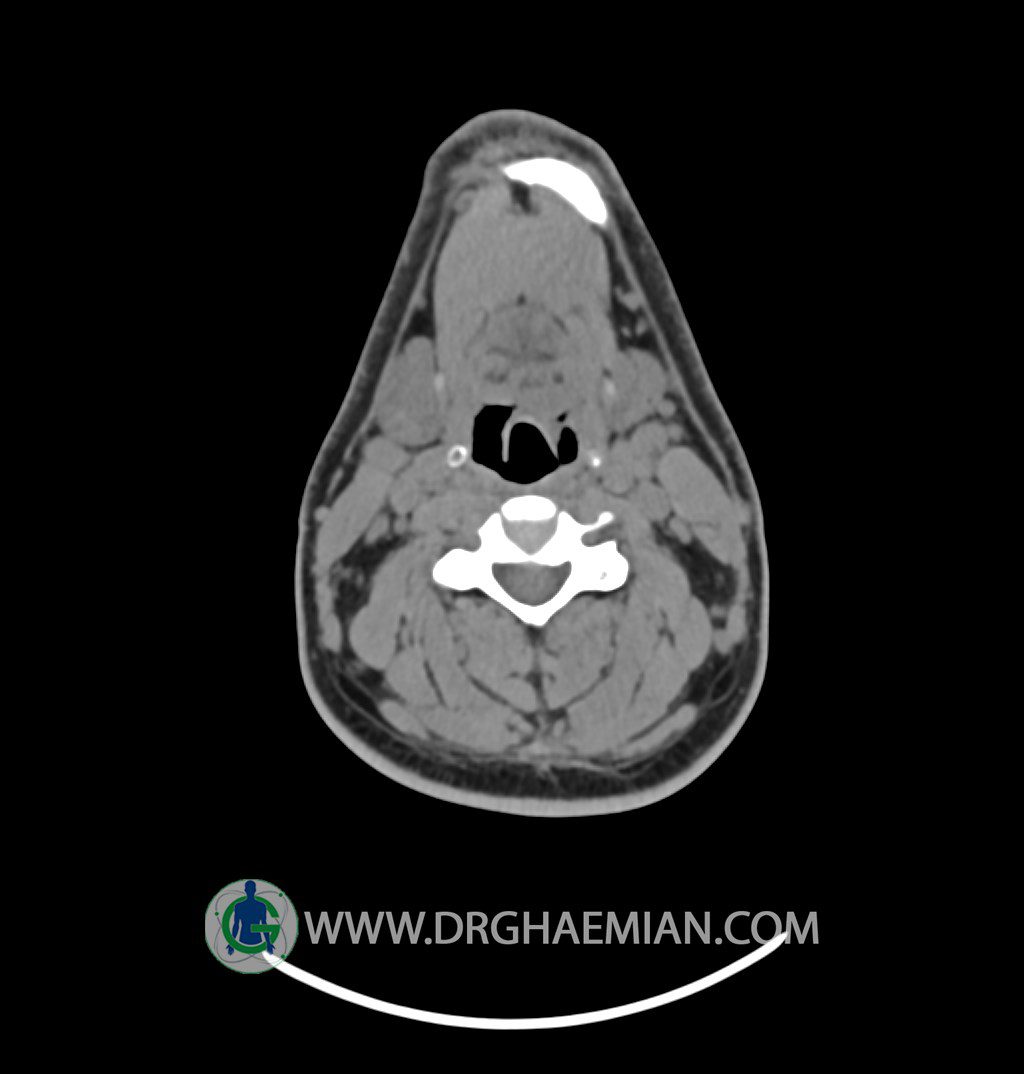 سی تی اسکن گردن یک روش تصویربرداری است که با استفاده از تشعات ایکس تصاویری با جزییات از ناحیه گردن ایجاد میکند. در این کیس لنفادنوپاتی گردن و تعدادی توده در پاروتید بیمار مشاهده می شود.