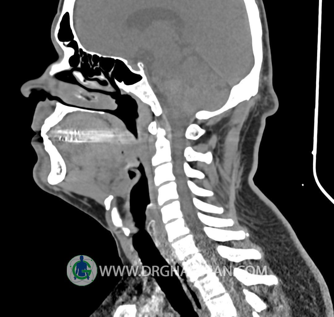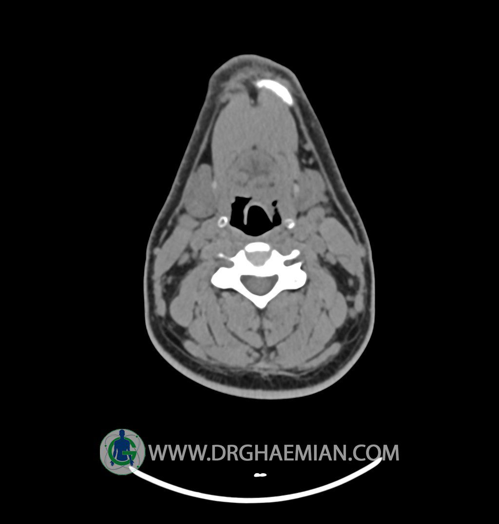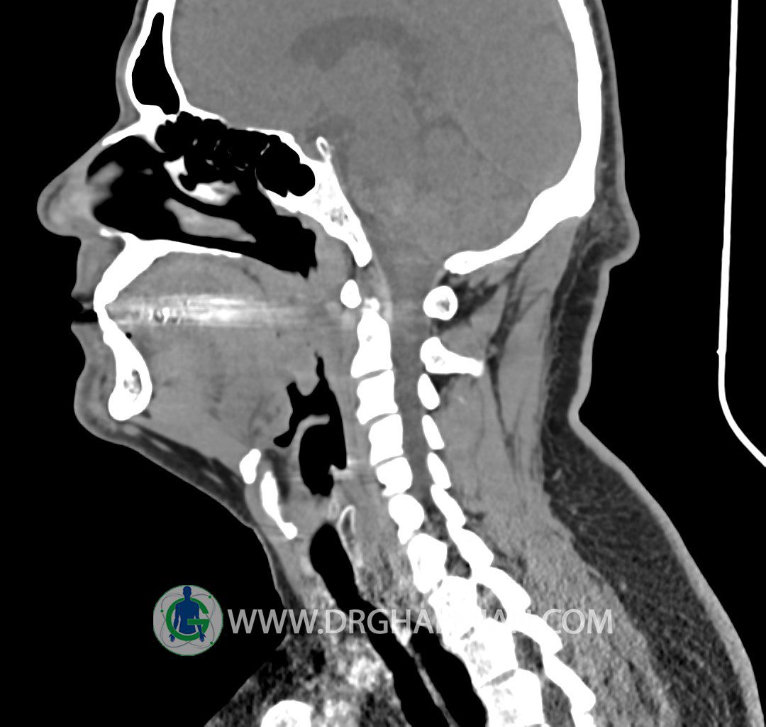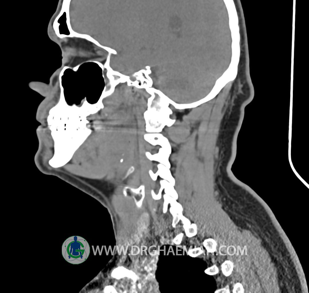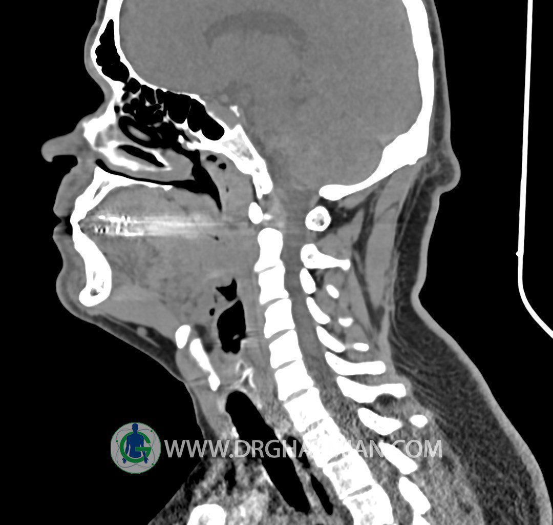 سی تی اسکن گردن یک روش تصویربرداری است که با استفاده از تشعات ایکس تصاویری با جزییات از ناحیه گردن ایجاد میکند. در این کیس لنفادنوپاتی گردن و تعدادی توده در پاروتید بیمار مشاهده می شود.