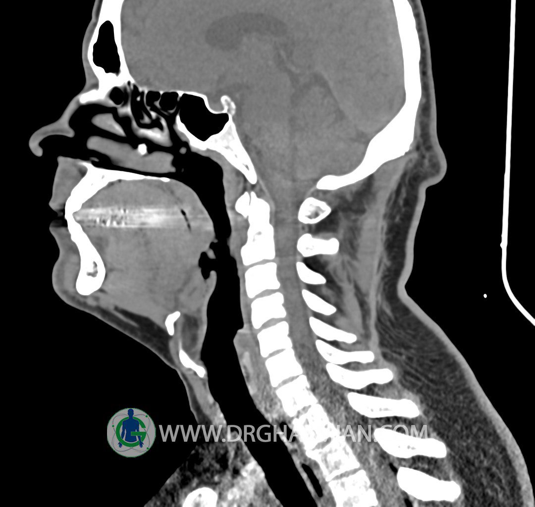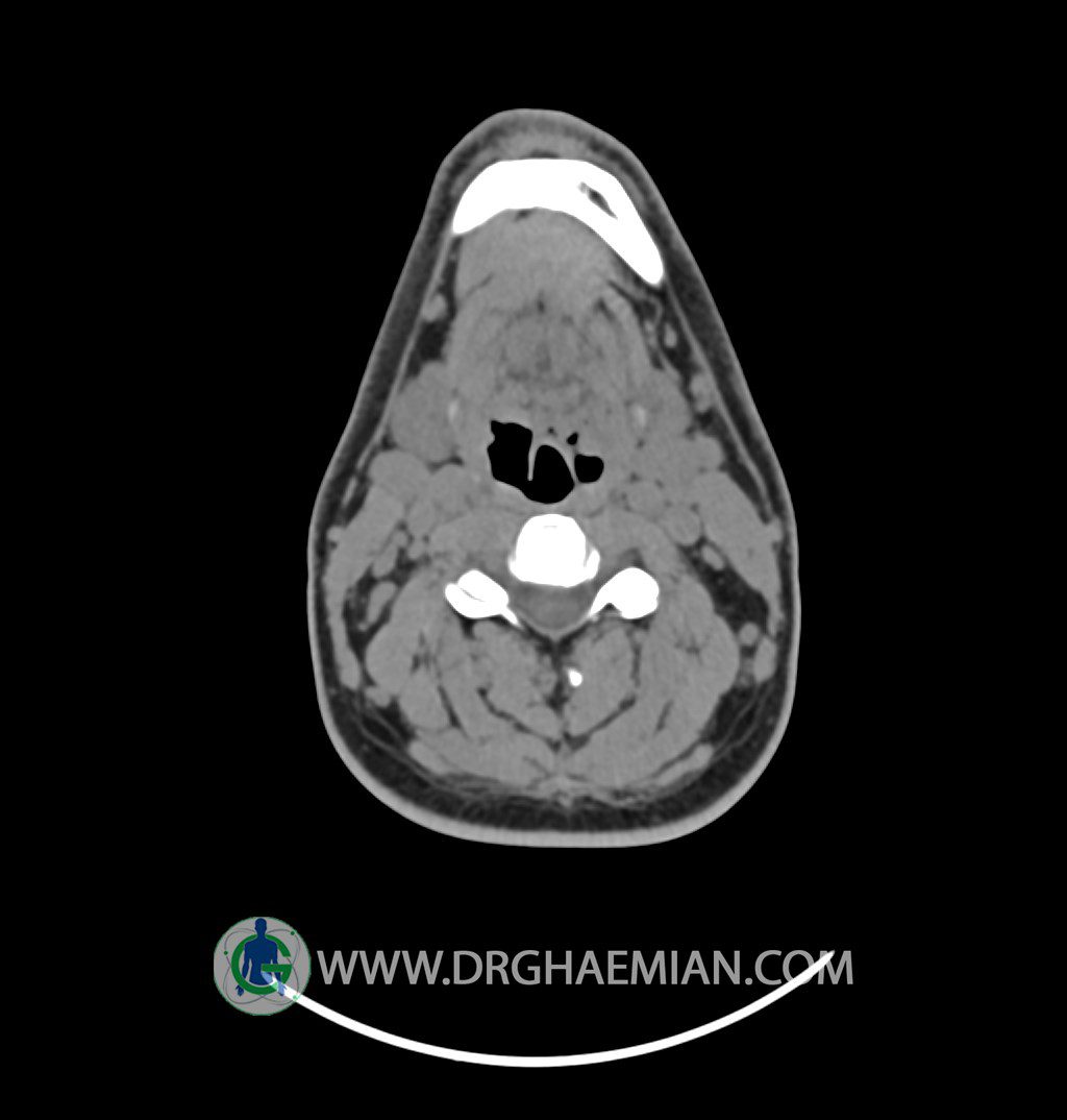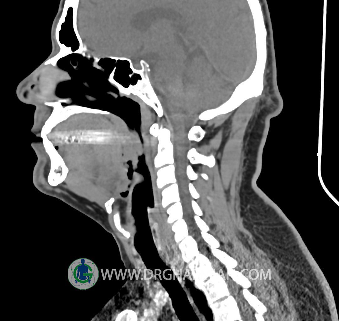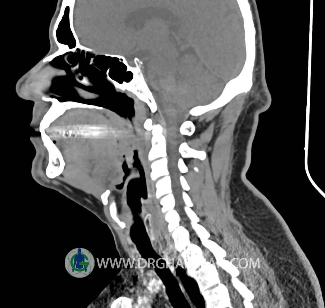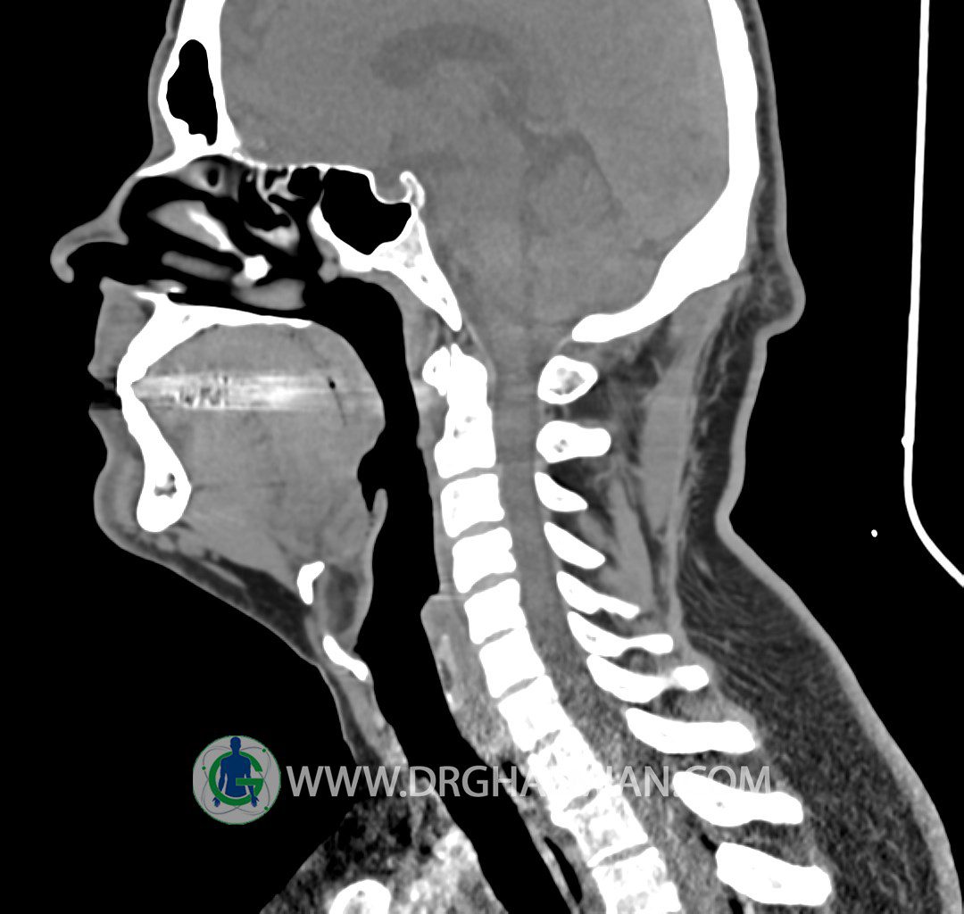 سی تی اسکن گردن یک روش تصویربرداری است که با استفاده از تشعات ایکس تصاویری با جزییات از ناحیه گردن ایجاد میکند. در این کیس لنفادنوپاتی گردن و تعدادی توده در پاروتید بیمار مشاهده می شود.