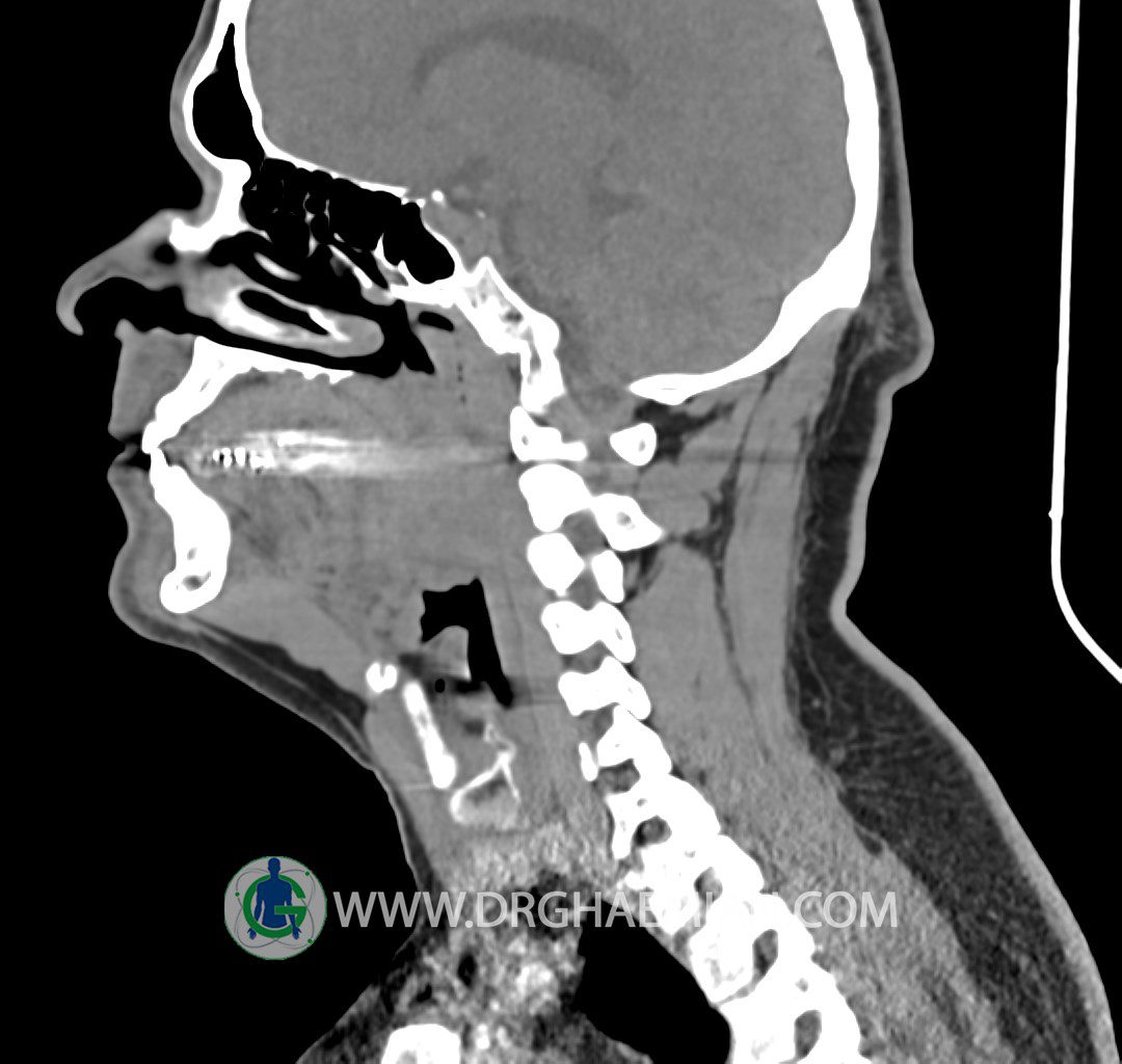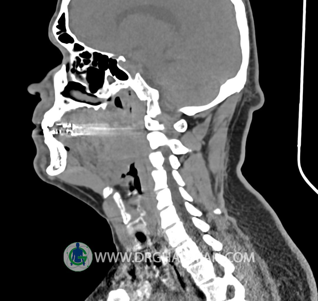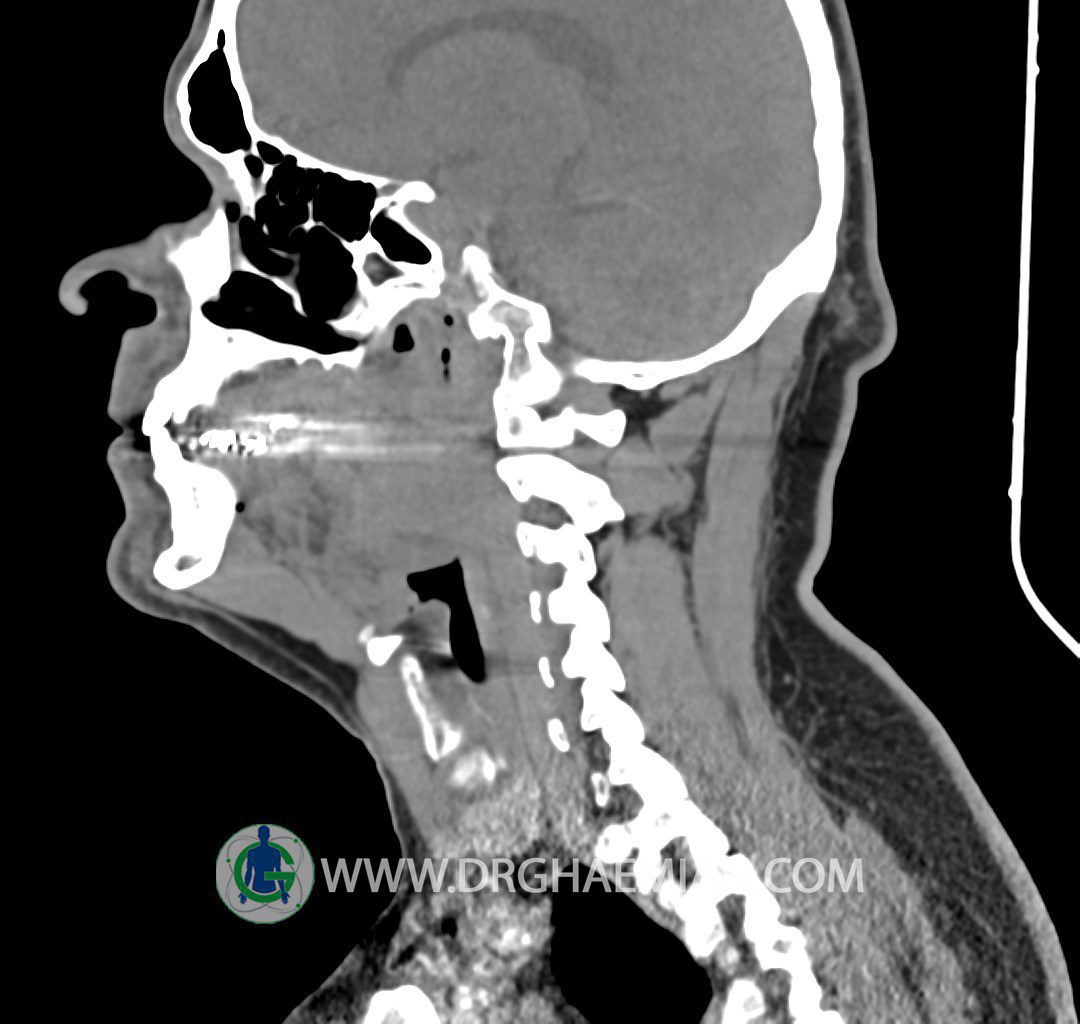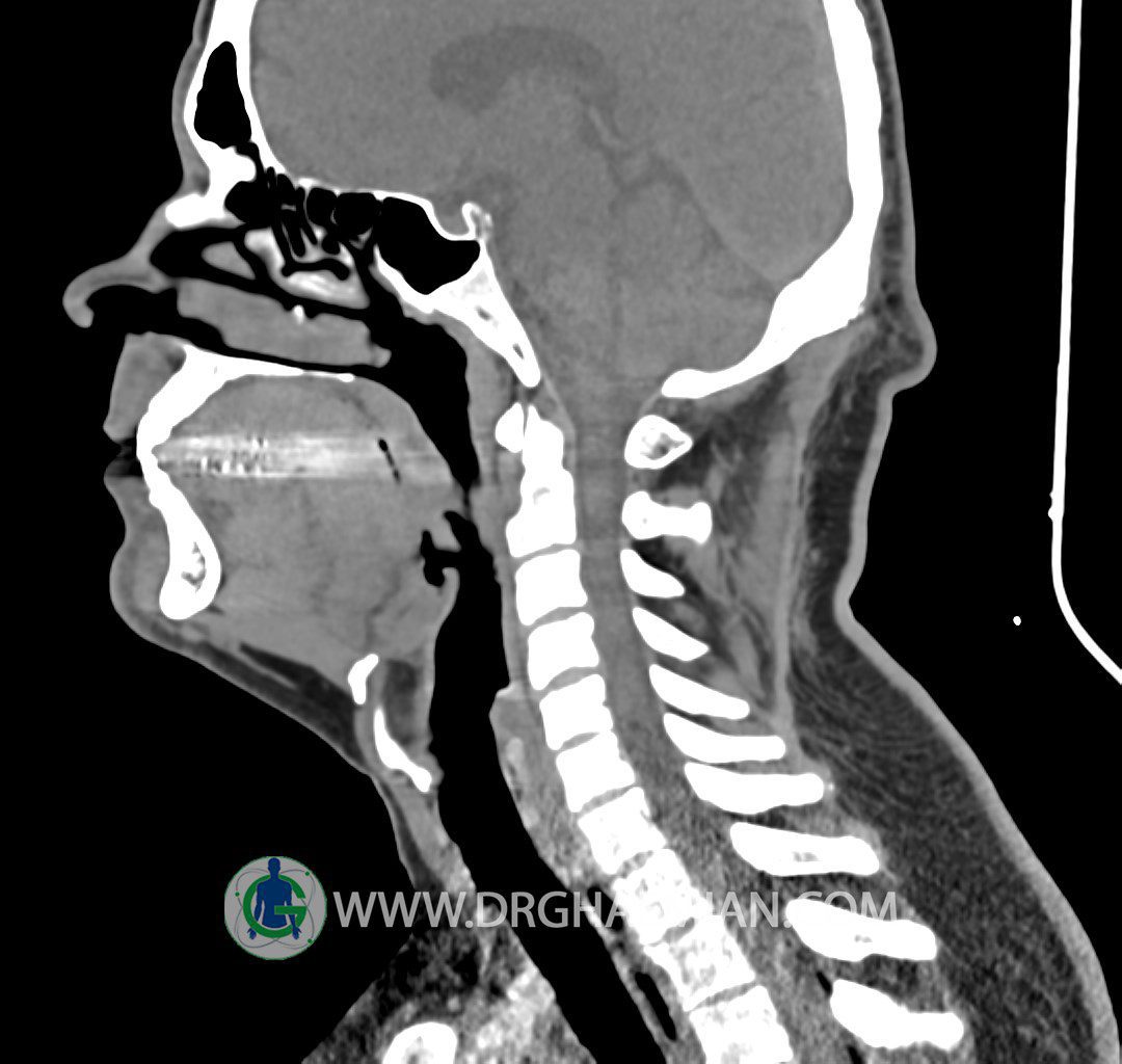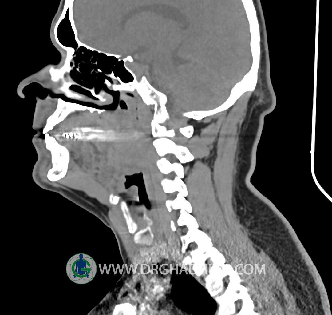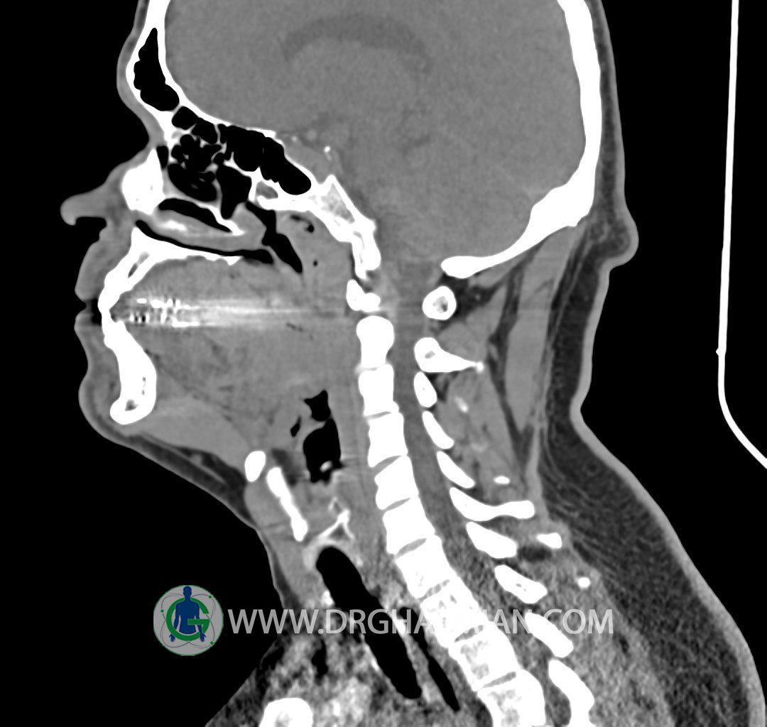 سی تی اسکن گردن یک روش تصویربرداری است که با استفاده از تشعات ایکس تصاویری با جزییات از ناحیه گردن ایجاد میکند. در این کیس لنفادنوپاتی گردن و تعدادی توده در پاروتید بیمار مشاهده می شود.