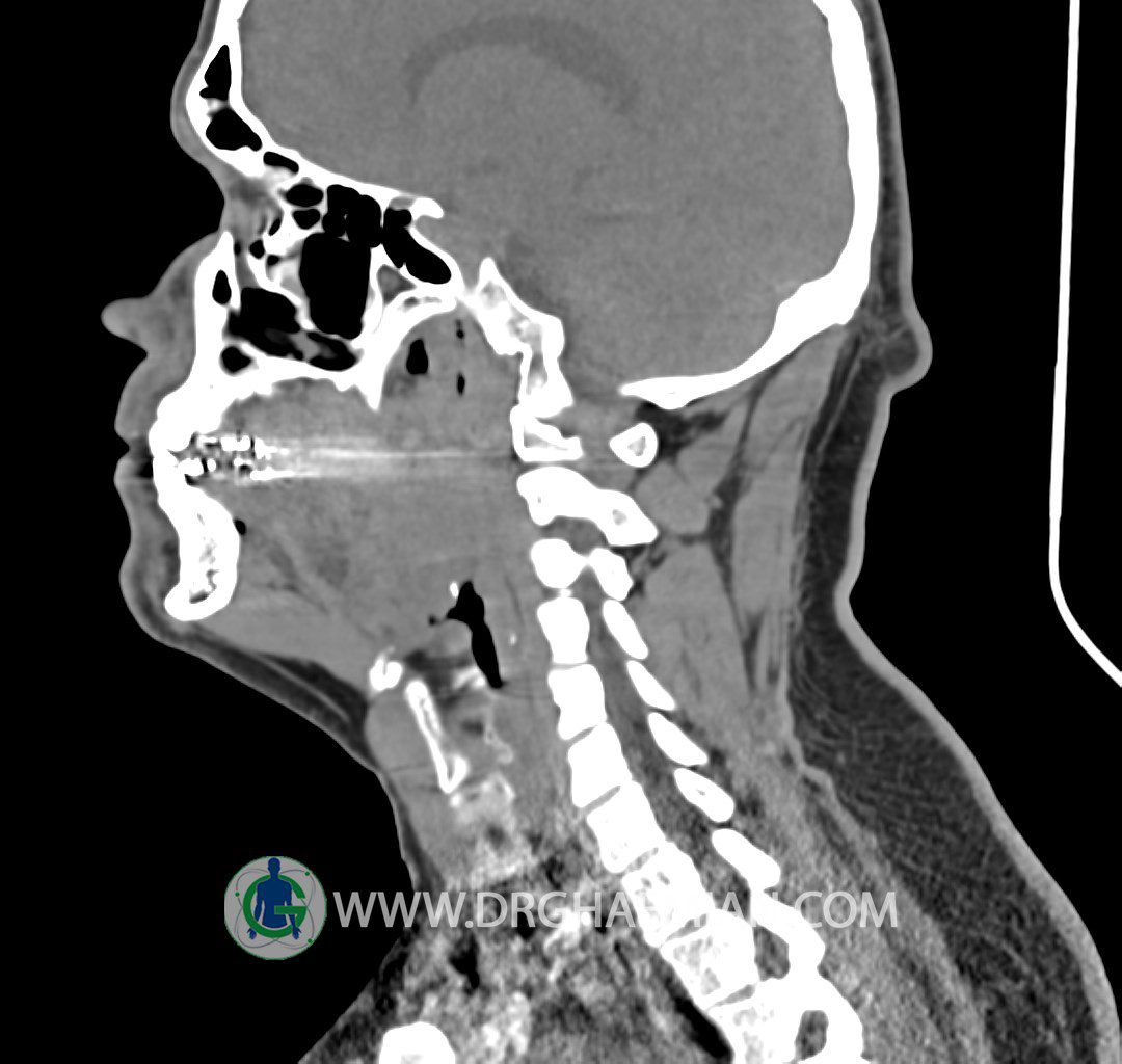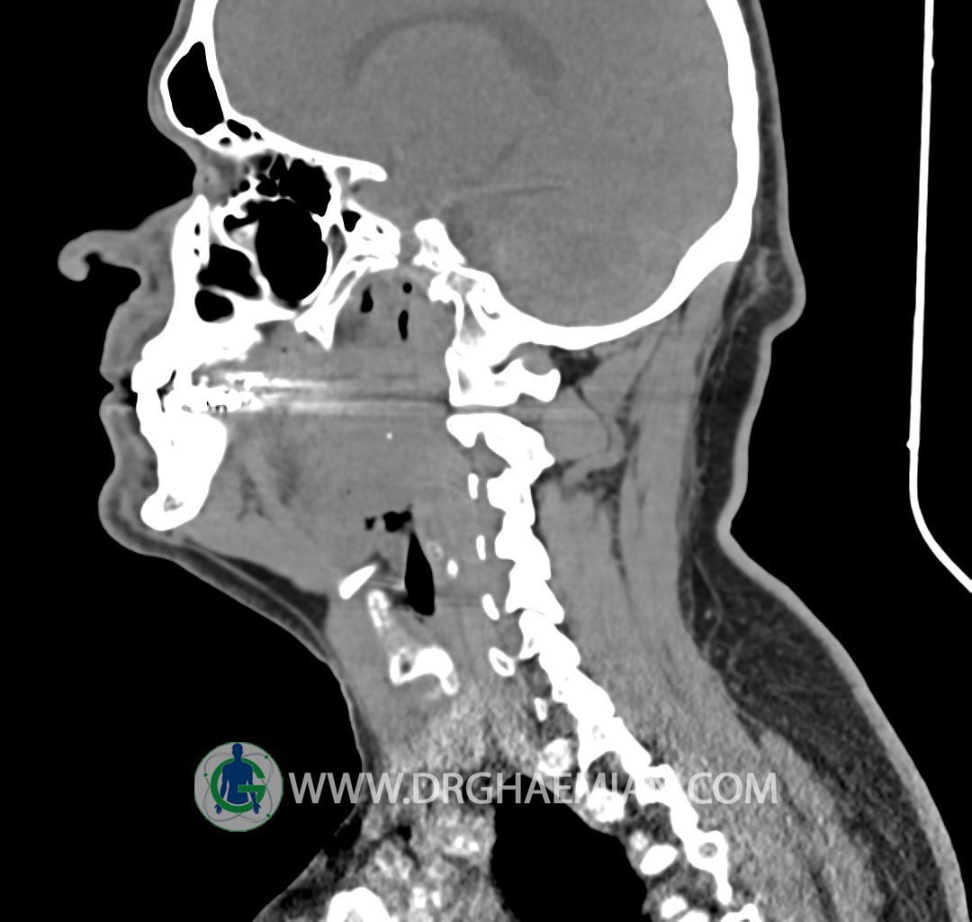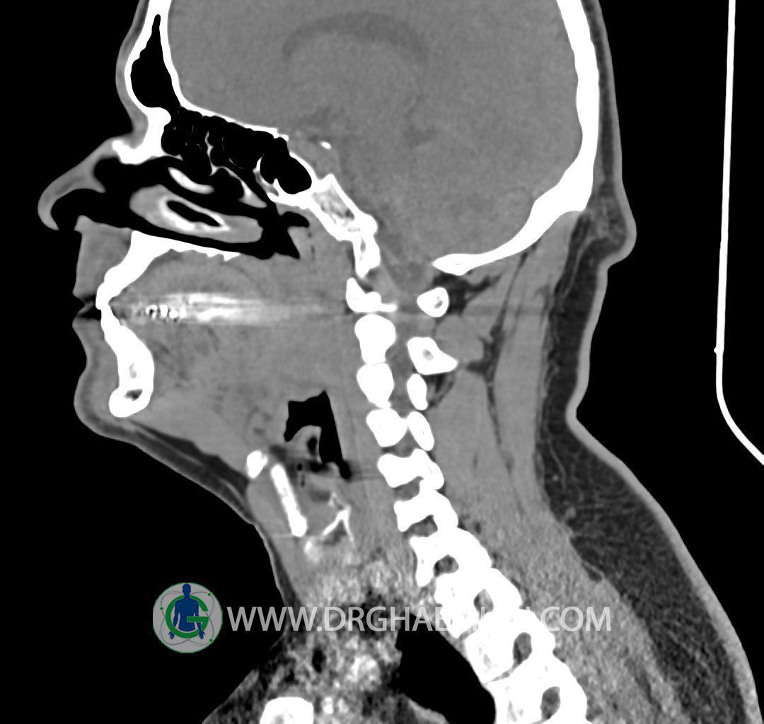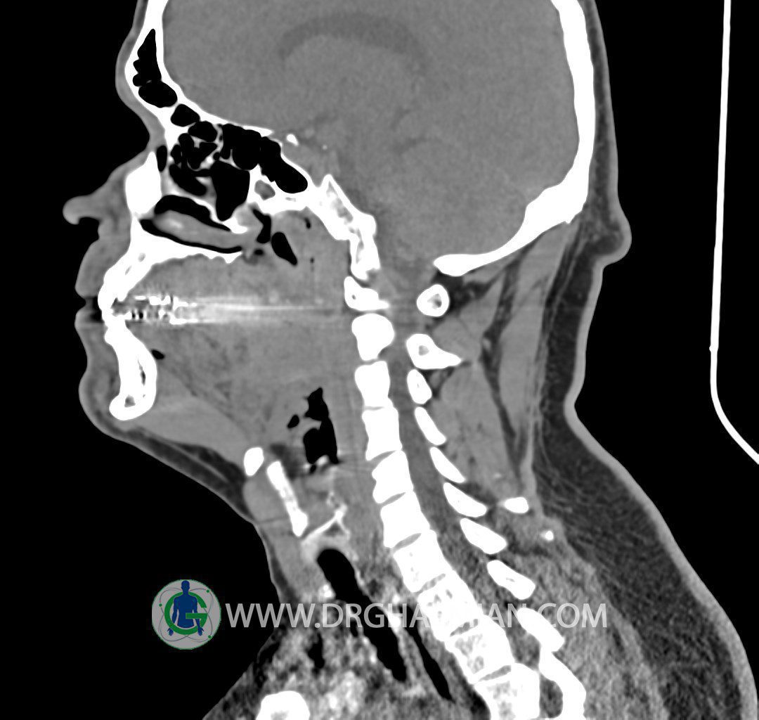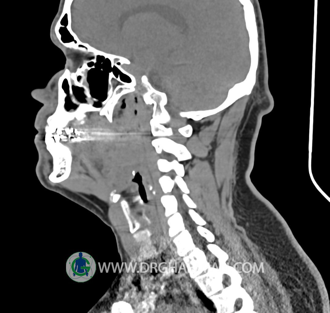 سی تی اسکن گردن یک روش تصویربرداری است که با استفاده از تشعات ایکس تصاویری با جزییات از ناحیه گردن ایجاد میکند. در این کیس لنفادنوپاتی گردن و تعدادی توده در پاروتید بیمار مشاهده می شود.