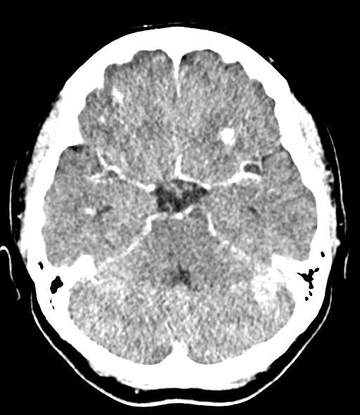 – توده هاي ايزودنس فراوان به قطر 10-15 mm همراه با ادم vasogenic در اطراف آن ها پراکنده
