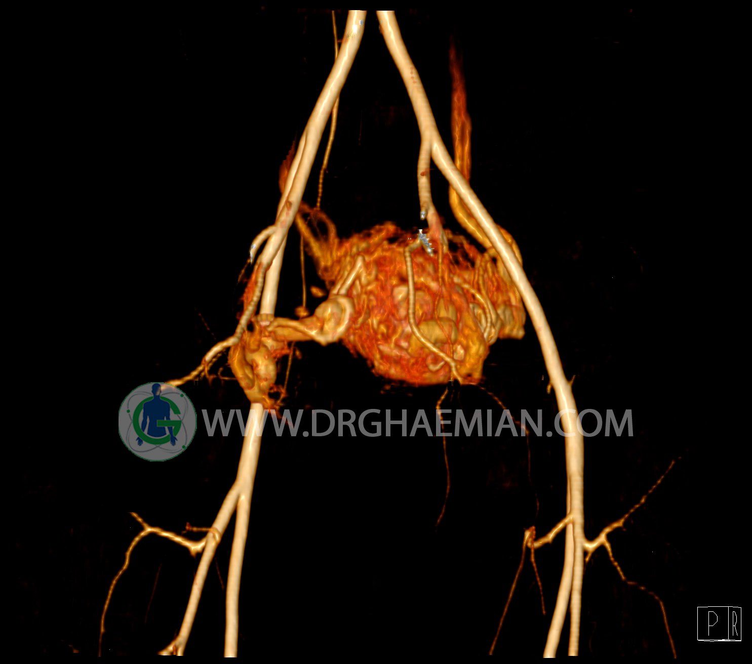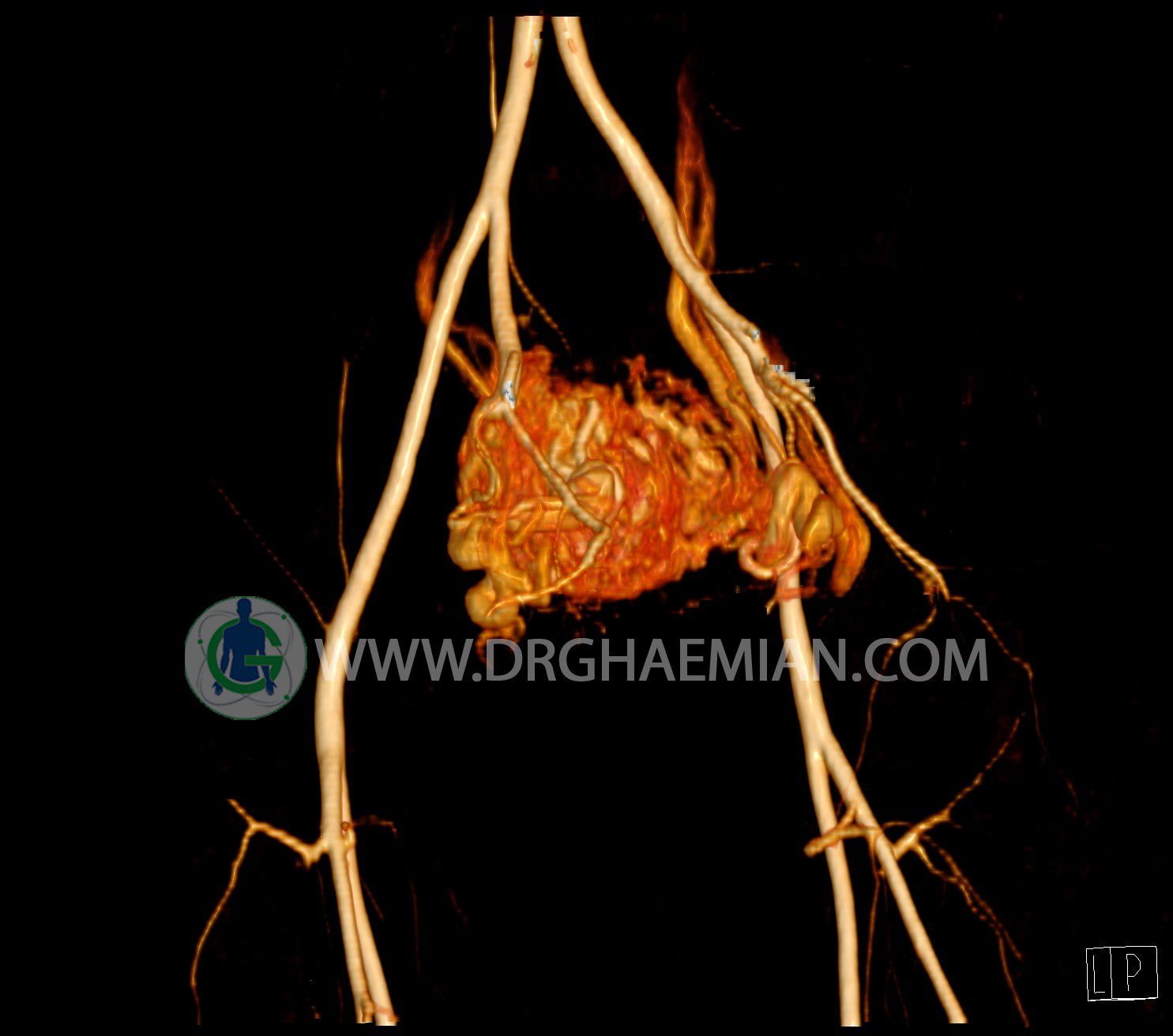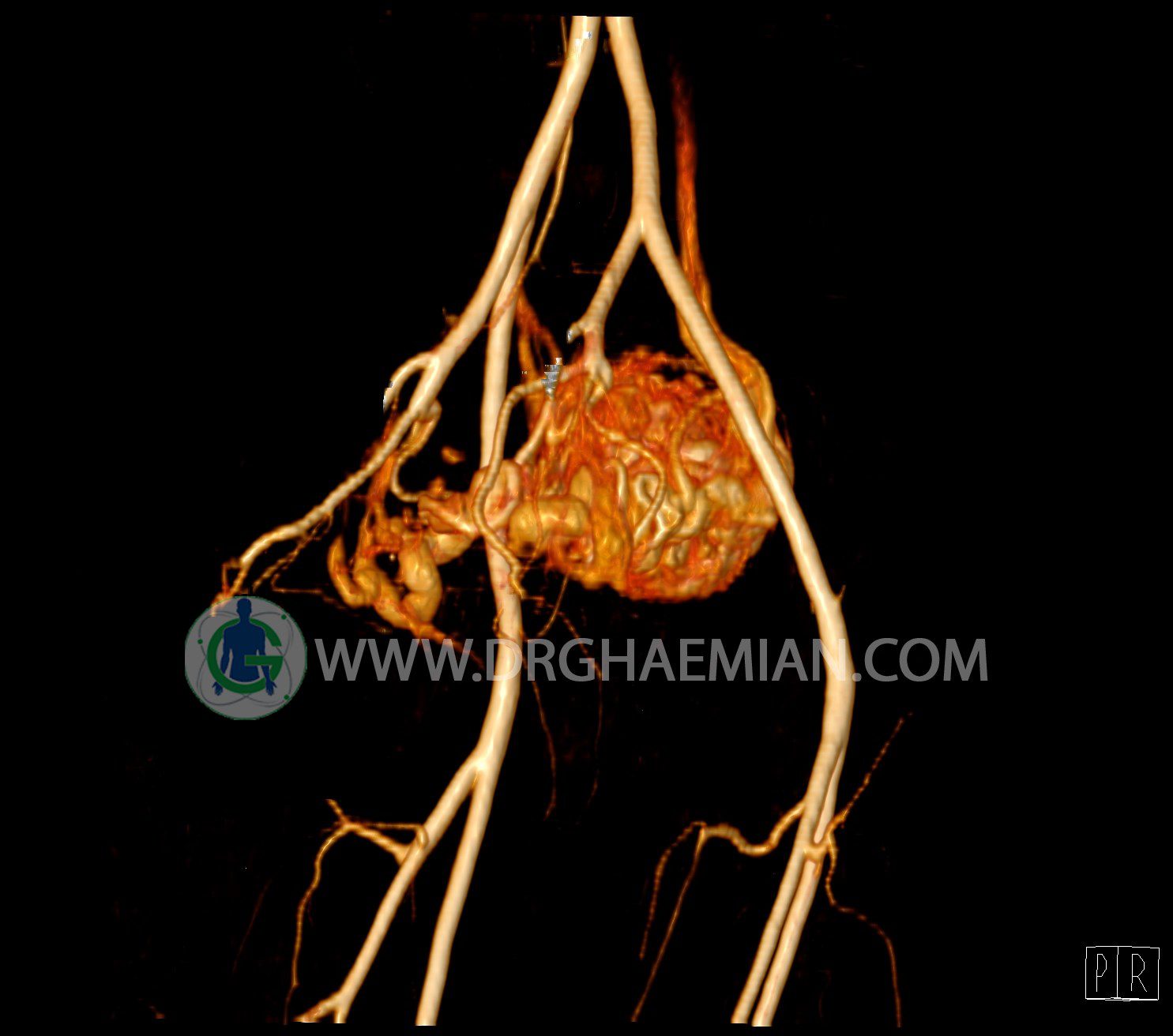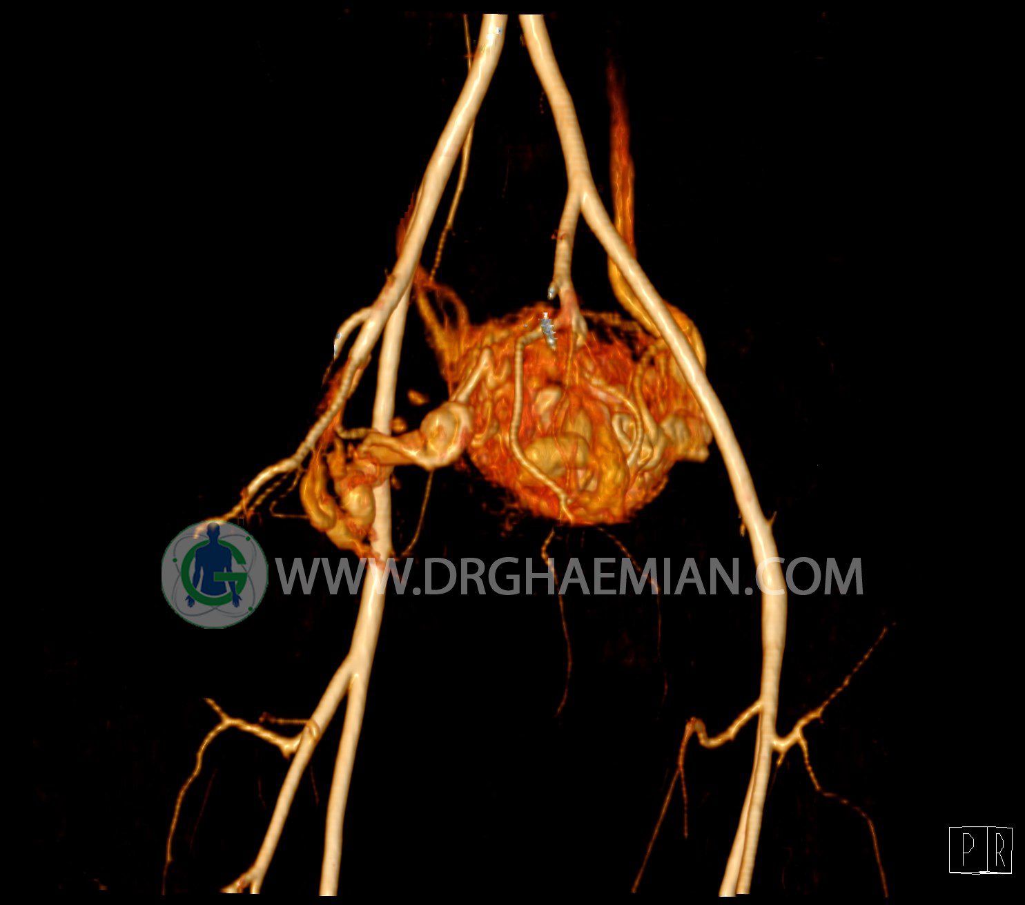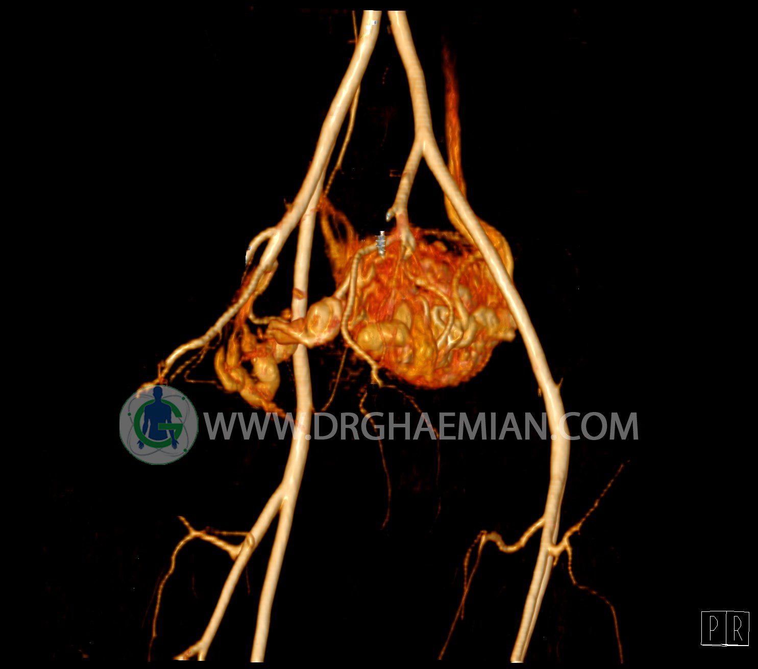 سی تی آنژیوگرافی (CTA) از تزریق ماده حاجب (کنتراست) به داخل عروق خونی شما و سی تی اسکن برای کمک به تشخیص و ارزیابی بیماری عروق خونی یا عارضه هایی مرتبط مانند آنوریسم ها یا انسداد ها استفاده می کند. در این کیس ناهنجاریهای شریانی وریدی لگن به همراه فیستول مشاهده می شود.