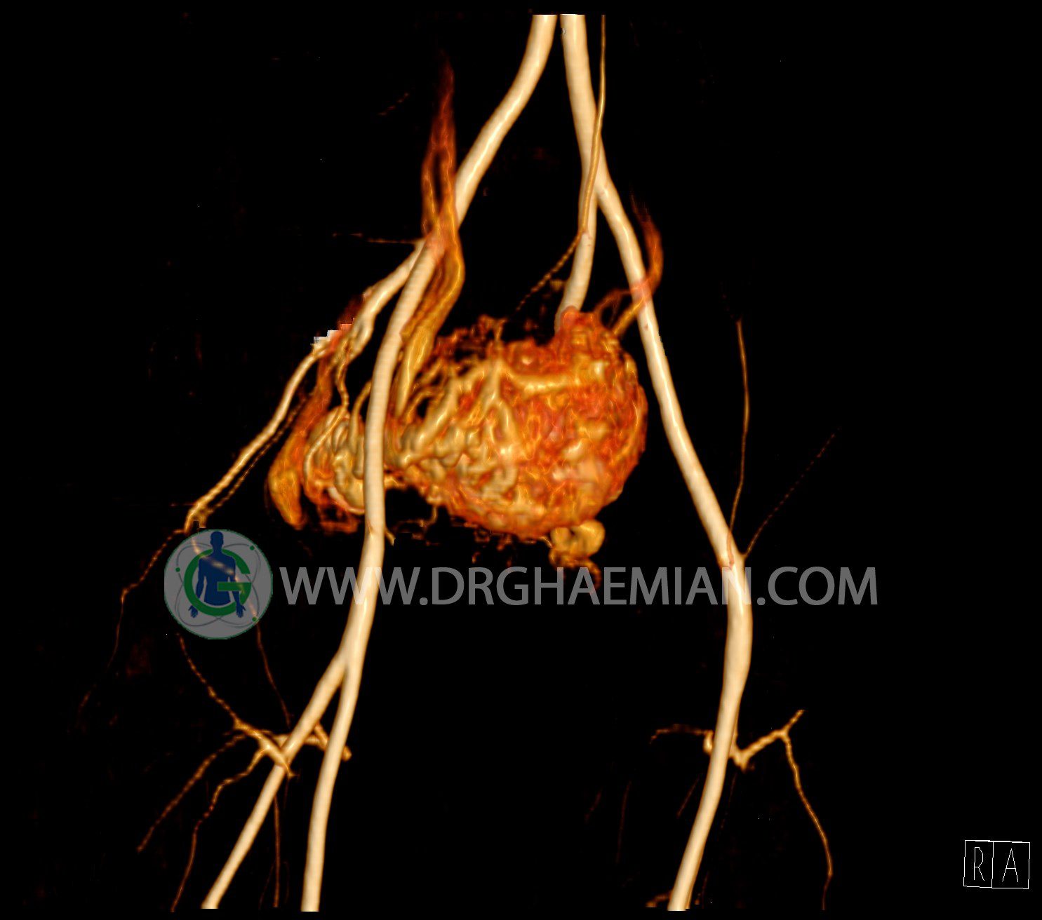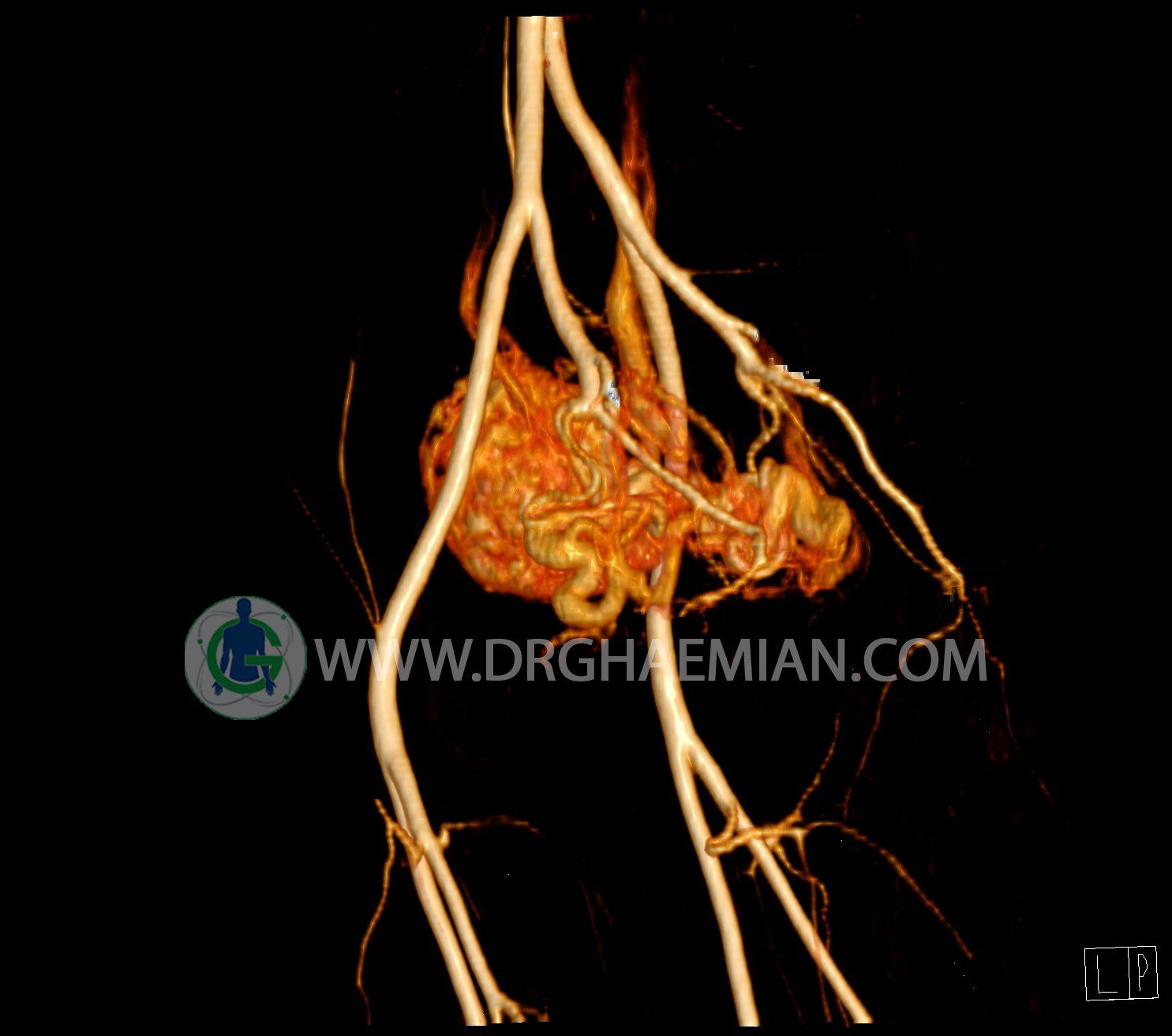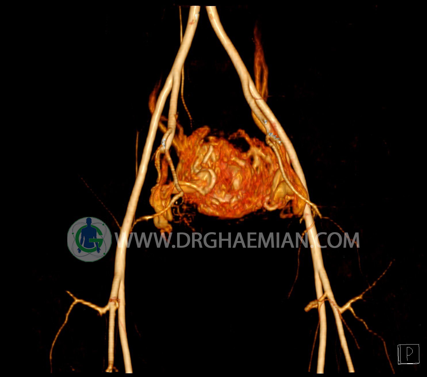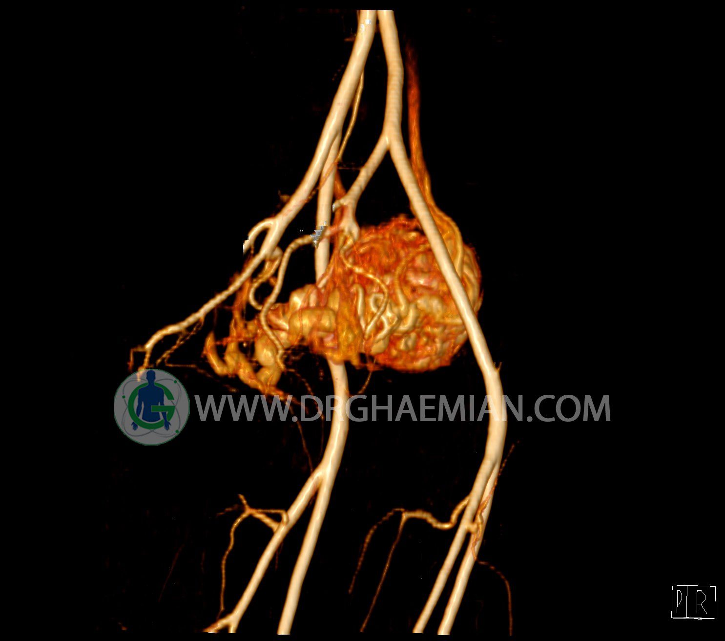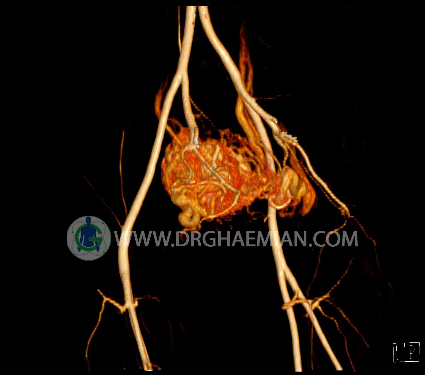 سی تی آنژیوگرافی (CTA) از تزریق ماده حاجب (کنتراست) به داخل عروق خونی شما و سی تی اسکن برای کمک به تشخیص و ارزیابی بیماری عروق خونی یا عارضه هایی مرتبط مانند آنوریسم ها یا انسداد ها استفاده می کند. در این کیس ناهنجاریهای شریانی وریدی لگن به همراه فیستول مشاهده می شود.