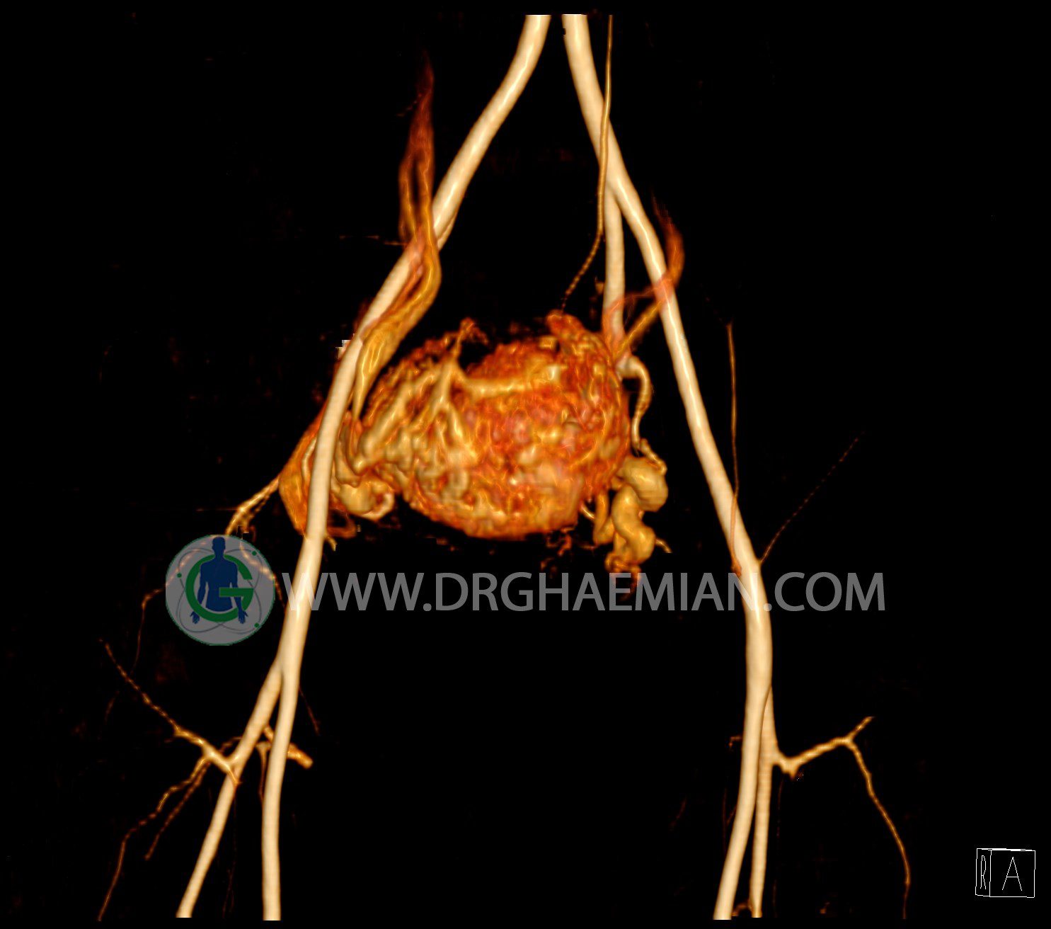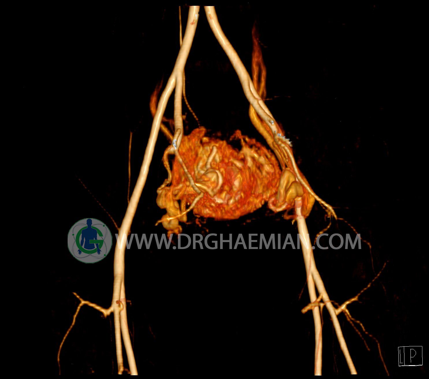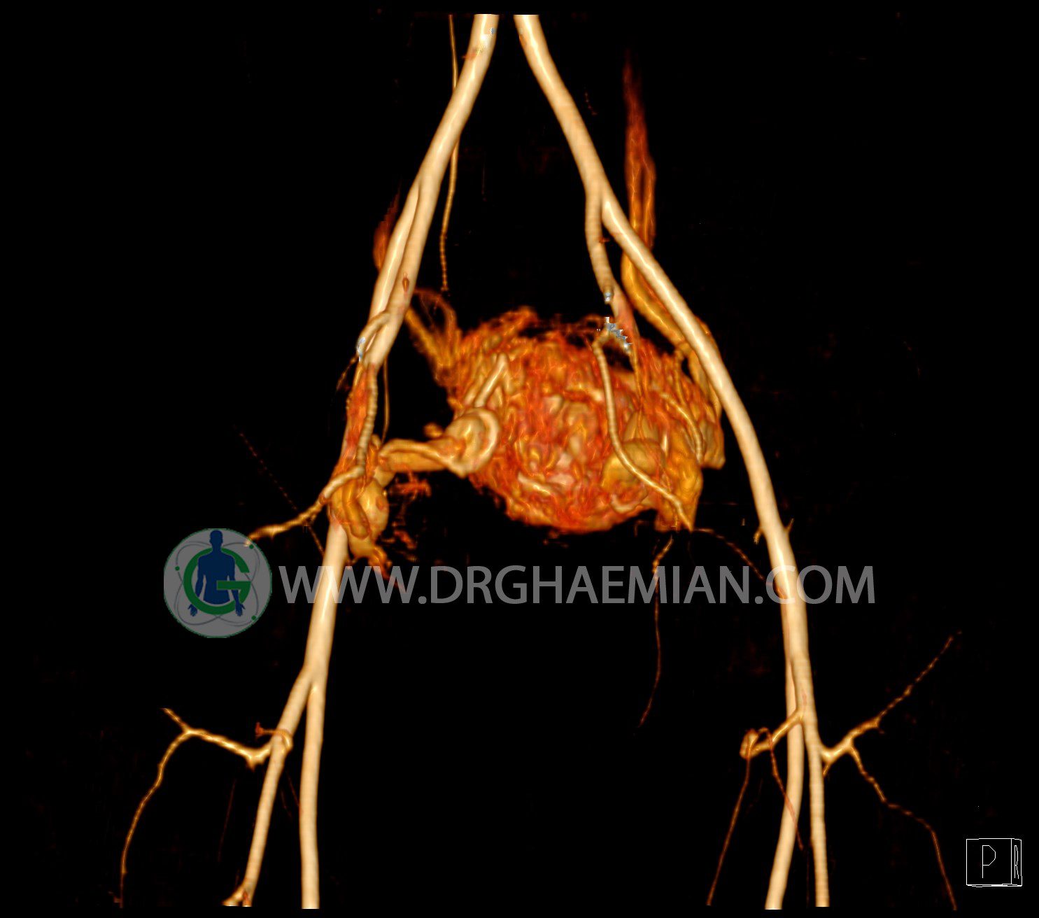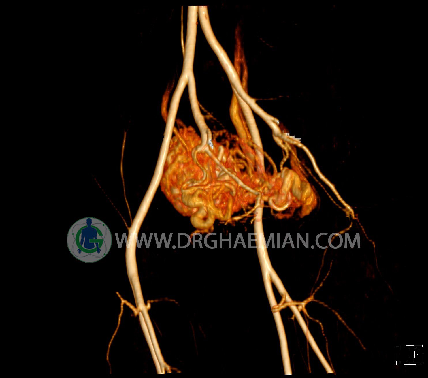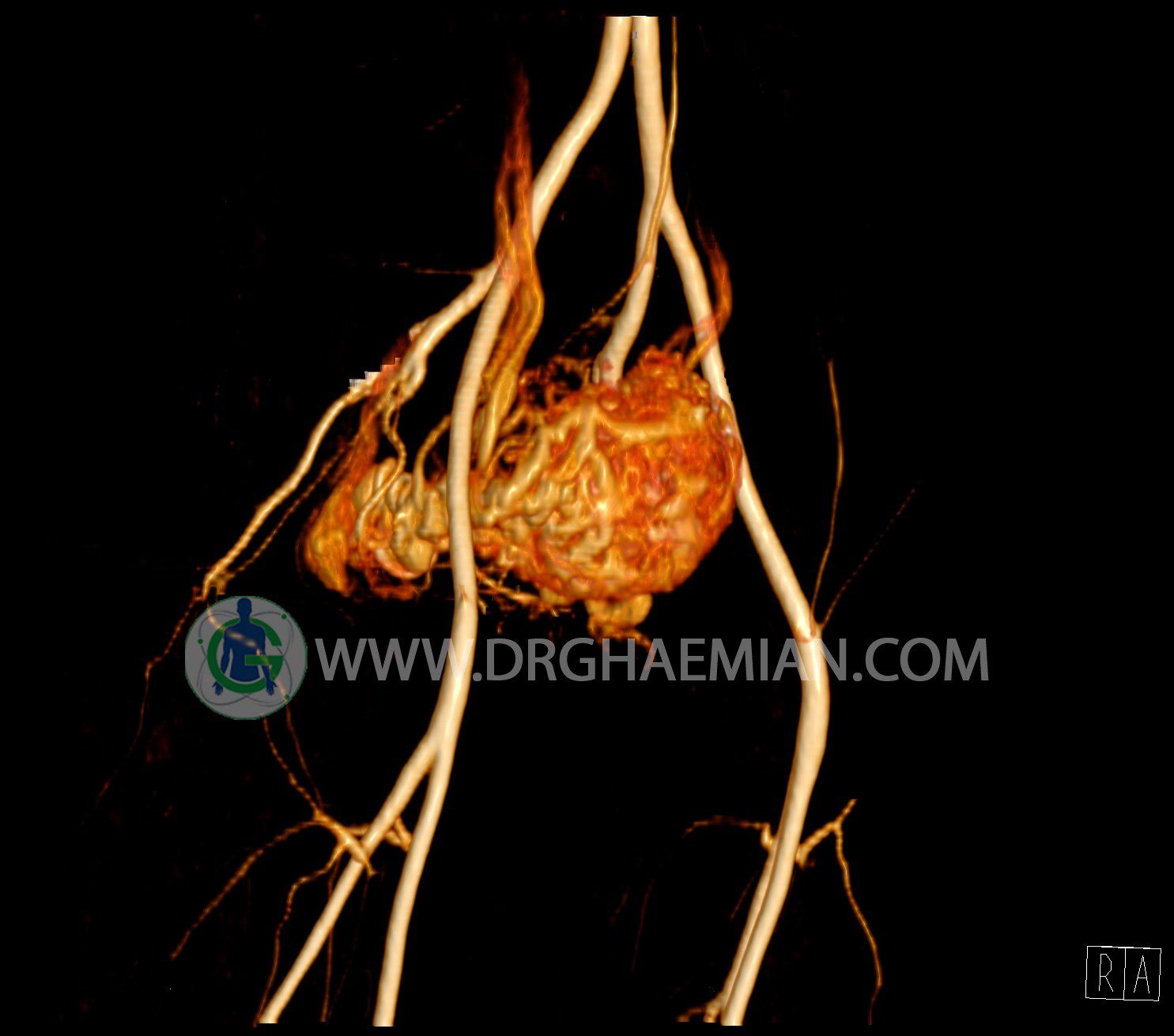 سی تی آنژیوگرافی (CTA) از تزریق ماده حاجب (کنتراست) به داخل عروق خونی شما و سی تی اسکن برای کمک به تشخیص و ارزیابی بیماری عروق خونی یا عارضه هایی مرتبط مانند آنوریسم ها یا انسداد ها استفاده می کند. در این کیس ناهنجاریهای شریانی وریدی لگن به همراه فیستول مشاهده می شود.
