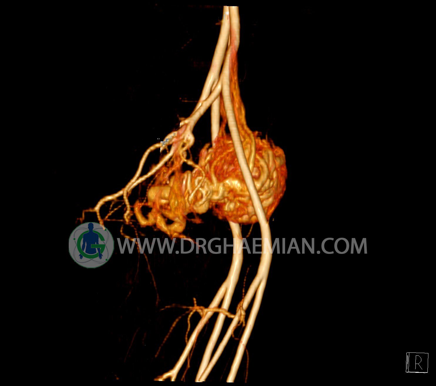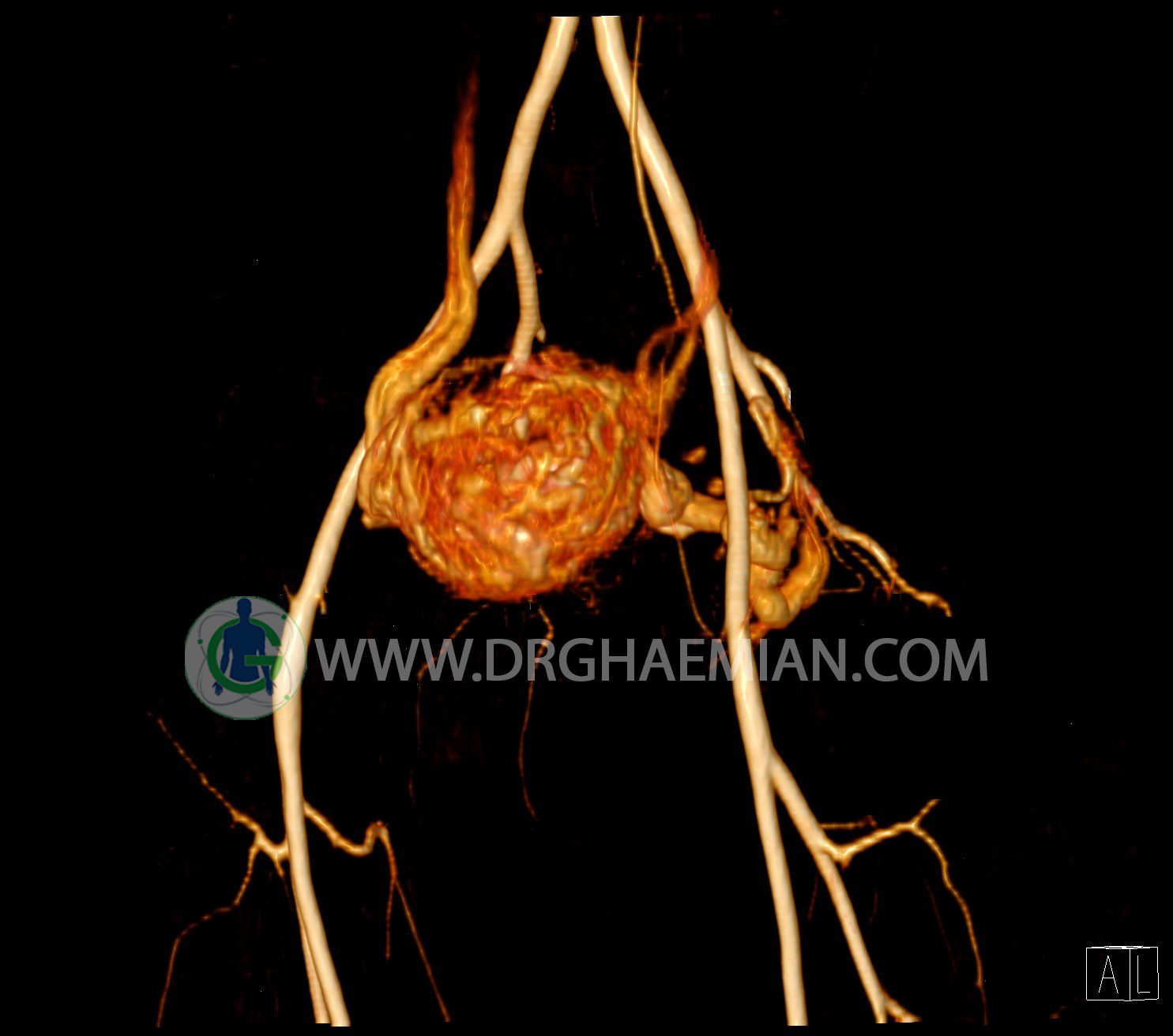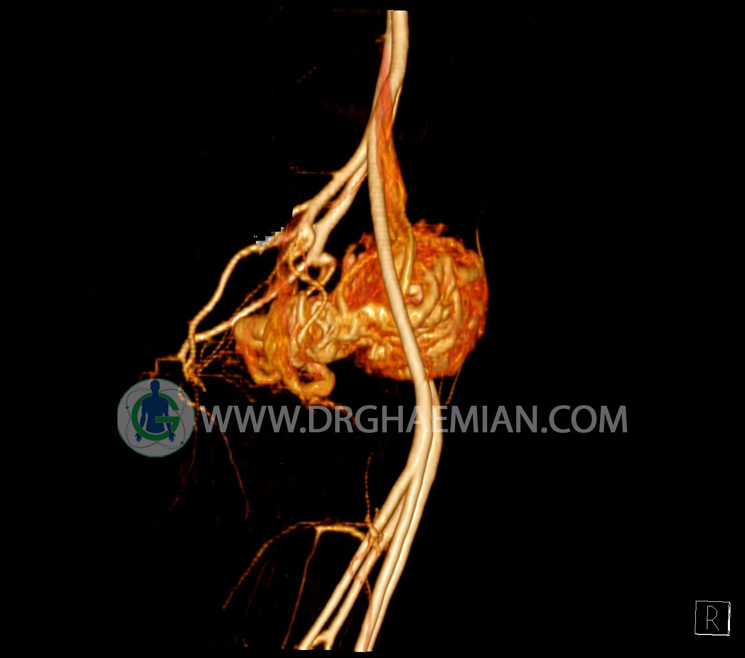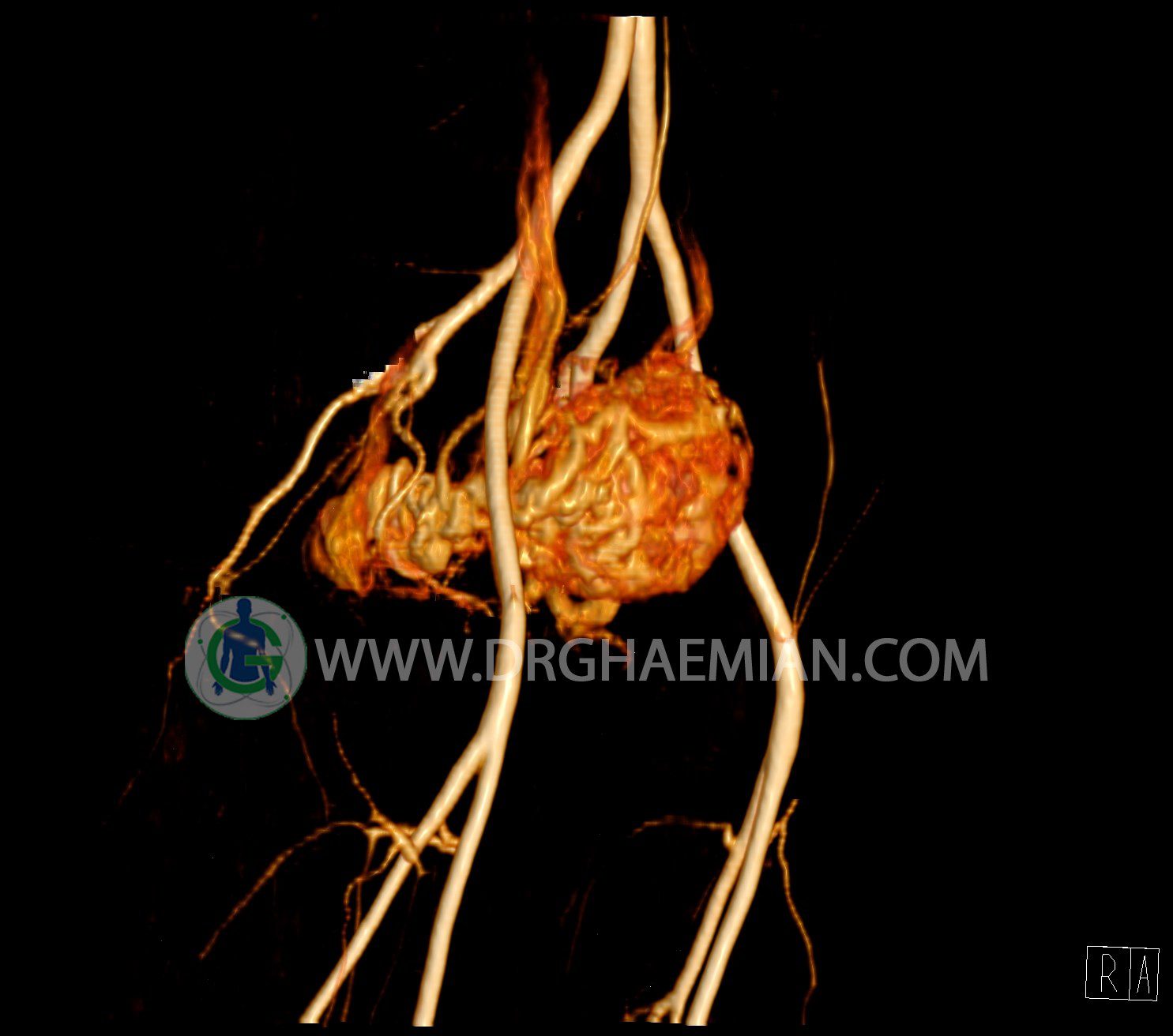 سی تی آنژیوگرافی (CTA) از تزریق ماده حاجب (کنتراست) به داخل عروق خونی شما و سی تی اسکن برای کمک به تشخیص و ارزیابی بیماری عروق خونی یا عارضه هایی مرتبط مانند آنوریسم ها یا انسداد ها استفاده می کند. در این کیس ناهنجاریهای شریانی وریدی لگن به همراه فیستول مشاهده می شود.