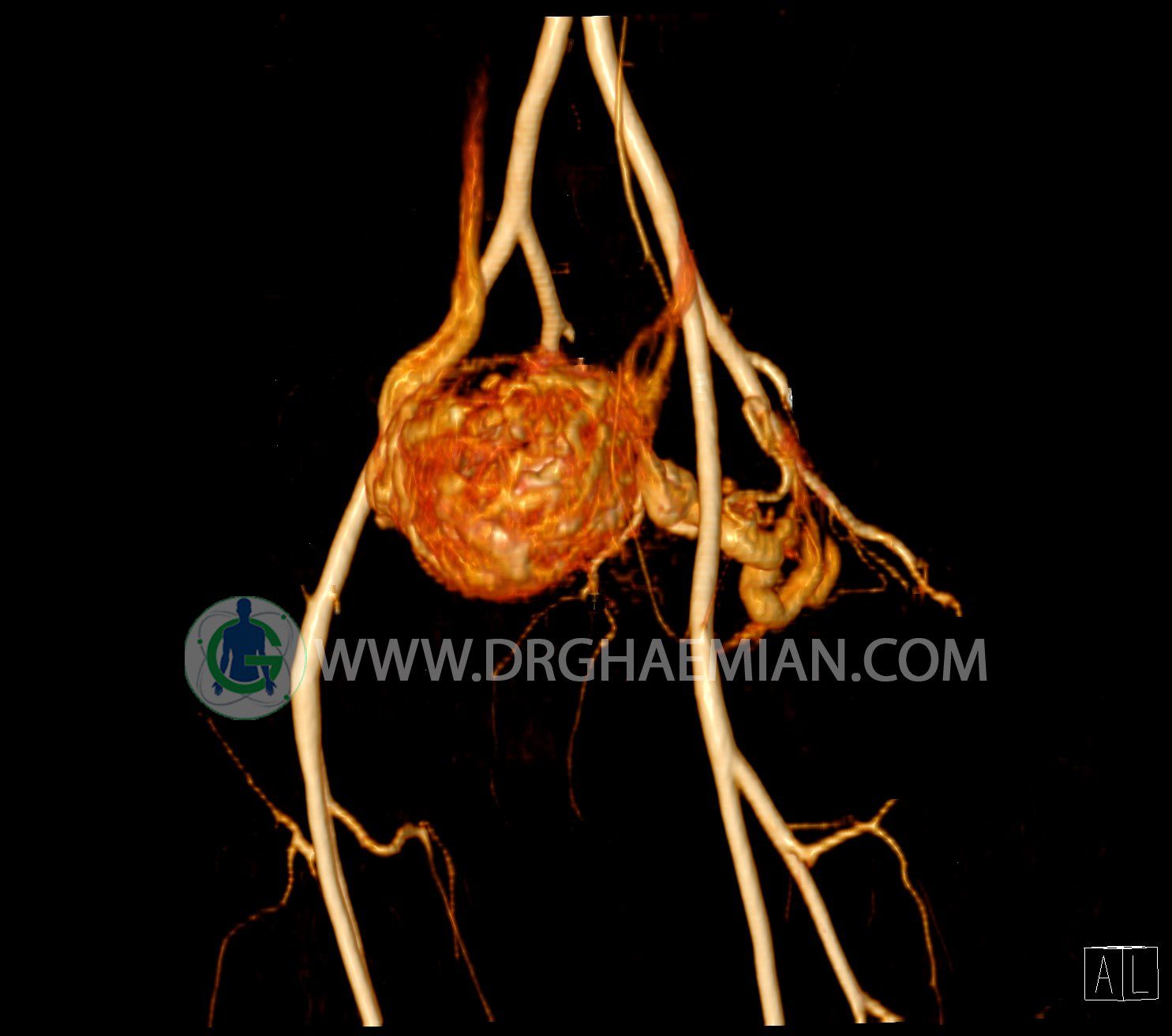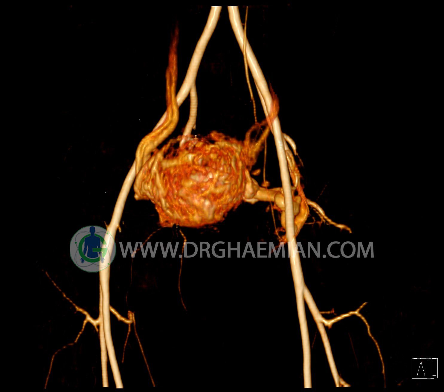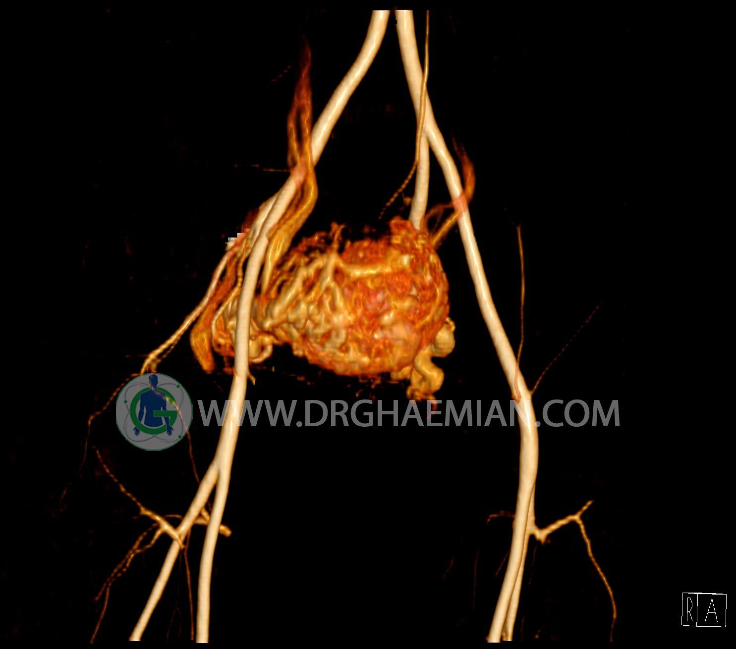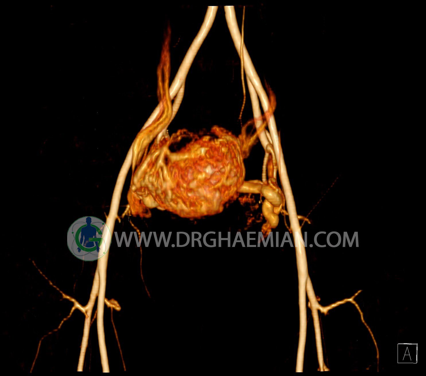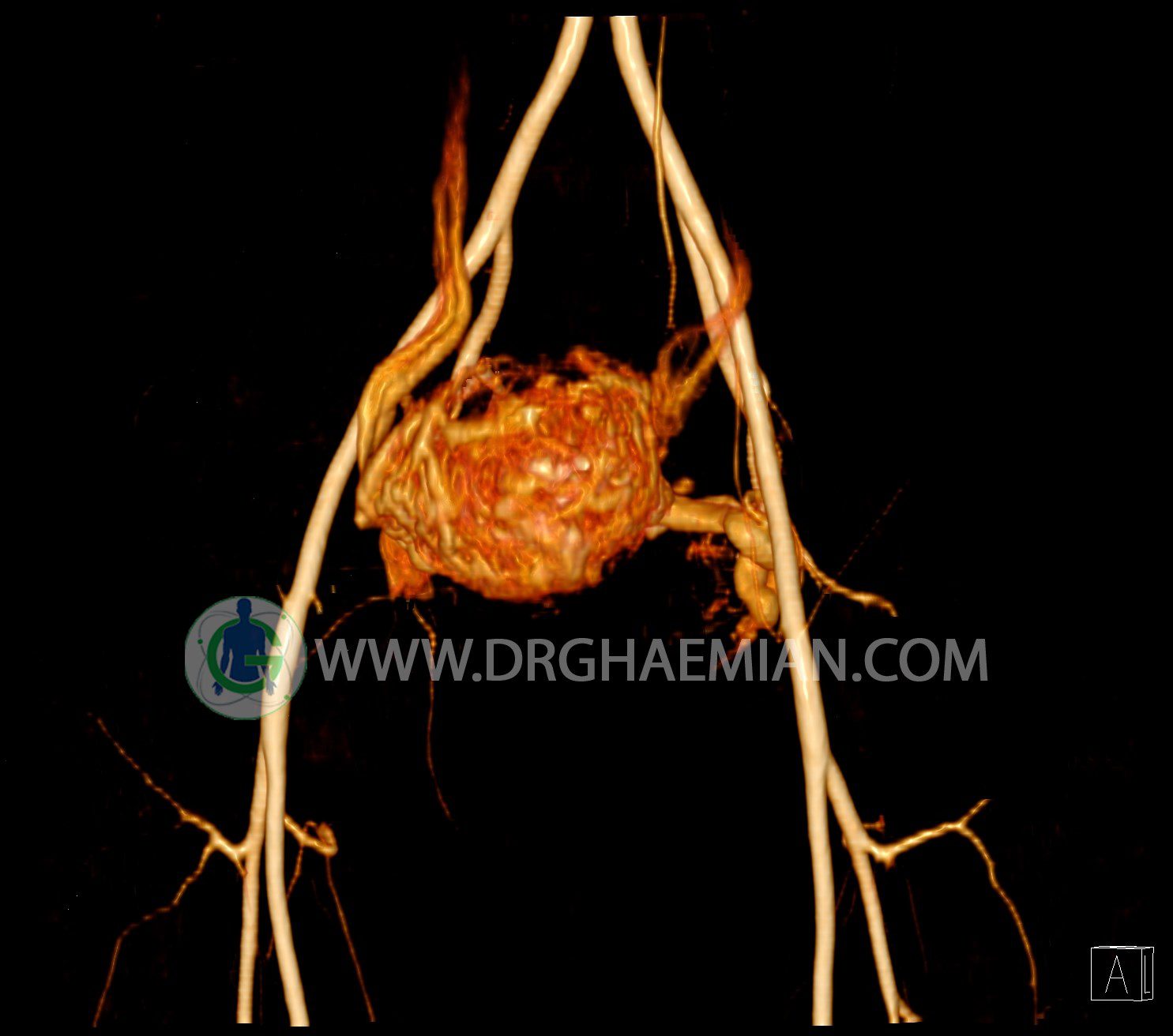 سی تی آنژیوگرافی (CTA) از تزریق ماده حاجب (کنتراست) به داخل عروق خونی شما و سی تی اسکن برای کمک به تشخیص و ارزیابی بیماری عروق خونی یا عارضه هایی مرتبط مانند آنوریسم ها یا انسداد ها استفاده می کند. در این کیس ناهنجاریهای شریانی وریدی لگن به همراه فیستول مشاهده می شود.