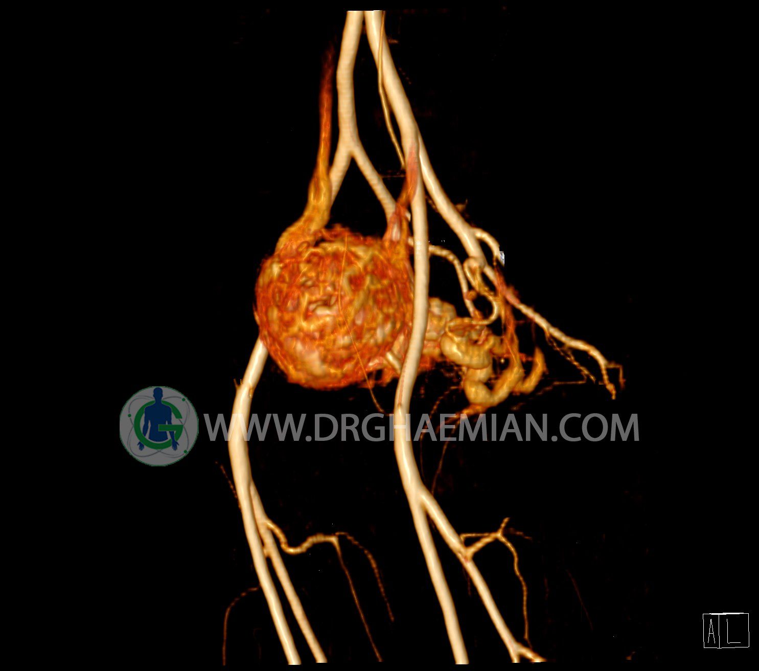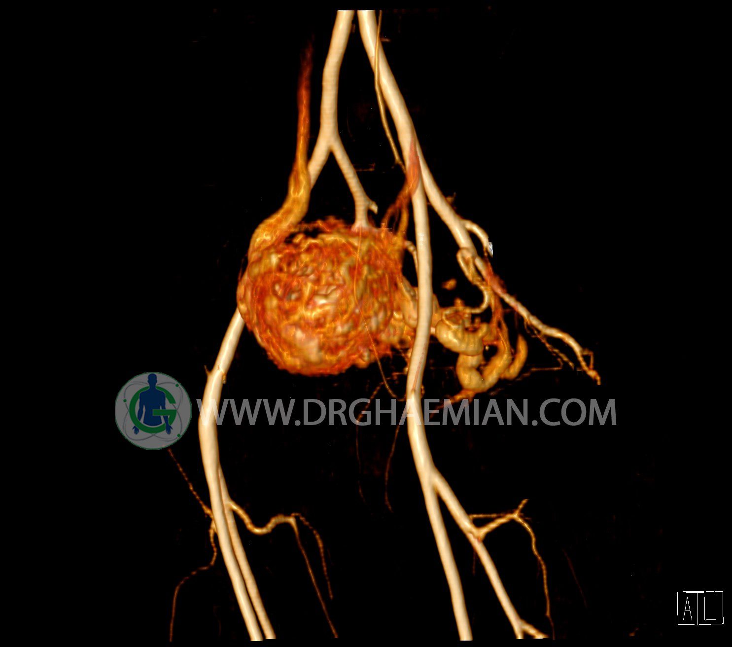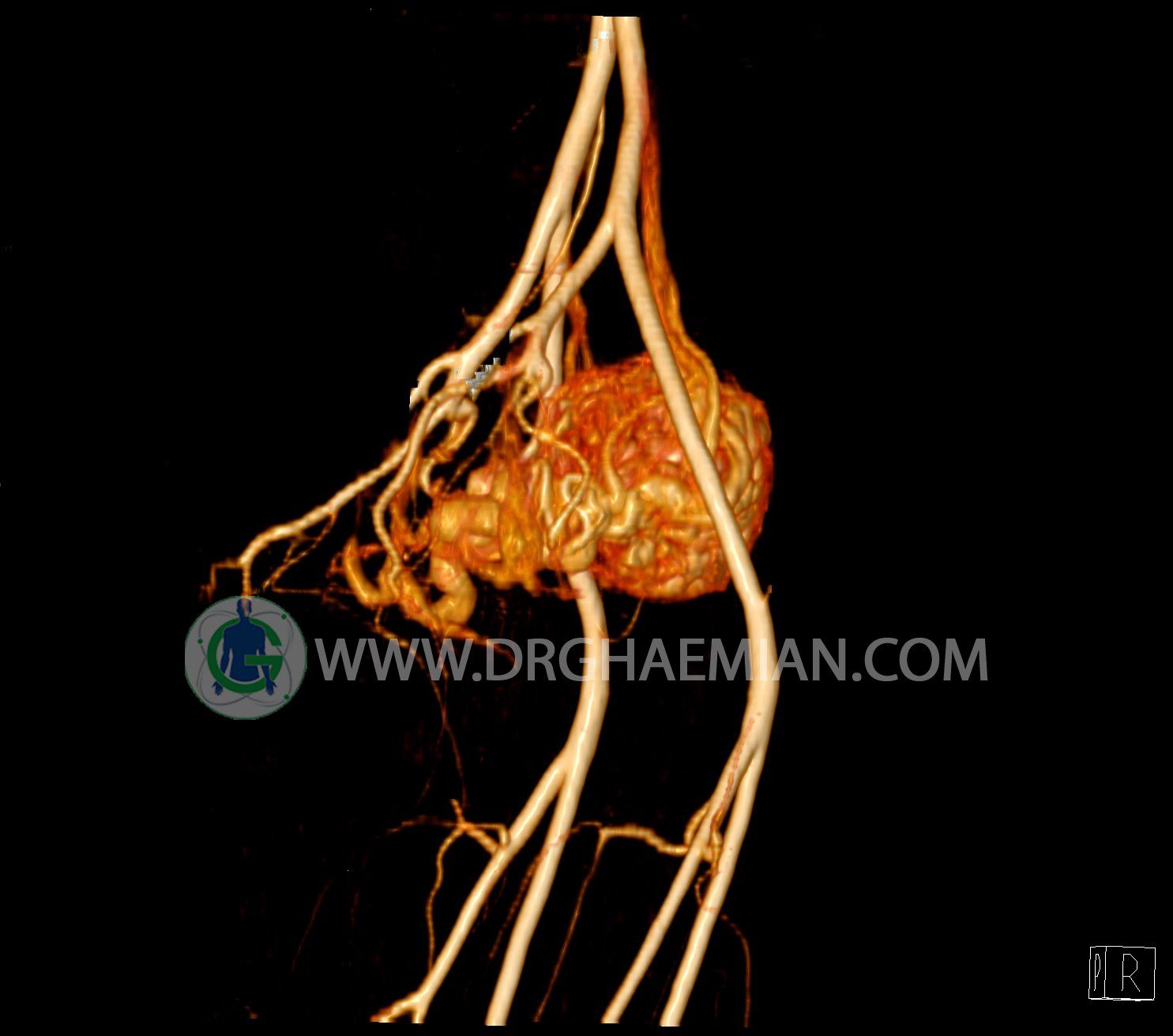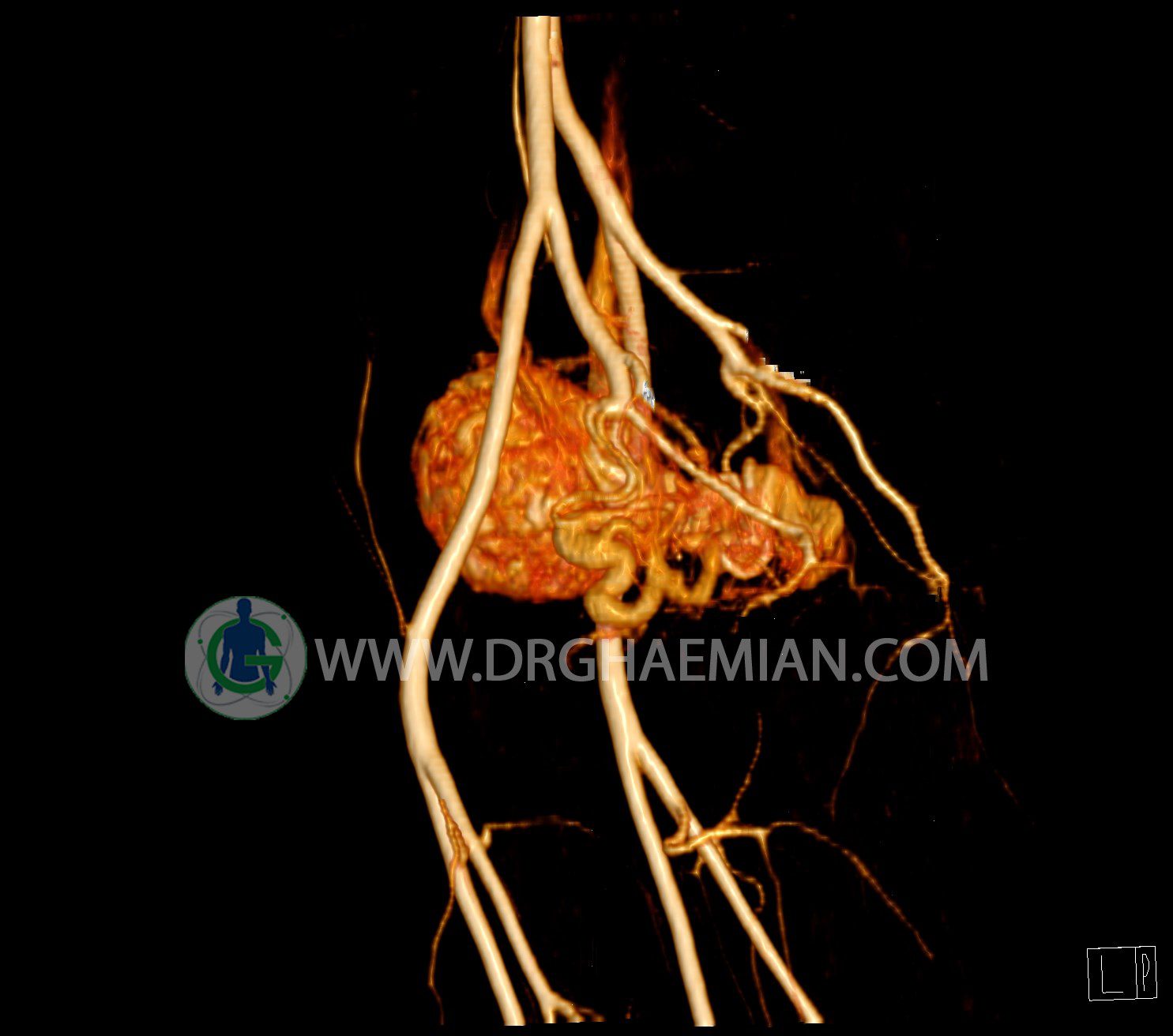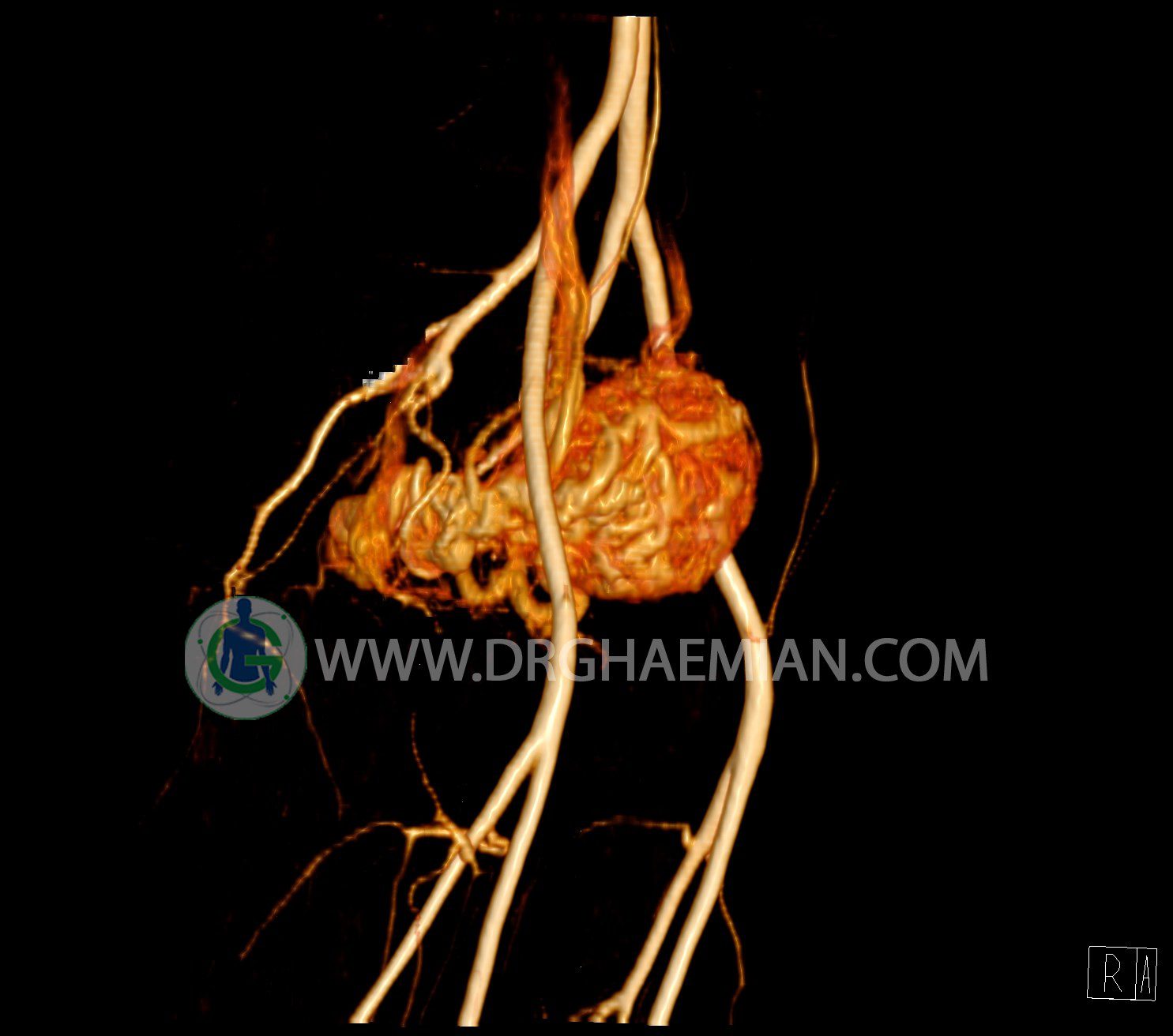 سی تی آنژیوگرافی (CTA) از تزریق ماده حاجب (کنتراست) به داخل عروق خونی شما و سی تی اسکن برای کمک به تشخیص و ارزیابی بیماری عروق خونی یا عارضه هایی مرتبط مانند آنوریسم ها یا انسداد ها استفاده می کند. در این کیس ناهنجاریهای شریانی وریدی لگن به همراه فیستول مشاهده می شود.