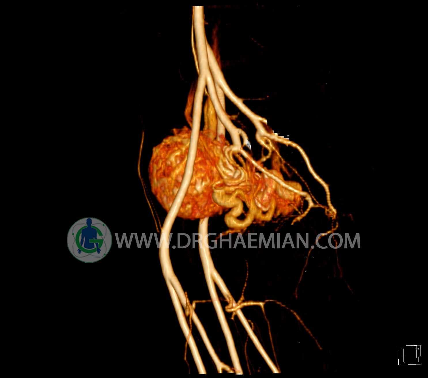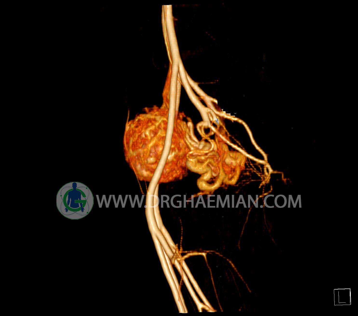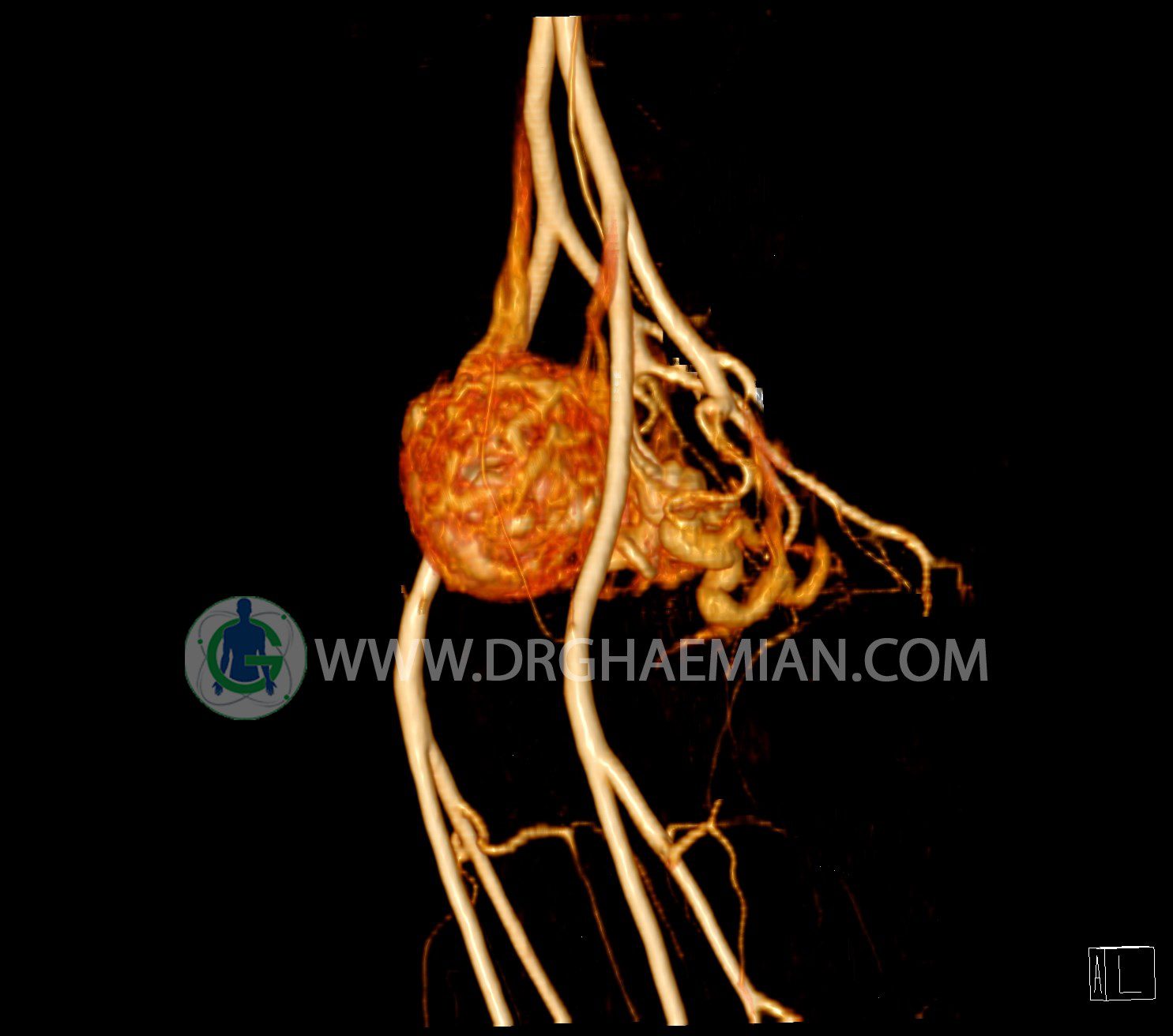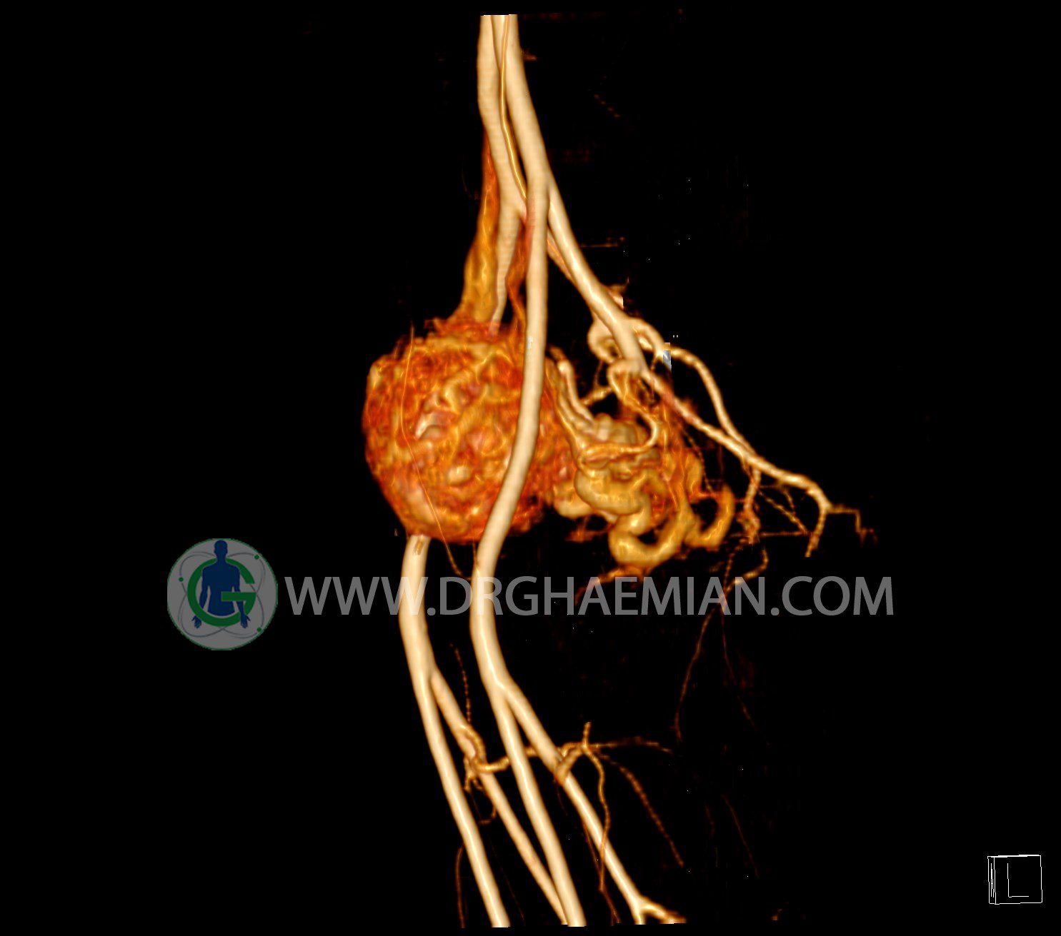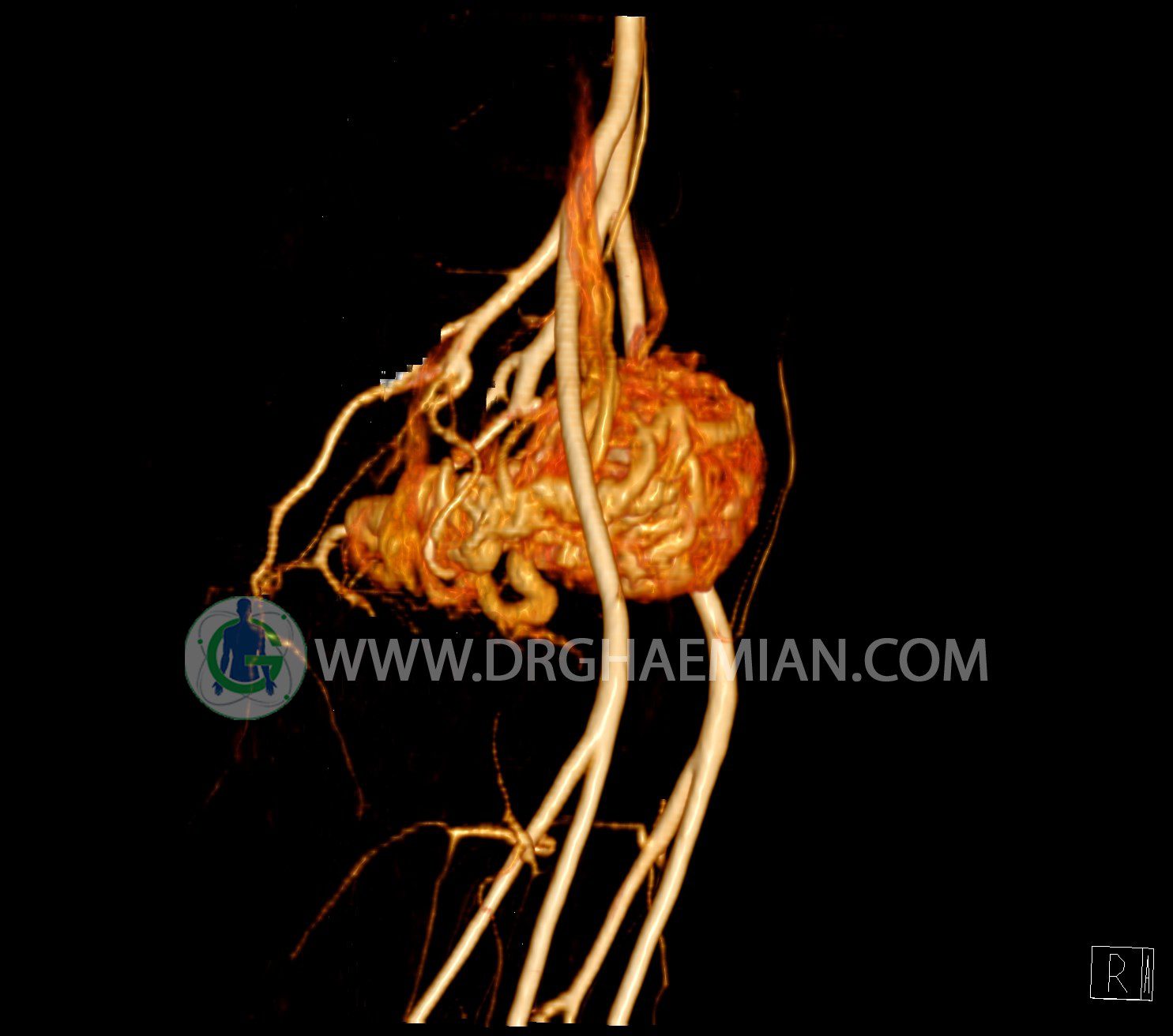 سی تی آنژیوگرافی (CTA) از تزریق ماده حاجب (کنتراست) به داخل عروق خونی شما و سی تی اسکن برای کمک به تشخیص و ارزیابی بیماری عروق خونی یا عارضه هایی مرتبط مانند آنوریسم ها یا انسداد ها استفاده می کند. در این کیس ناهنجاریهای شریانی وریدی لگن به همراه فیستول مشاهده می شود.