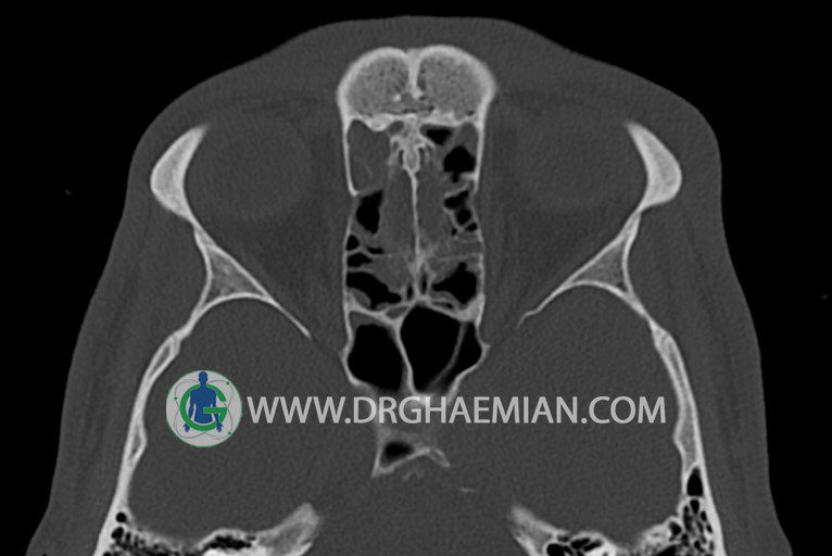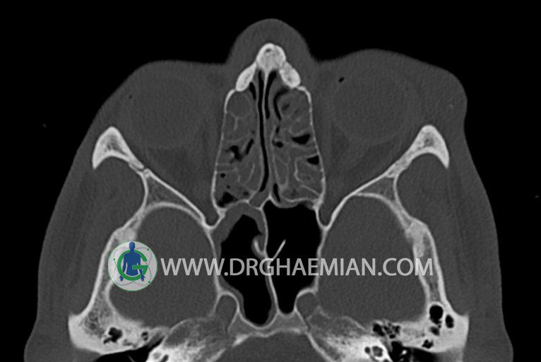 سی تی اسکن اوربیت یک روش تصویربرداری است. این روش از تششعات برای ایجاد تصاویری با جزییات از حفره های چشمی (اوربیت ها)، چشمان و استخوان های پیرامون ایجاد می کند. در این کیس هماتوم اوربیت، افزایش ضخامت مخاطی، انحراف سپتوم و علائم شکستگی در استخوان بینی مشاهده می شود.