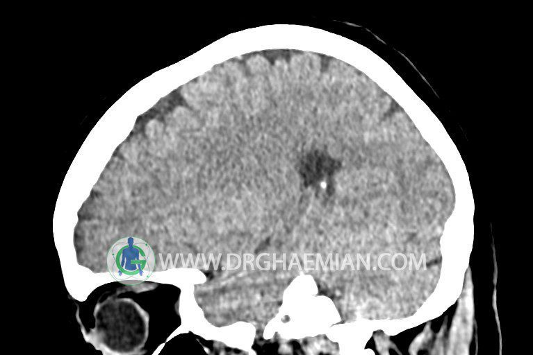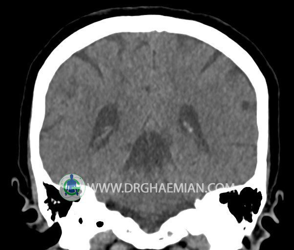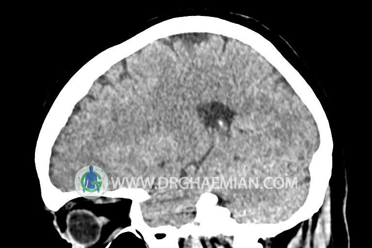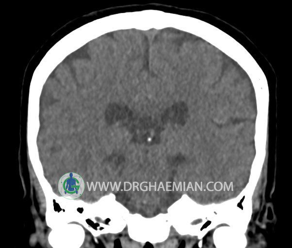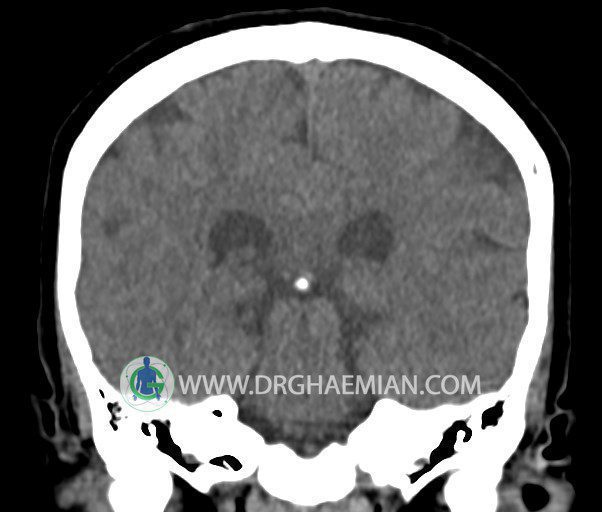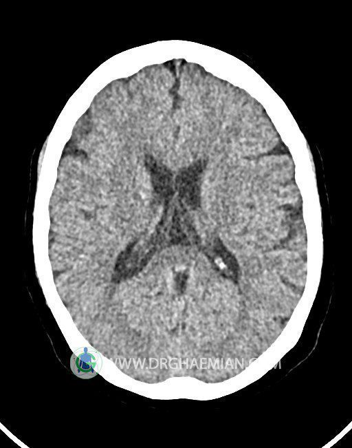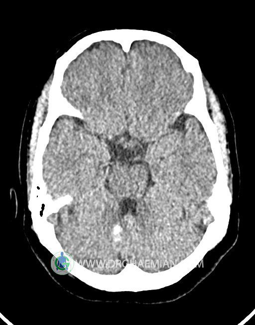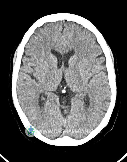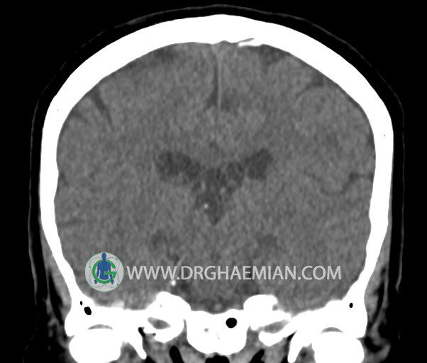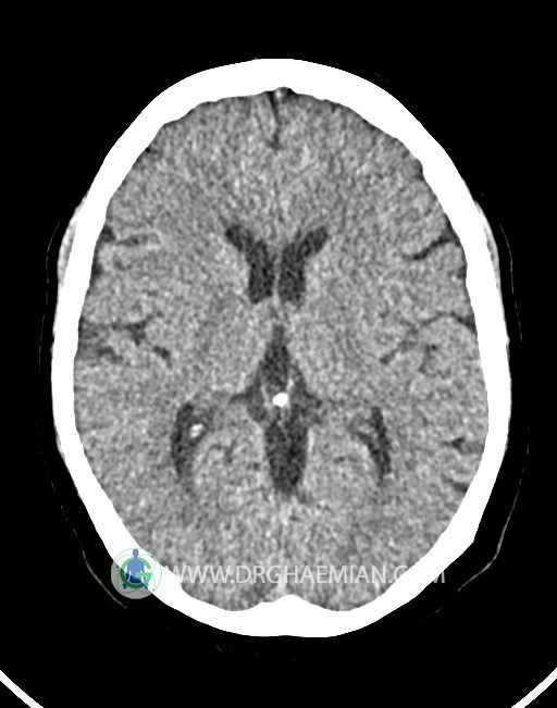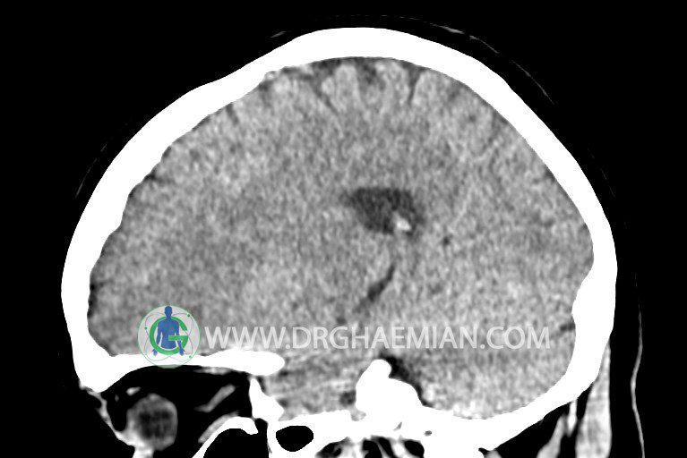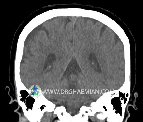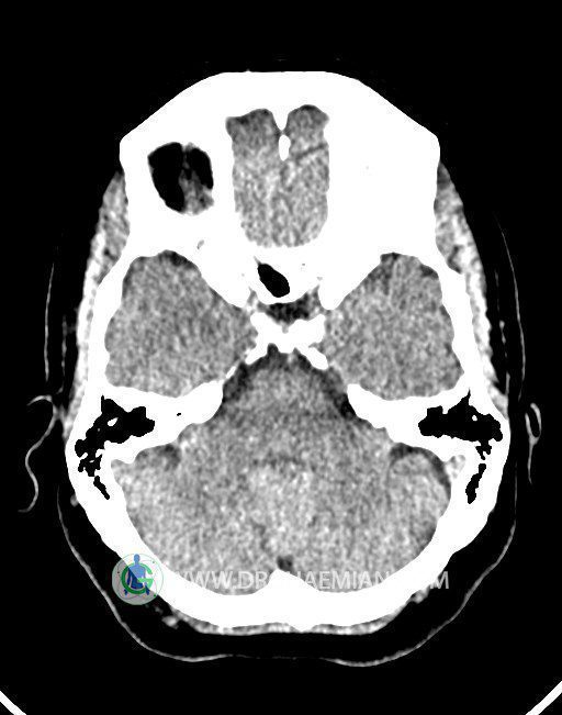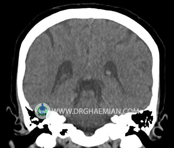 سی تی اسکن مغز یک روش تصویربرداری است که با استفاده از تشعات ایکس تصاویری با جزییات از ناحیه سر که شامل مغز، حفره های چشمی و سینوس می شود ایجاد میکند. در این کیس هماتوم مغز و کلسیفیکاسیون و نشانه های سلای نسبتا خالی هیپوفیز دیده می شود.