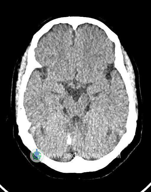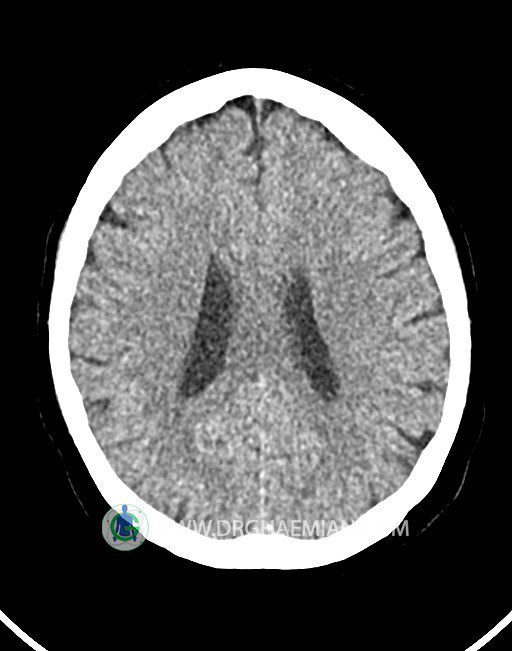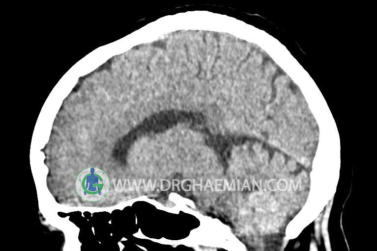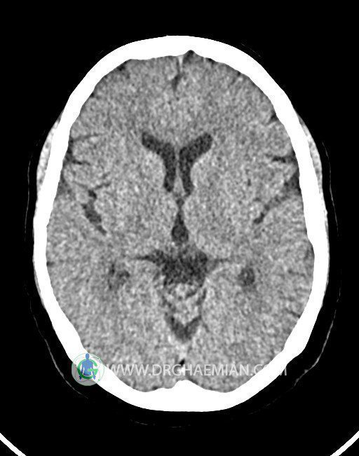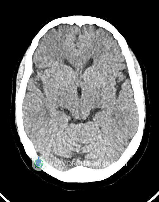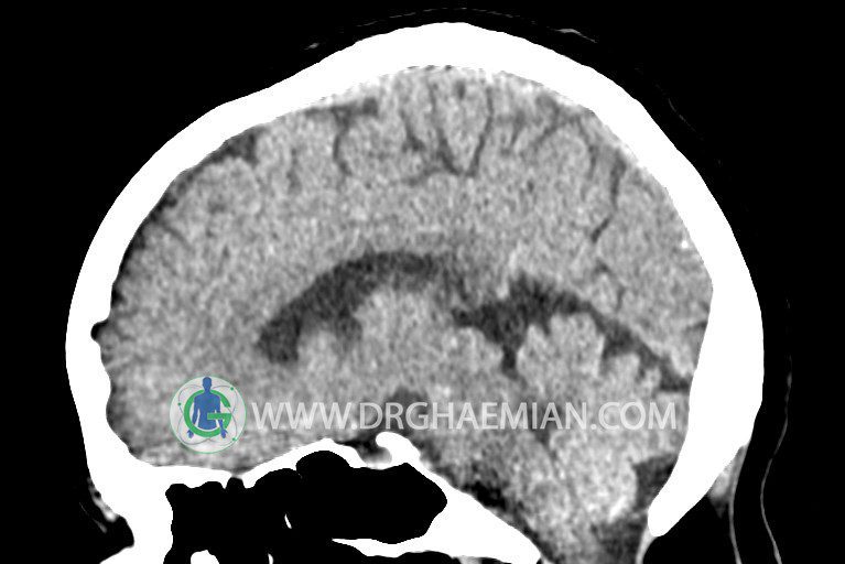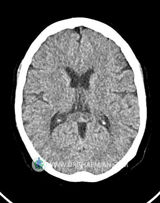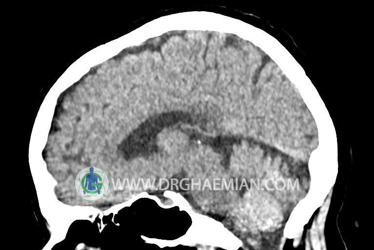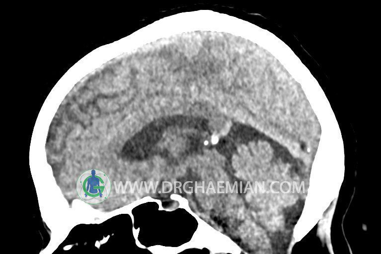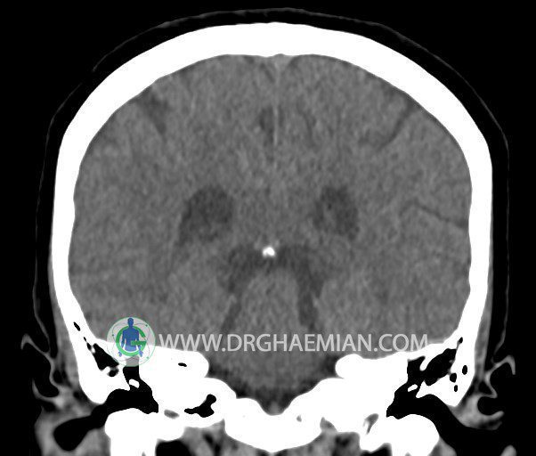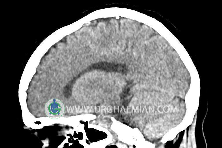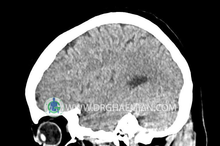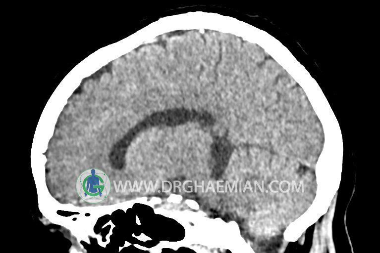 سی تی اسکن مغز یک روش تصویربرداری است که با استفاده از تشعات ایکس تصاویری با جزییات از ناحیه سر که شامل مغز، حفره های چشمی و سینوس می شود ایجاد میکند. در این کیس هماتوم مغز و کلسیفیکاسیون و نشانه های سلای نسبتا خالی هیپوفیز دیده می شود.