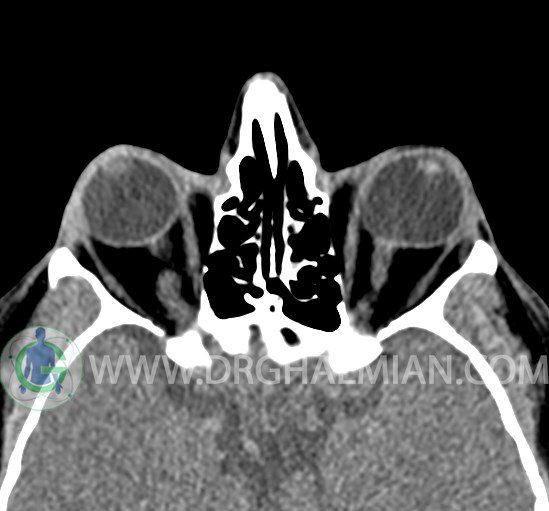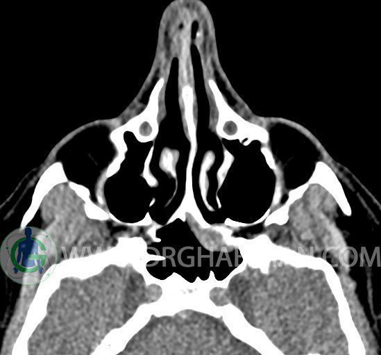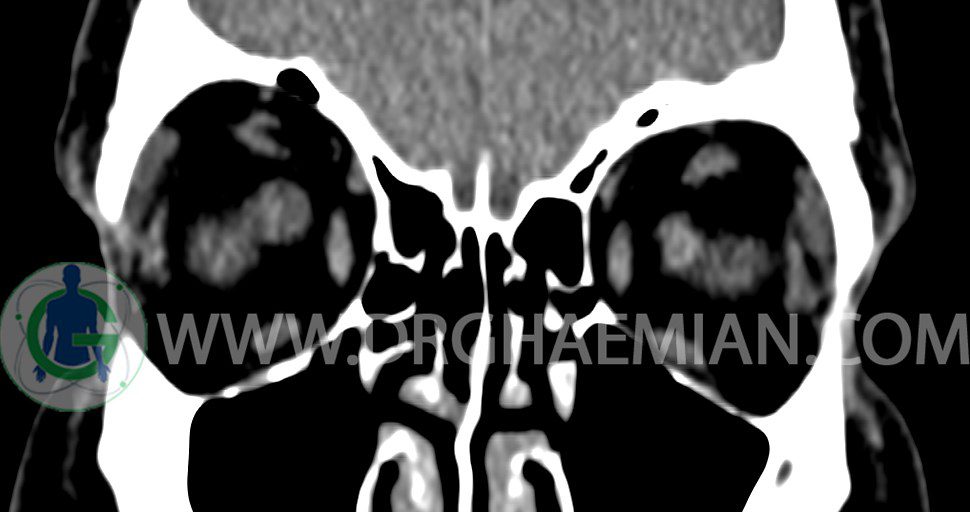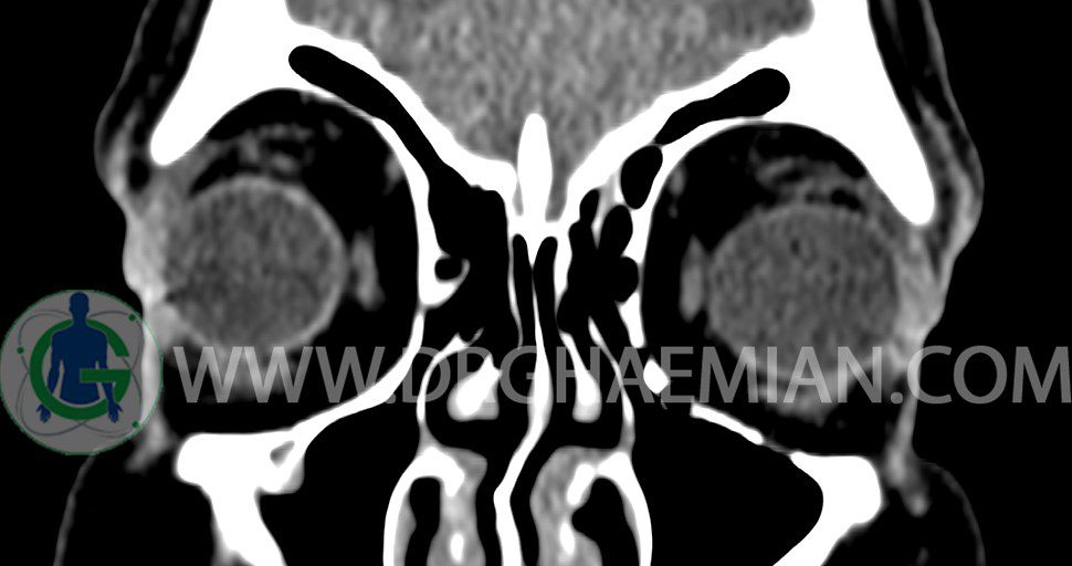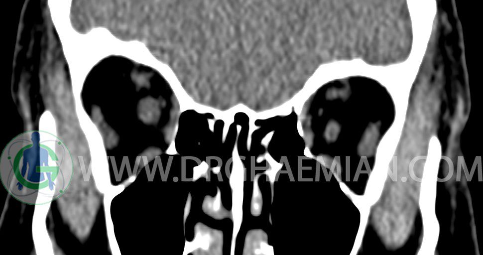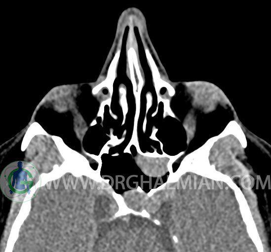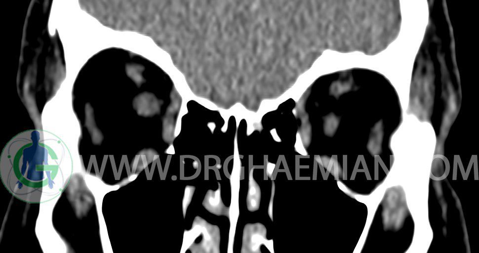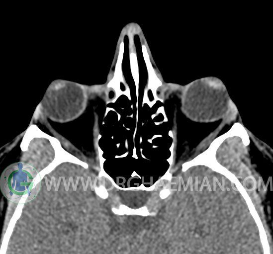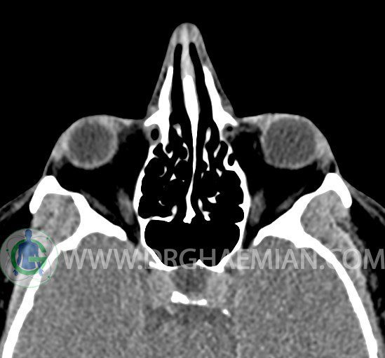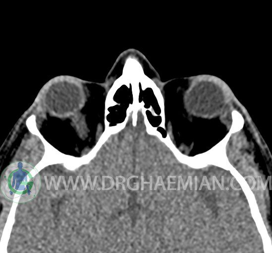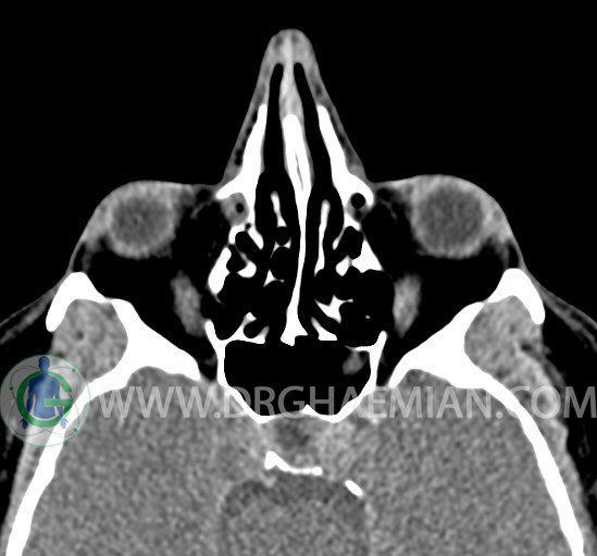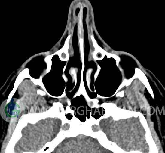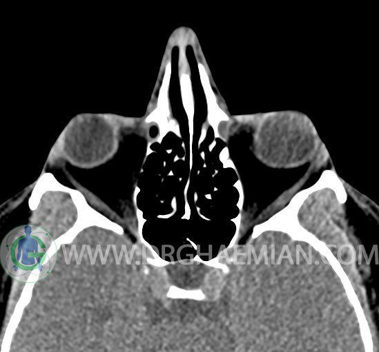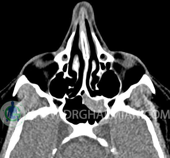 سی تی اسکن اوربیت یک روش تصویربرداری است. این روش از تشعشعات برای ایجاد تصاویری با جزییات از حفره های چشمی (اوربیت ها)، چشمان و استخوان های پیرامون استفاده می کند. در این کیس هيپوتروفی عصب بینایی چپ و انحراف سپتوم و ادم عصب بینایی سمت راست دیده می شود.