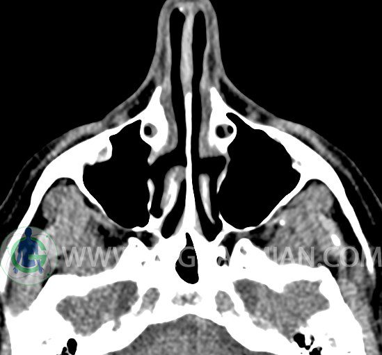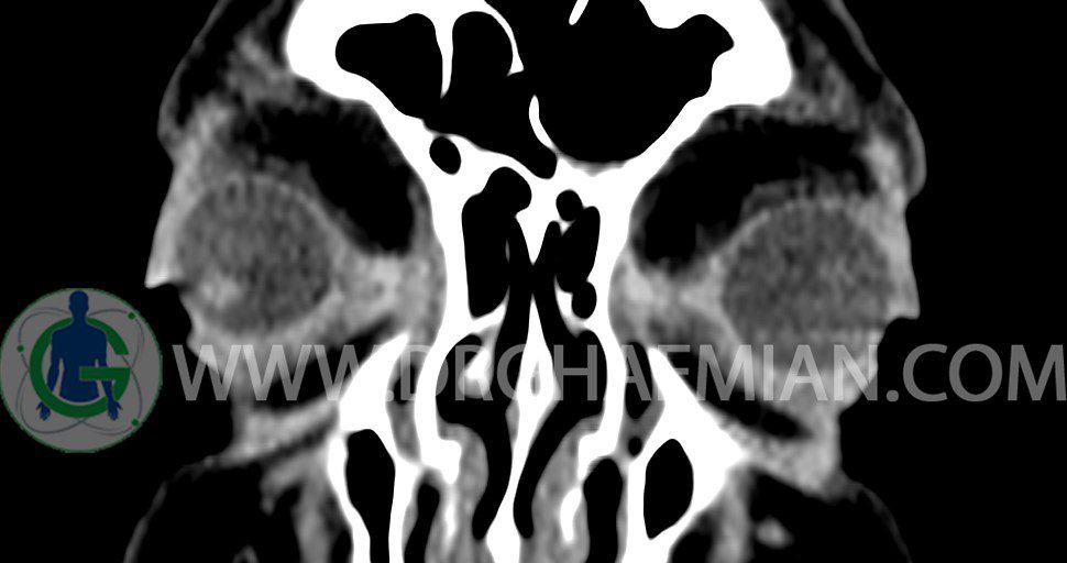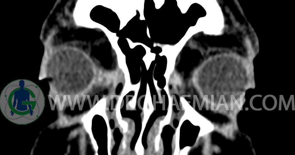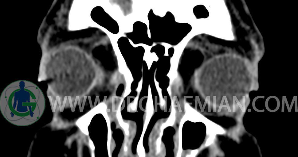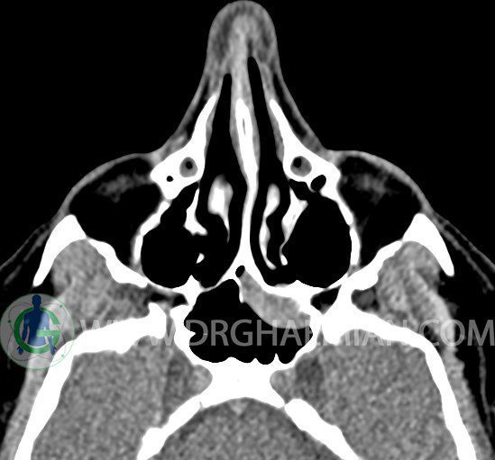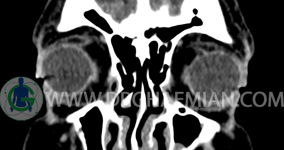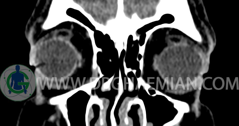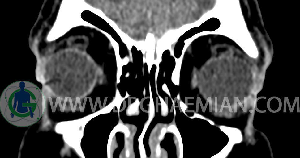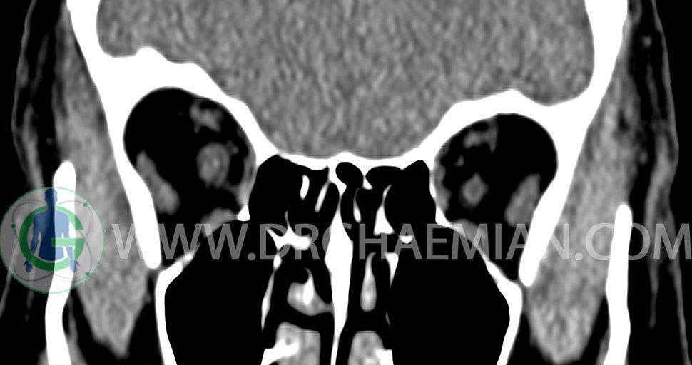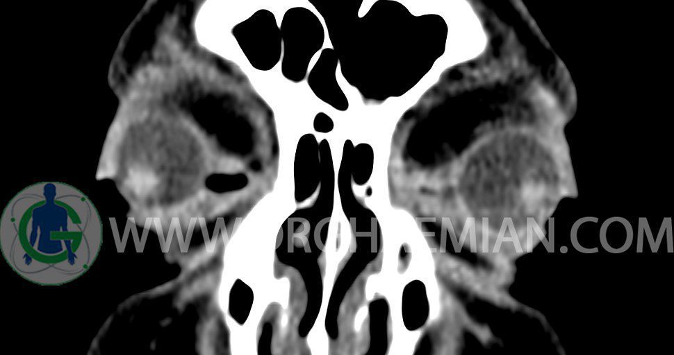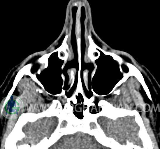 سی تی اسکن اوربیت یک روش تصویربرداری است. این روش از تشعشعات برای ایجاد تصاویری با جزییات از حفره های چشمی (اوربیت ها)، چشمان و استخوان های پیرامون استفاده می کند. در این کیس هيپوتروفی عصب بینایی چپ و انحراف سپتوم و ادم عصب بینایی سمت راست دیده می شود.