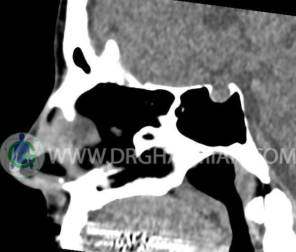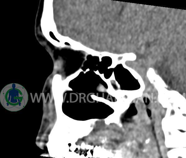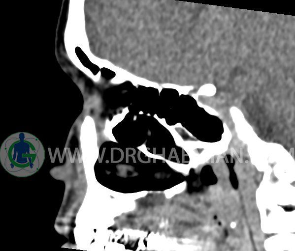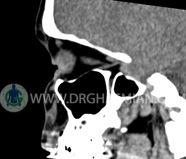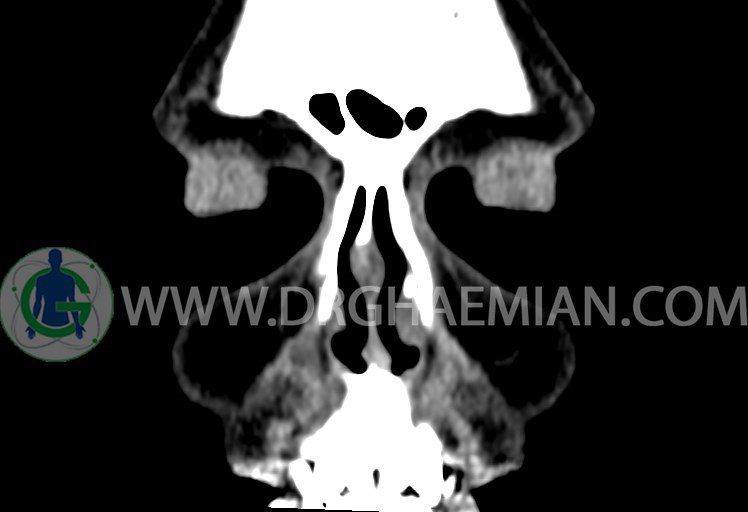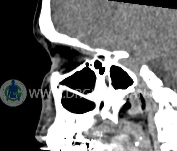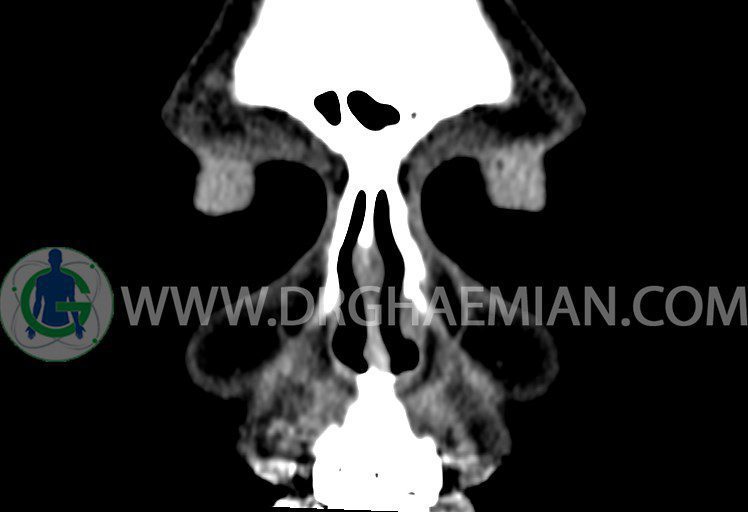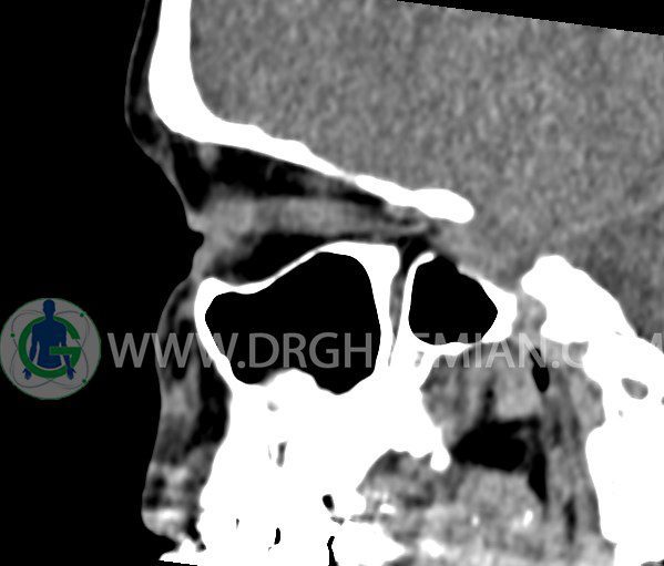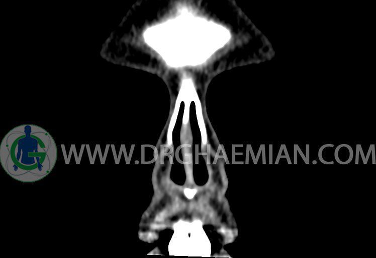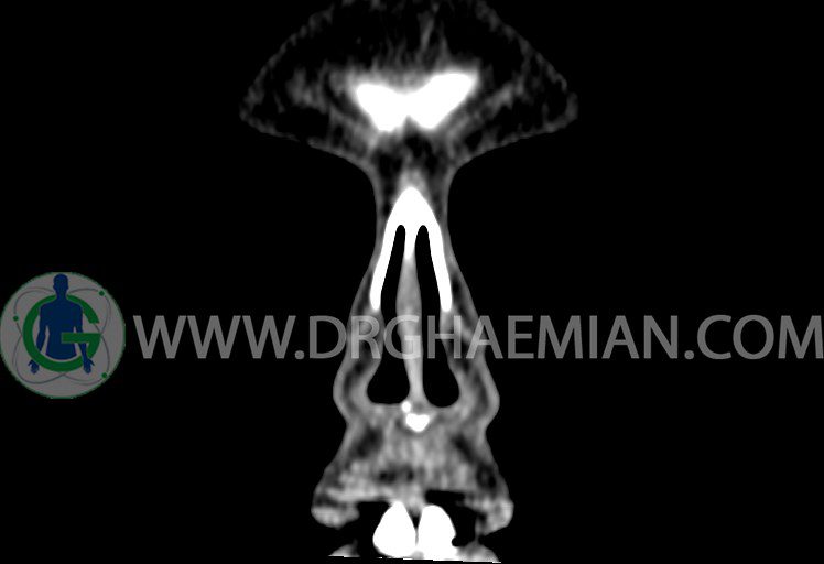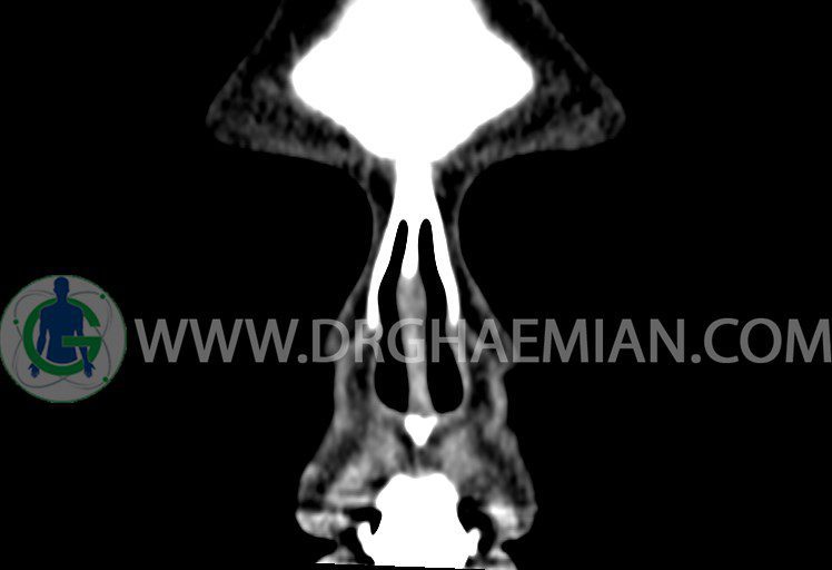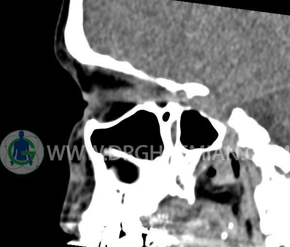 سی تی اسکن سینوس ها یک روش تصویربرداری است که با استفاده از تشعشعات تصاویری با جزییات از ناحیه خالی داخل صورت (سینوس ها) ایجاد میکند. در این کیس هيپوپلازی سينوس فرونتال و انحراف سپتوم دیده می شود.