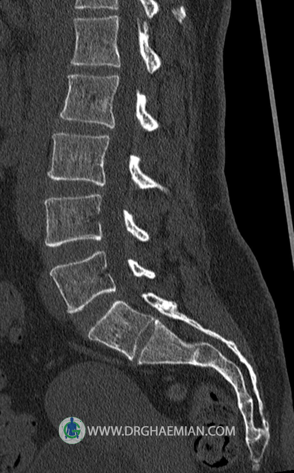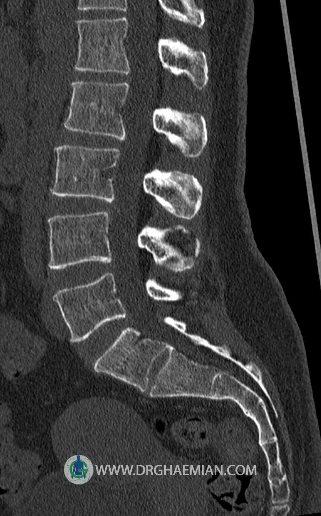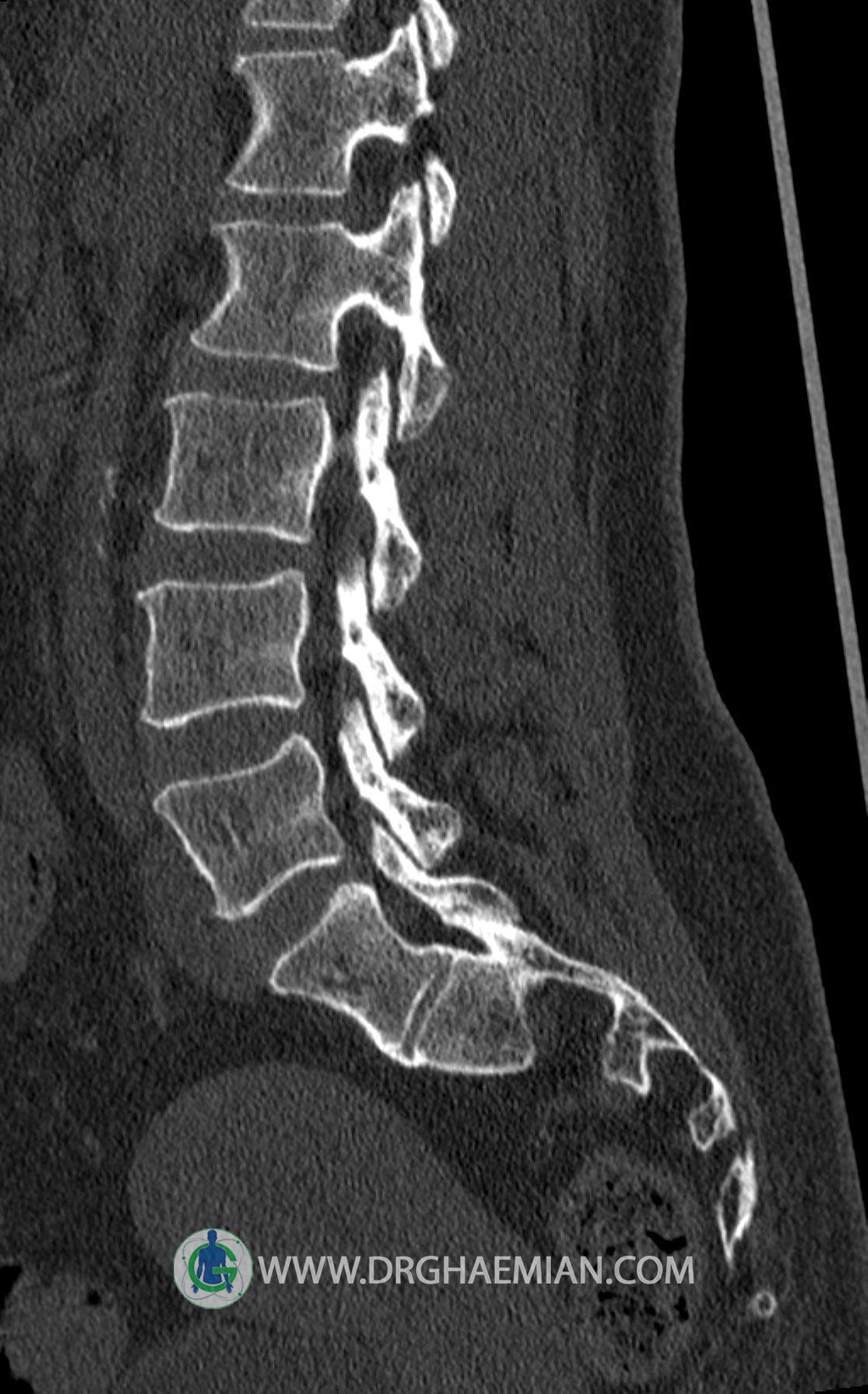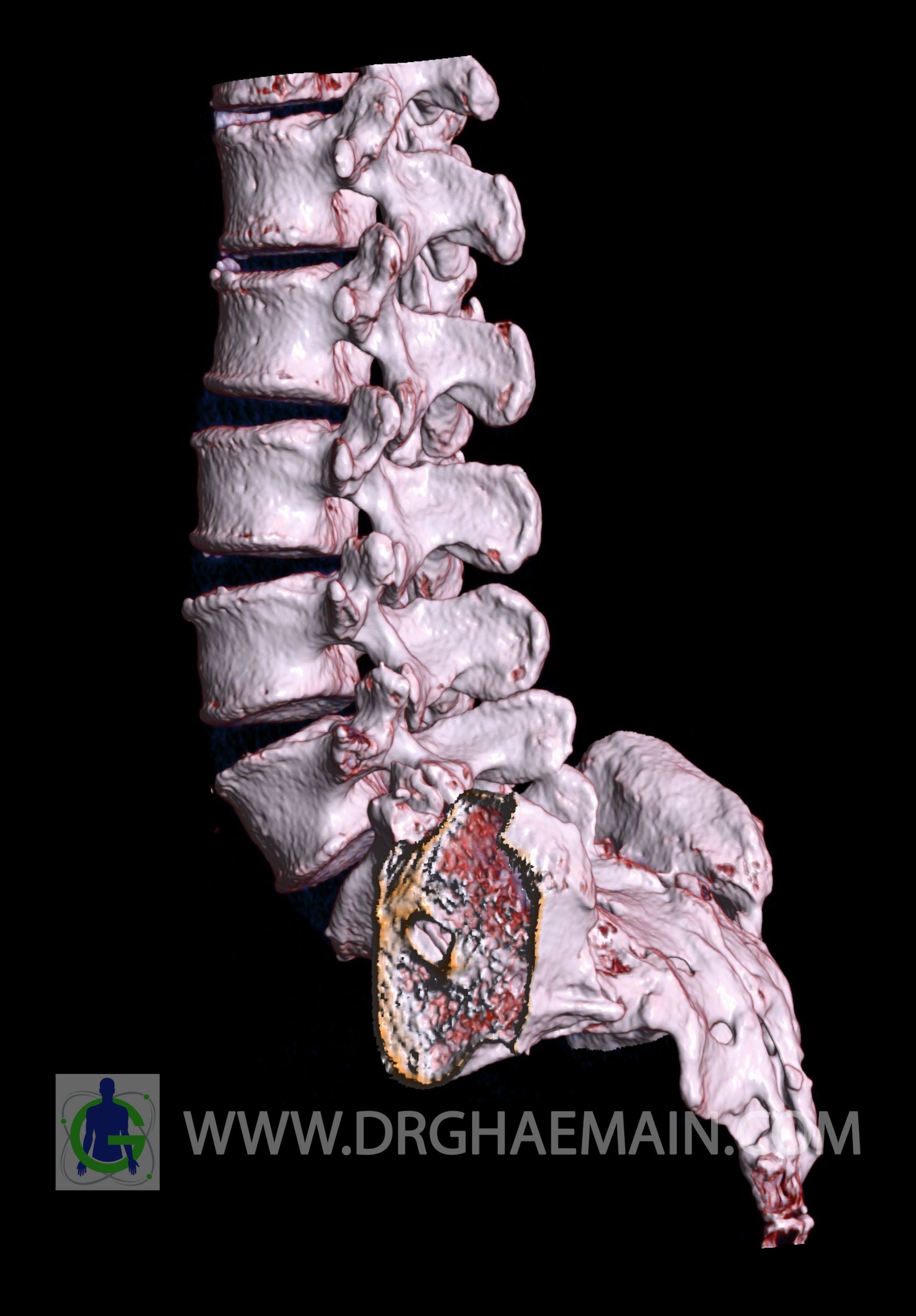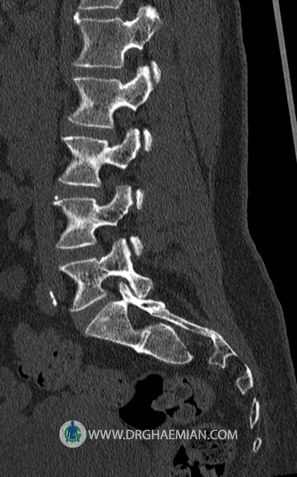سی تی اسکن اسپيرال ازسطح تحتاني T12 تا انتهاي ساکروم (مولتي ديدکتور 16 با مقاطع ظريف و بازسازي هاي ساژيتال و کرونال و 3D):