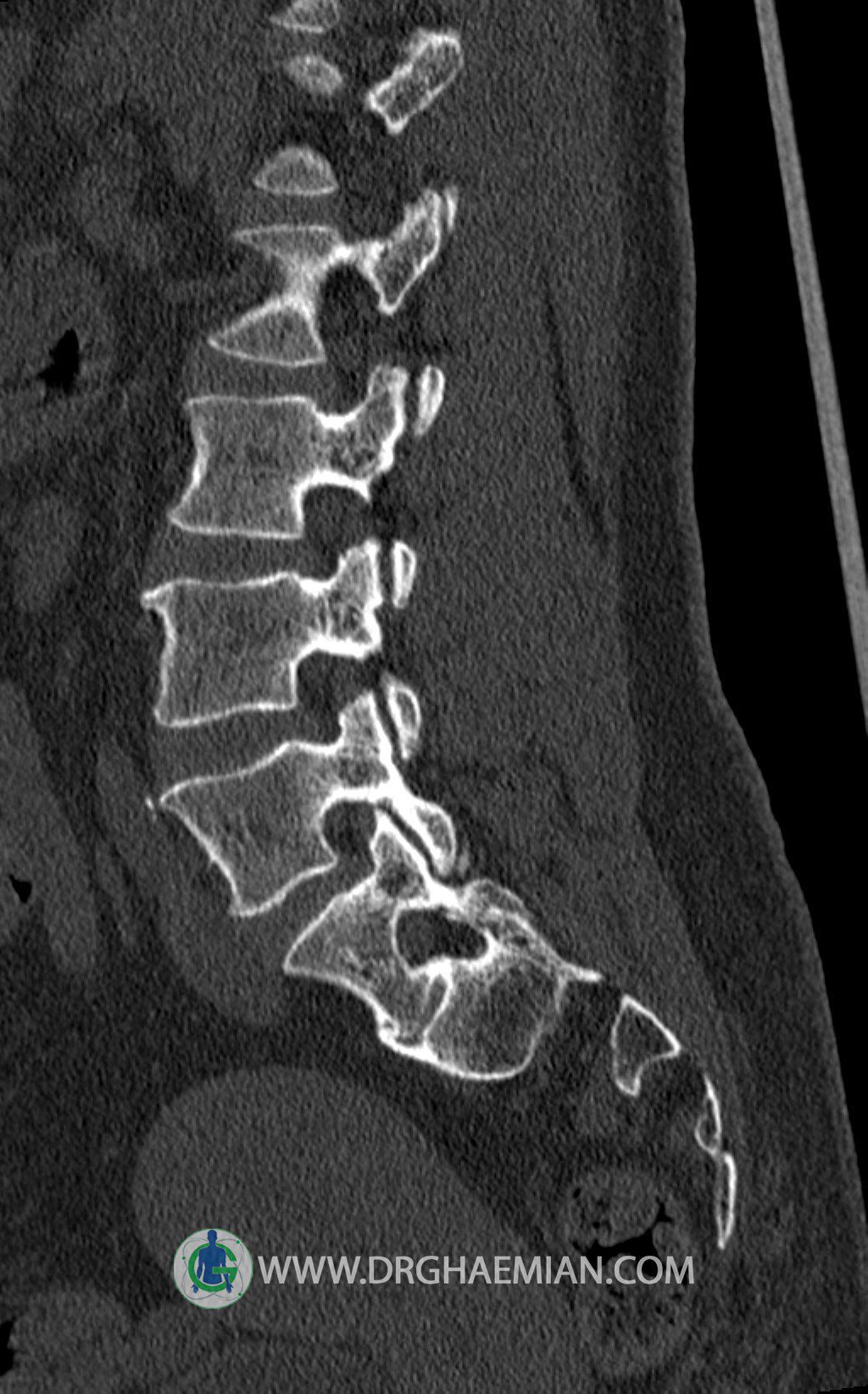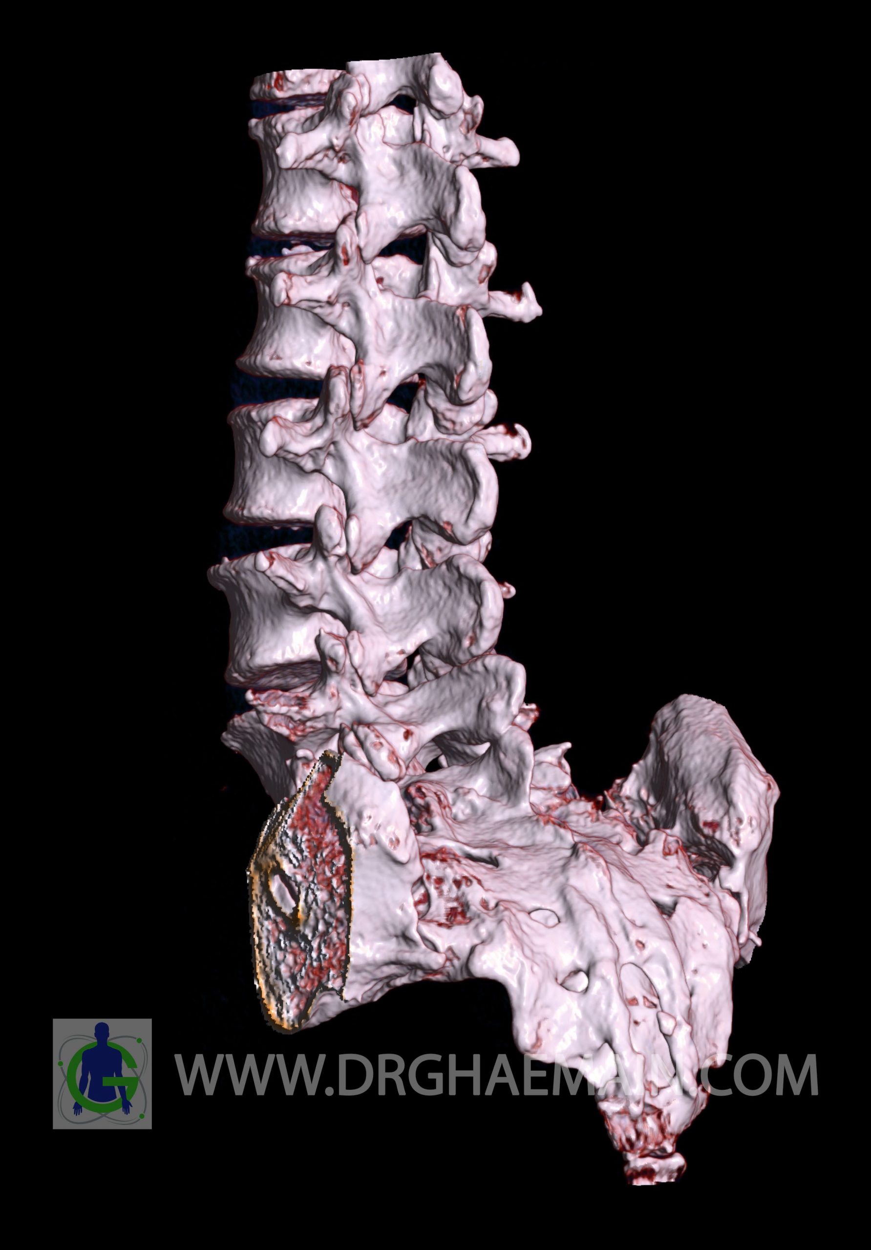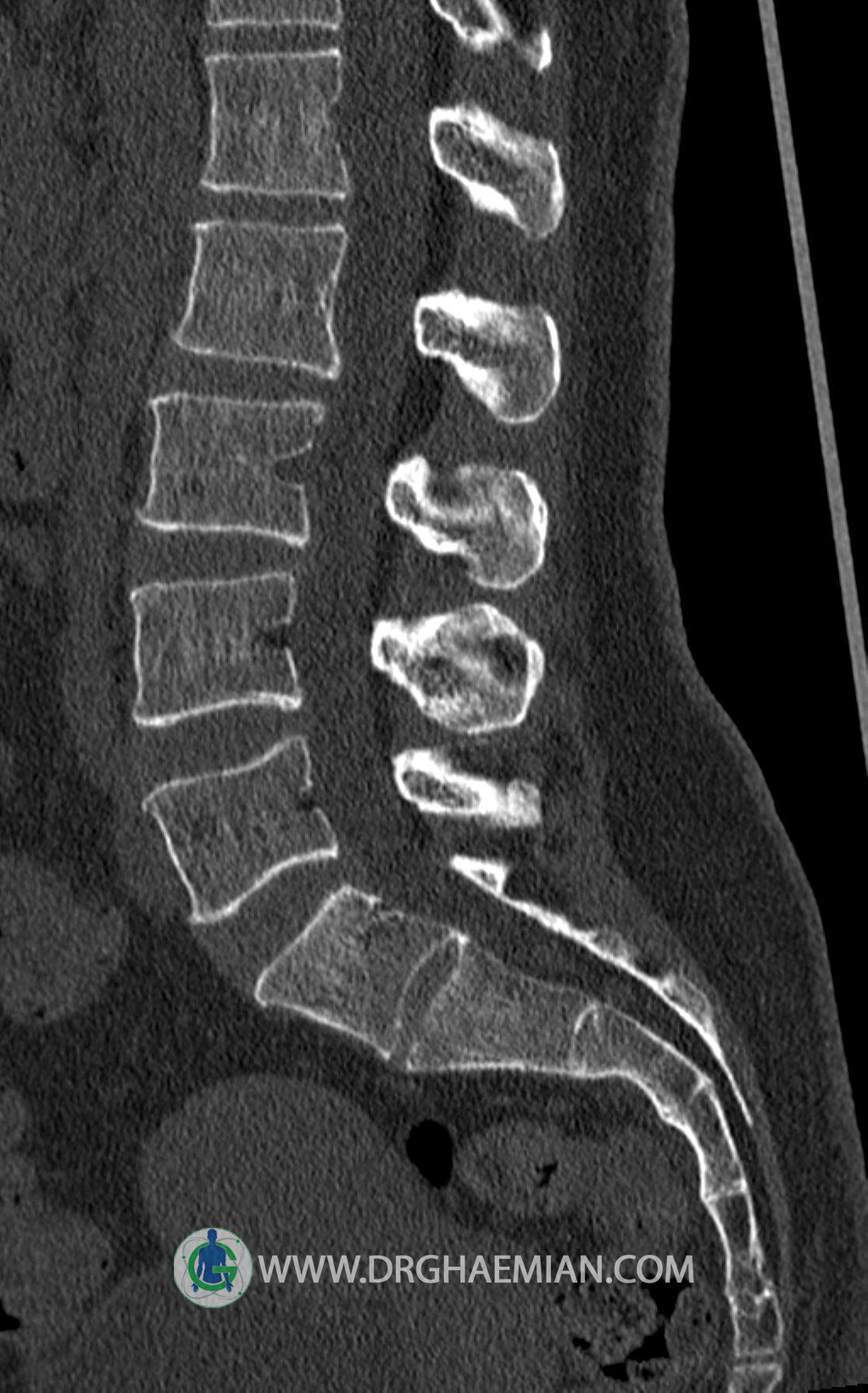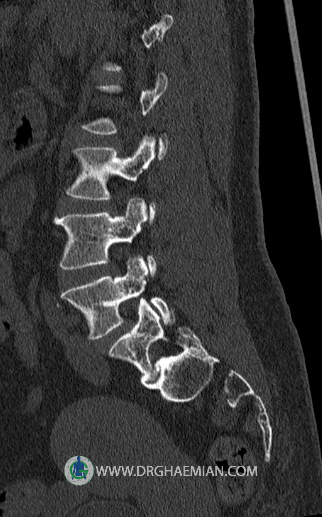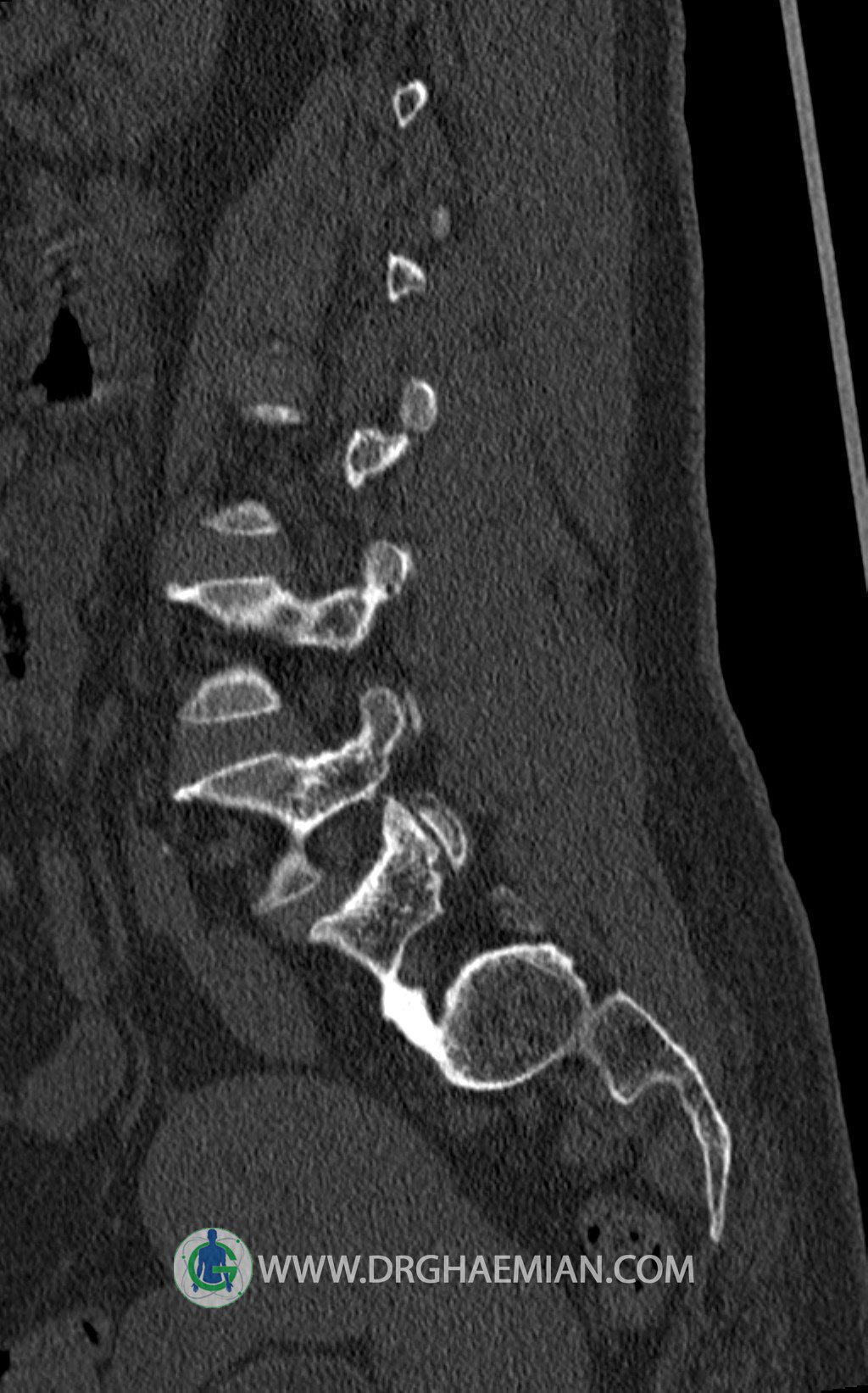 سی تی اسکن اسپيرال ازسطح تحتاني T12 تا انتهاي ساکروم (مولتي ديدکتور 16 با مقاطع ظريف و بازسازي هاي ساژيتال و کرونال و 3D):
