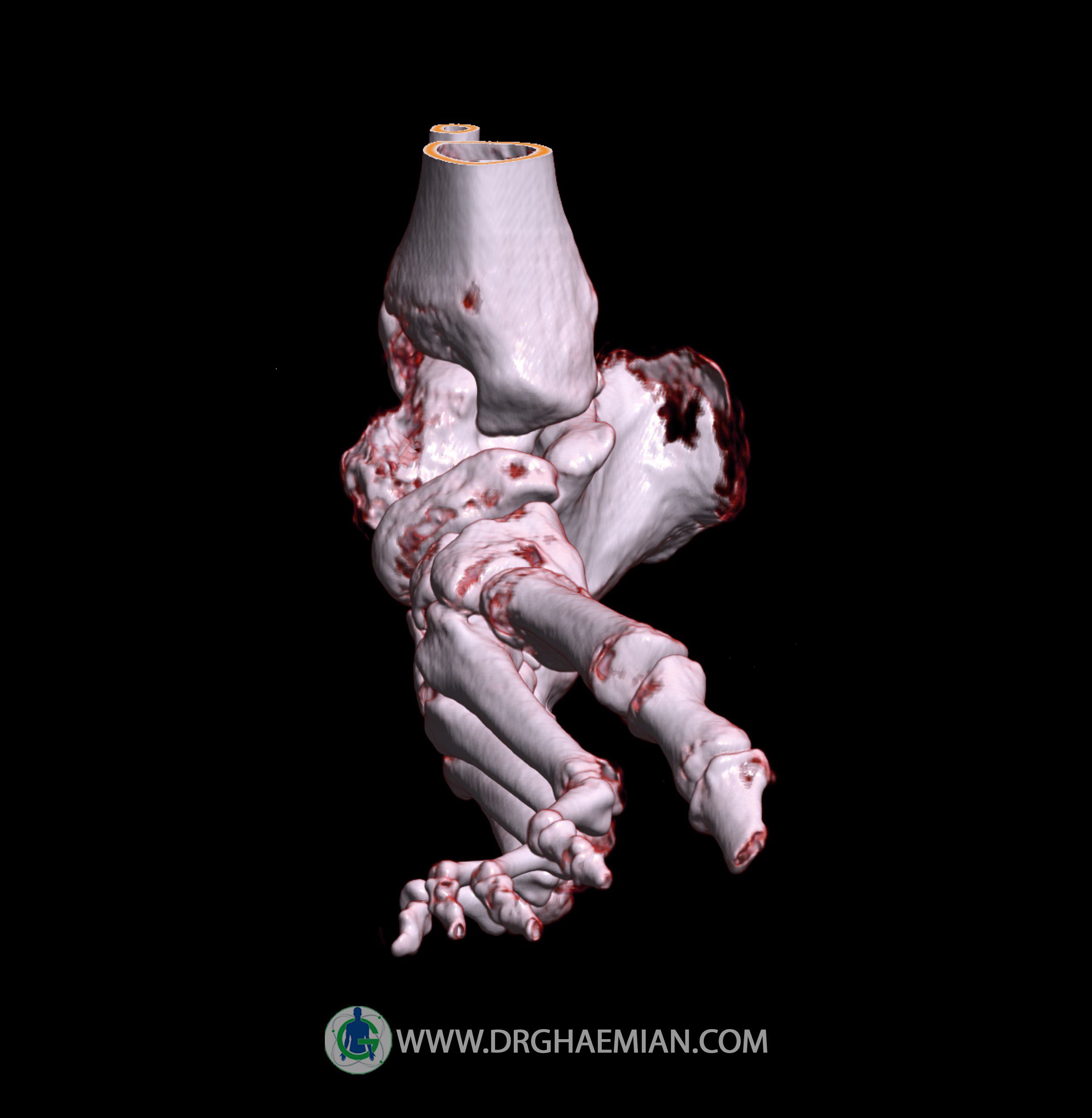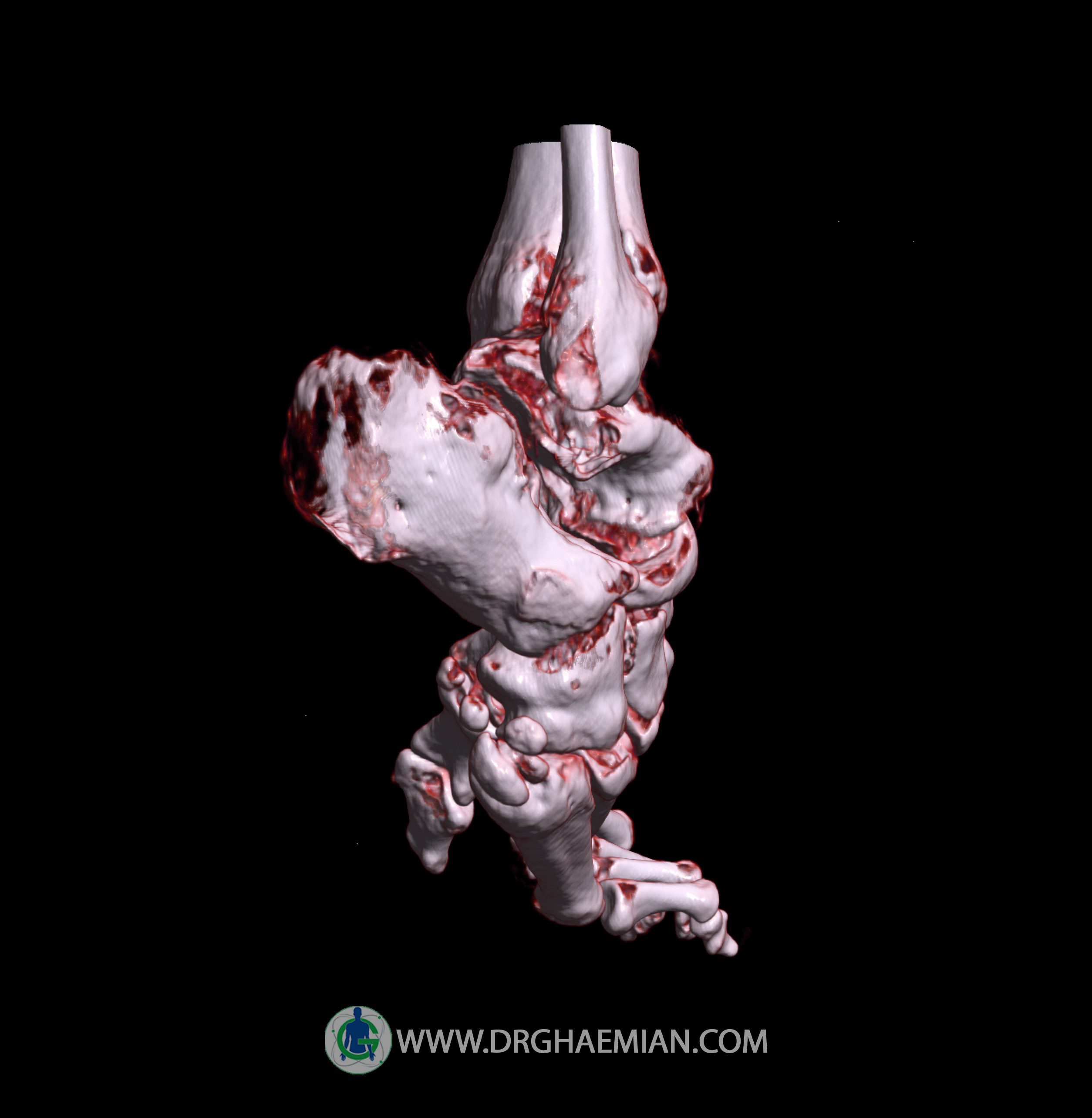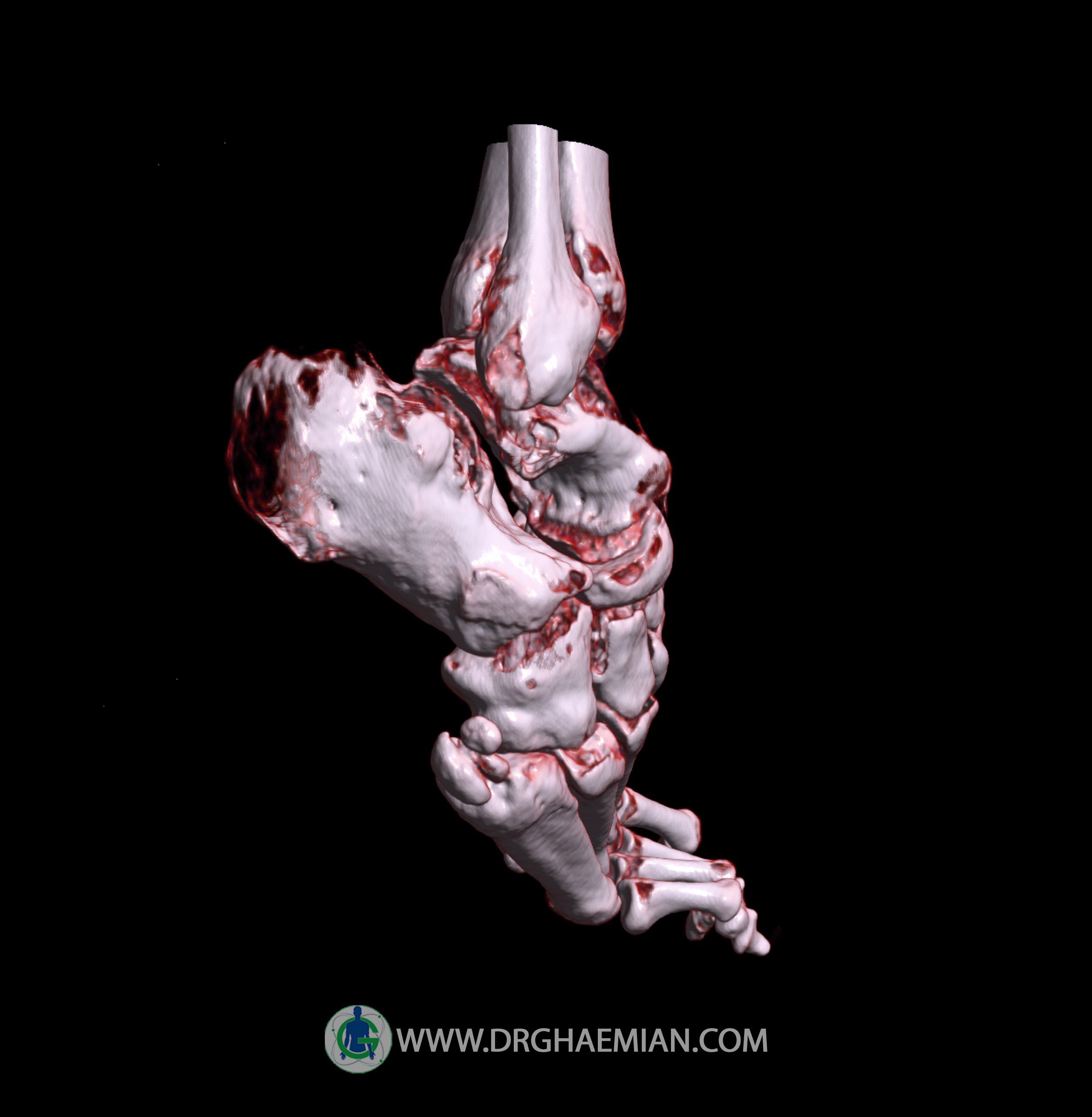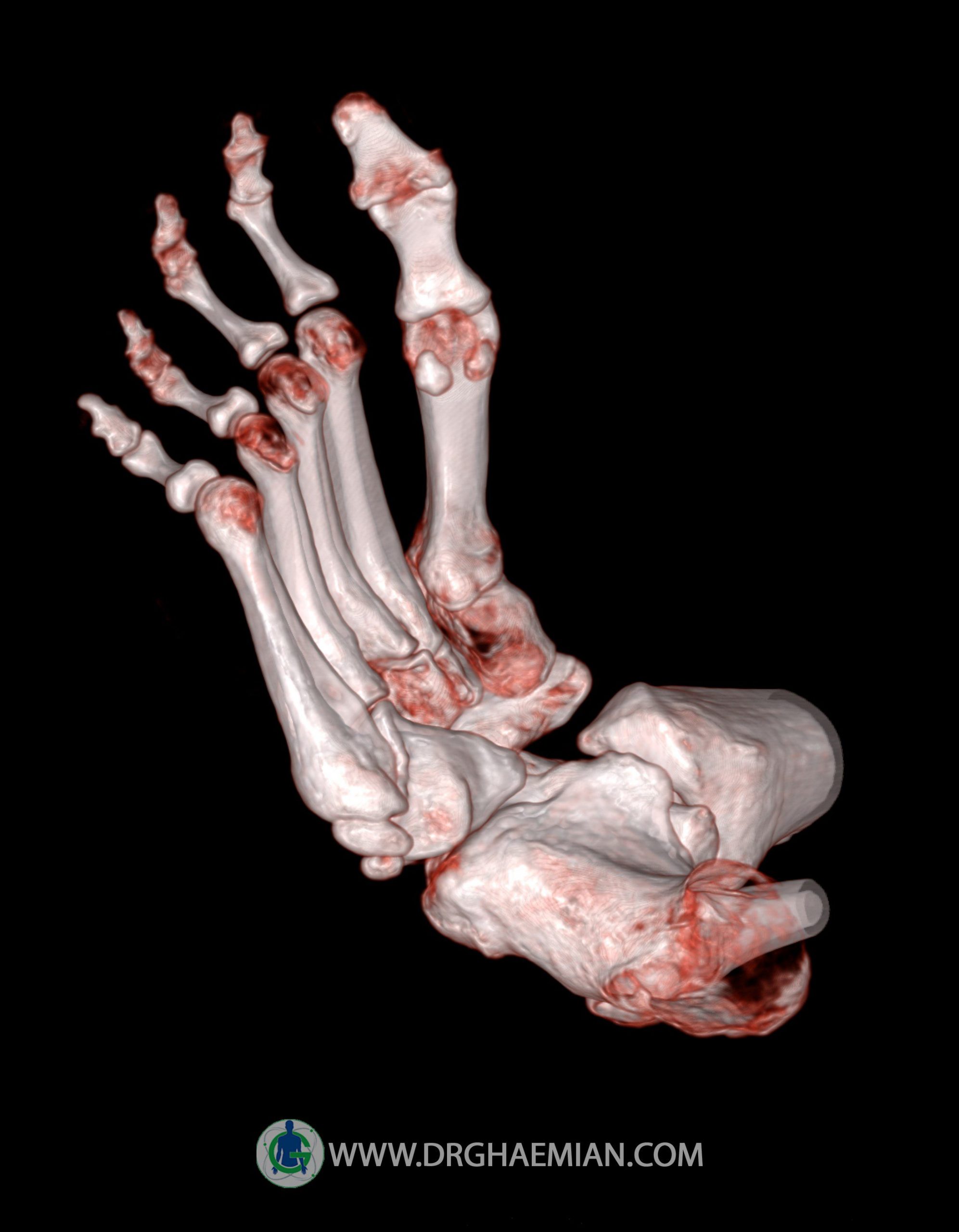 سی تی اسکن مفاصل از پرتوی نازک تششعات و حلقه ایی از تششعات که به سرعتی بالا حرکت می کنند برای گرفتن اطلاعات از زوایای مختلف استفاده می کند که خود برای ایجاد تصاویر عرضی مقطعی استفاده می شود. در این سی تی اسکن پاچنبری و تورم نسج نرم دیده می شود.