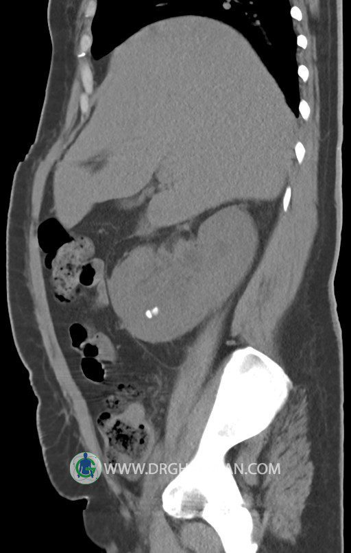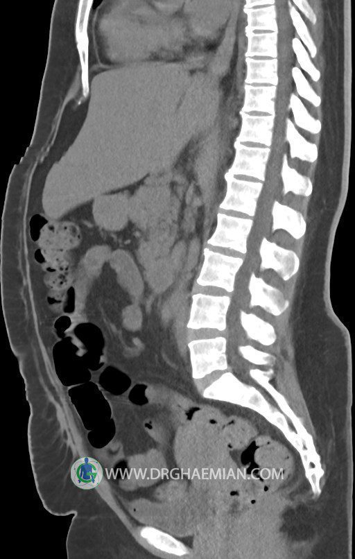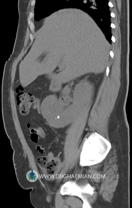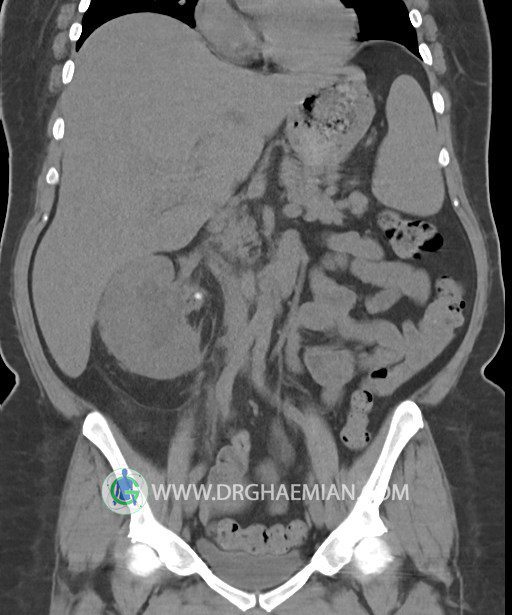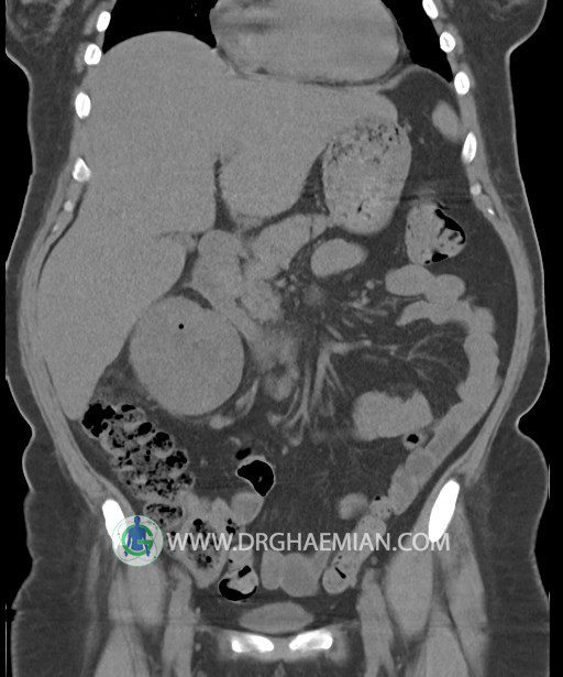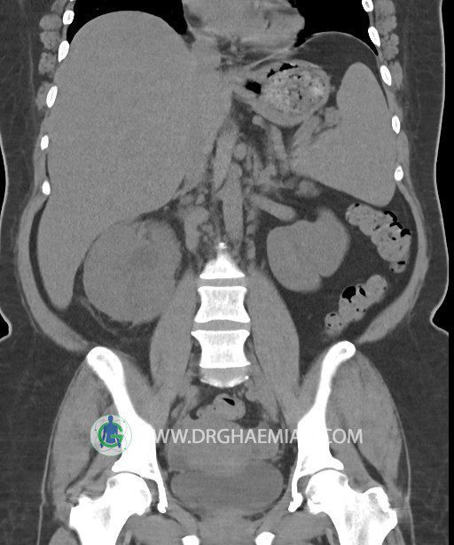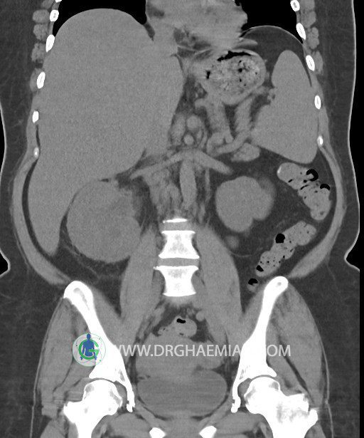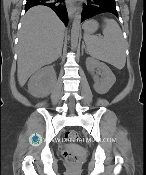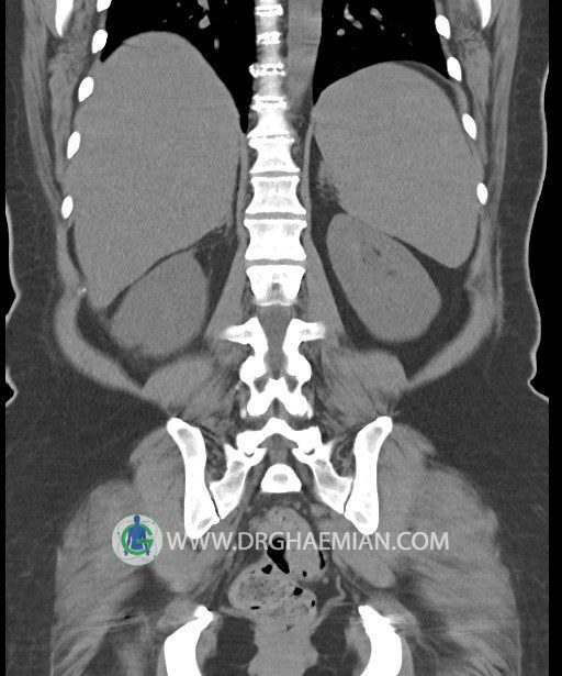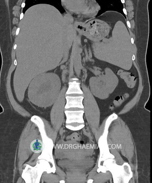 در سي تي اسکن اسپيرال شکم و لگن بدون کنتراست (مولتي ديدکتور 16 با مقاطع ظريف و بازسازي هاي ساژيتال و کرونال):
