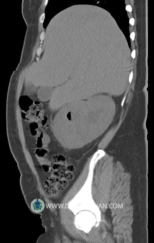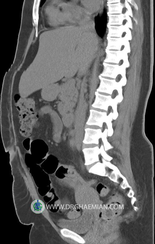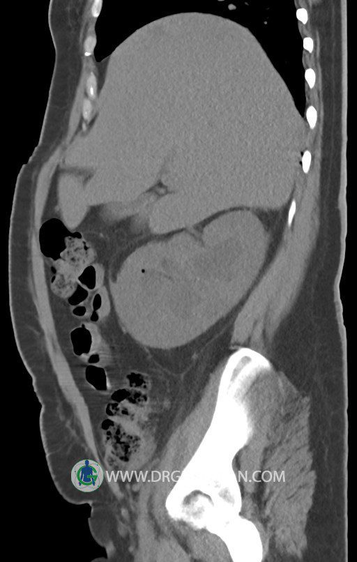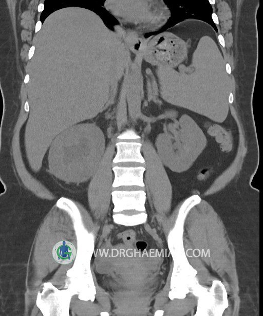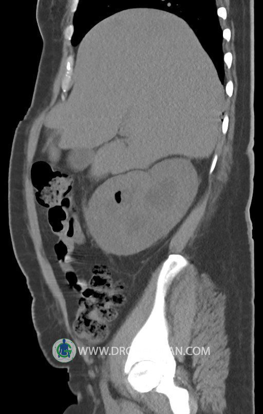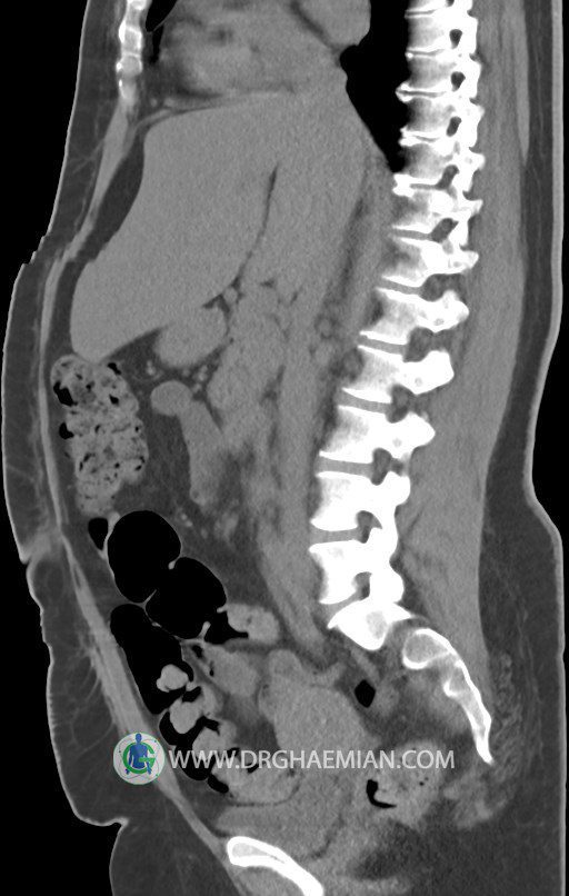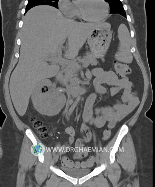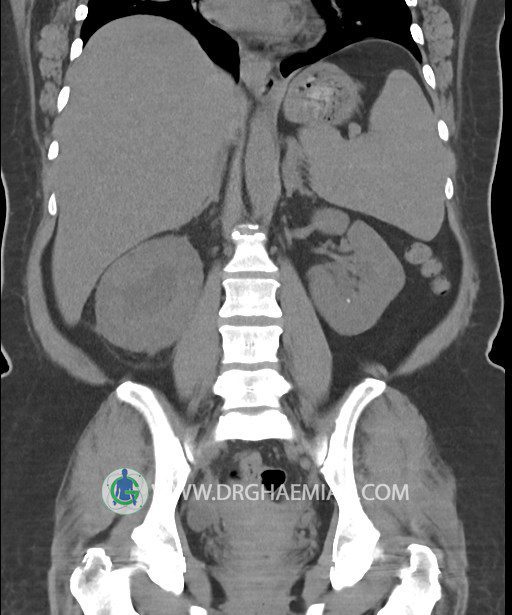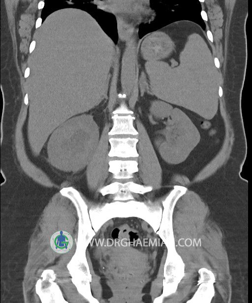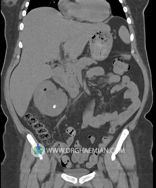 در سي تي اسکن اسپيرال شکم و لگن بدون کنتراست (مولتي ديدکتور 16 با مقاطع ظريف و بازسازي هاي ساژيتال و کرونال):