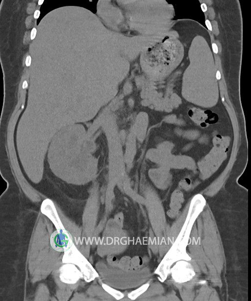 – دانسيته حاجب در سمت راست حفره لگن خارج از مسير حالب بوده و فله بوليت مي باشد. ( بدون تغيير نسبت به سي تي اسکن قبل )