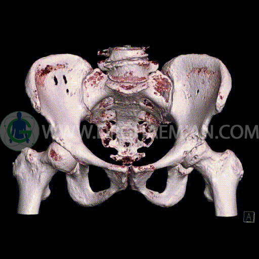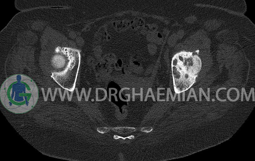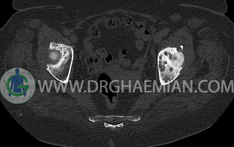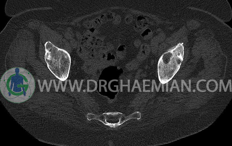 سی تی اسکن لگن یک روش تصویربرداری است که از تشعشعات برای ایجاد تصاویر عرضی مقطعی از نایحه بین استخوان های لگن استفاده می کند. در این کیس ژئود لگن به همراه تغییرات دژنراتیو در دو لگن مشاهده می شود.