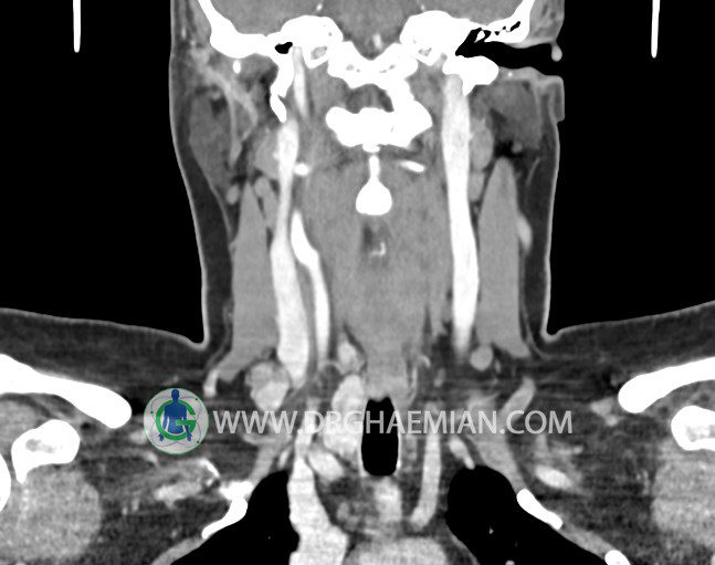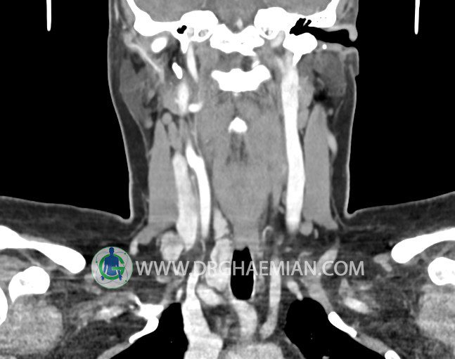 در سي تي اسکن اسپيرال از گردن با تزريق (مولتي ديدکتور 16 با مقاطع ظريف و بازسازي هاي ساژيتال و کرونال):