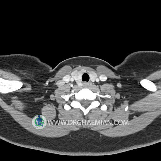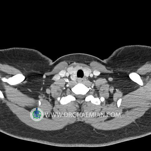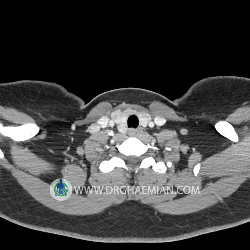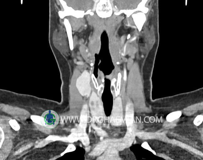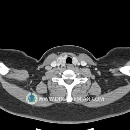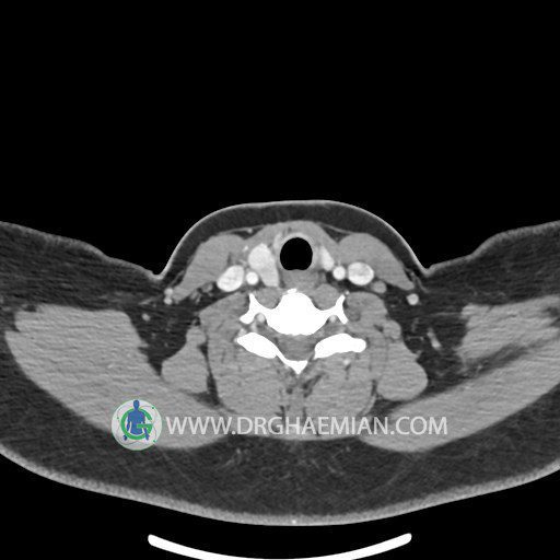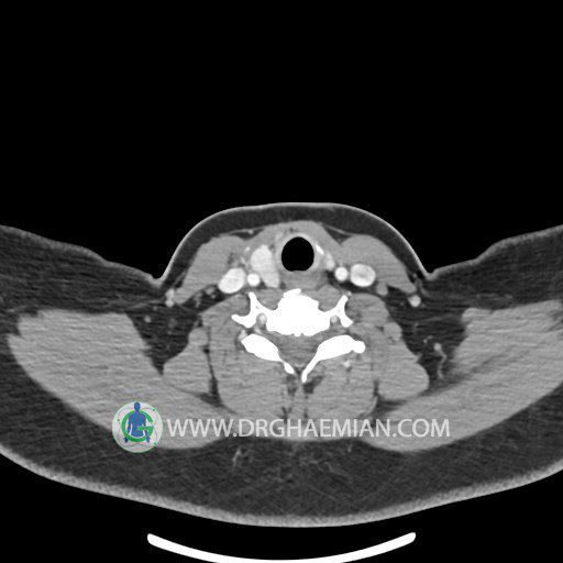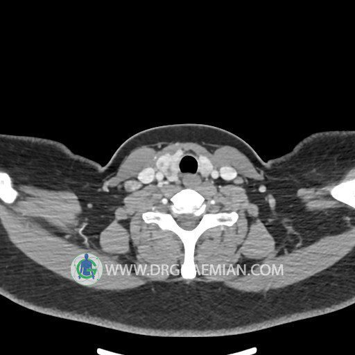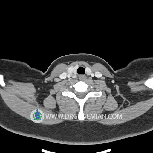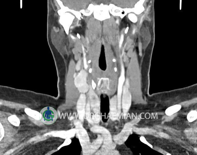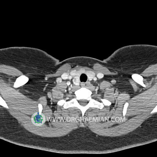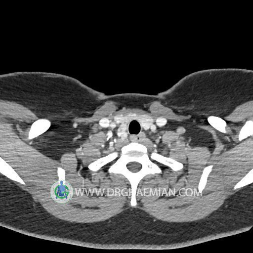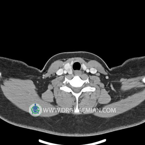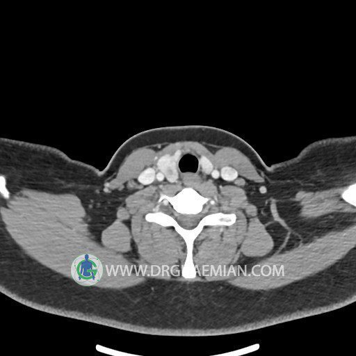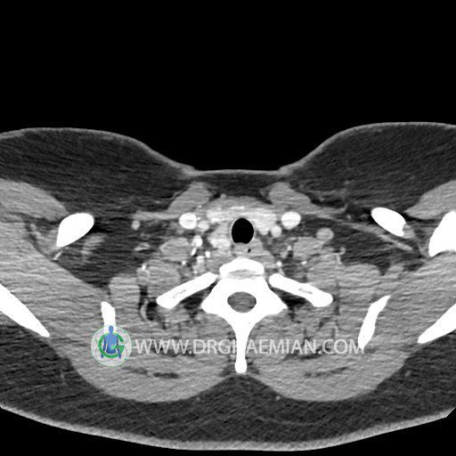 سی تی اسکن گردن یک روش تصویربرداری است که با استفاده از تشعات ایکس تصاویری با جزییات از ناحیه خالی گردن ایجاد میکند. در این کیس کارسینوم پاپیلاری تیروئید و متاستاز لنفاوی، لنفادنوپاتی مشاهده می شود.