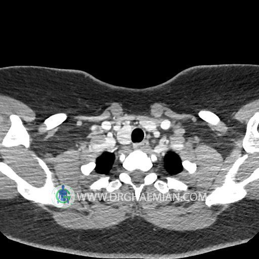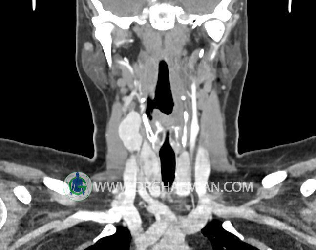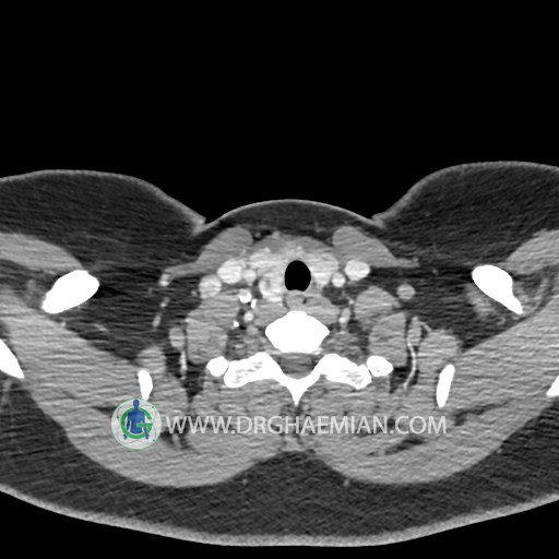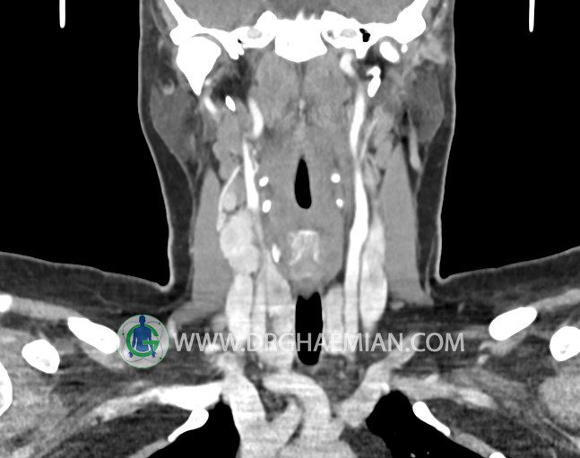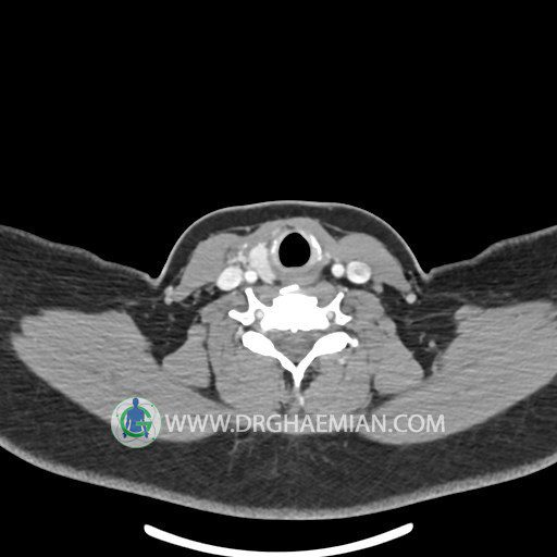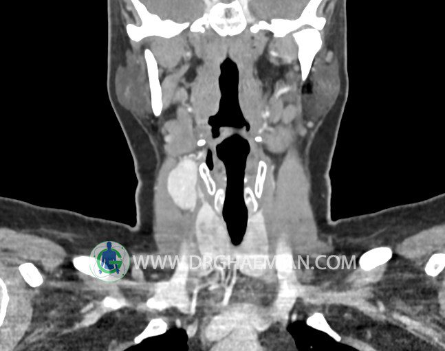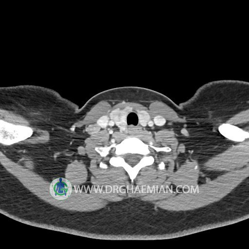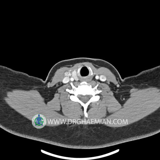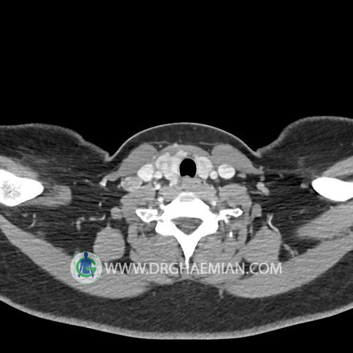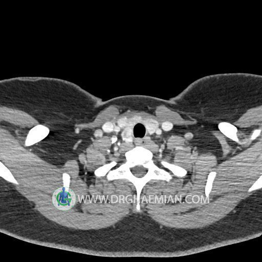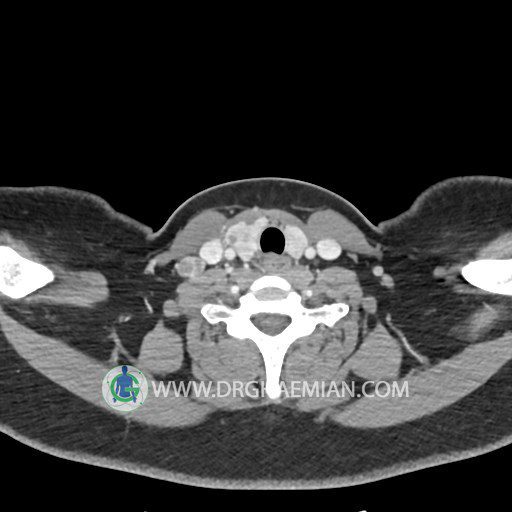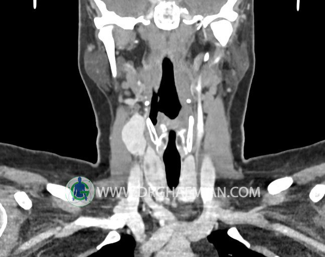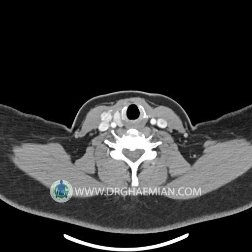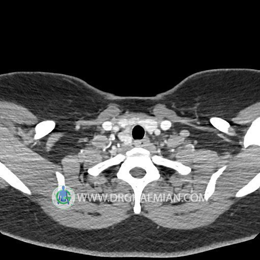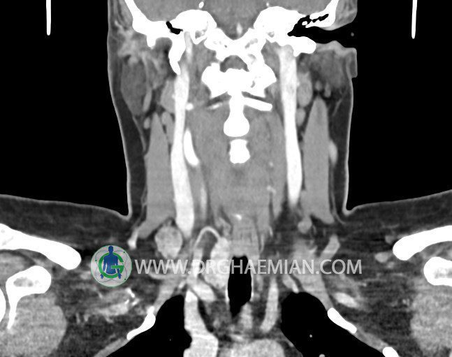 سی تی اسکن گردن یک روش تصویربرداری است که با استفاده از تشعات ایکس تصاویری با جزییات از ناحیه خالی گردن ایجاد میکند. در این کیس کارسینوم پاپیلاری تیروئید و متاستاز لنفاوی، لنفادنوپاتی مشاهده می شود.