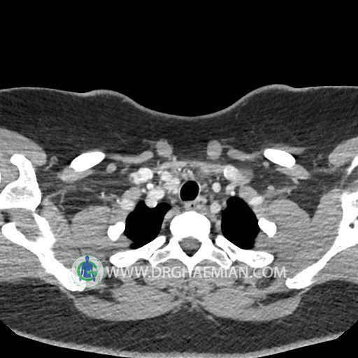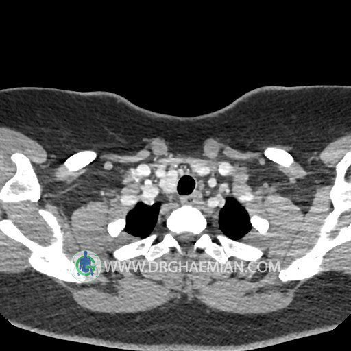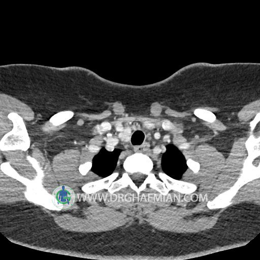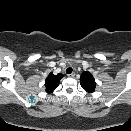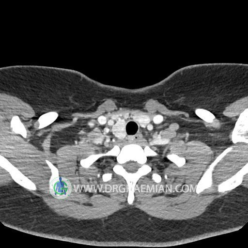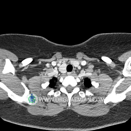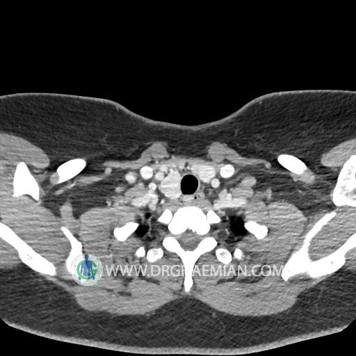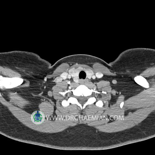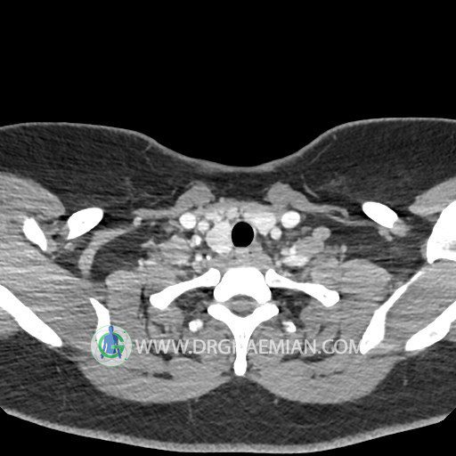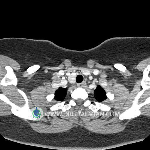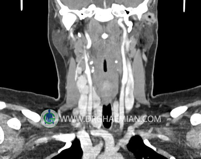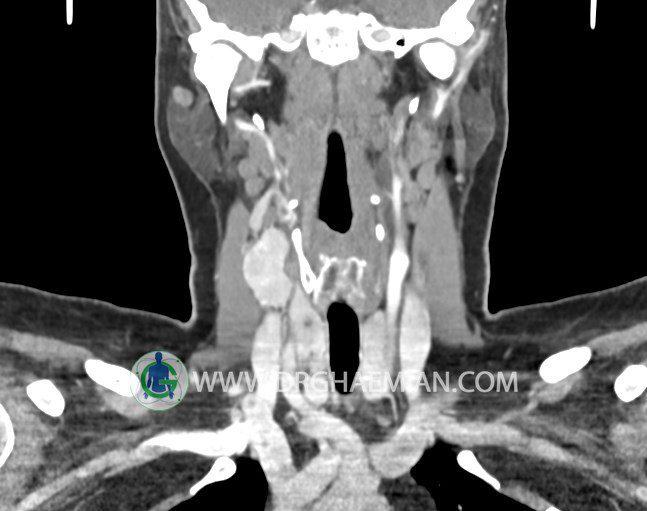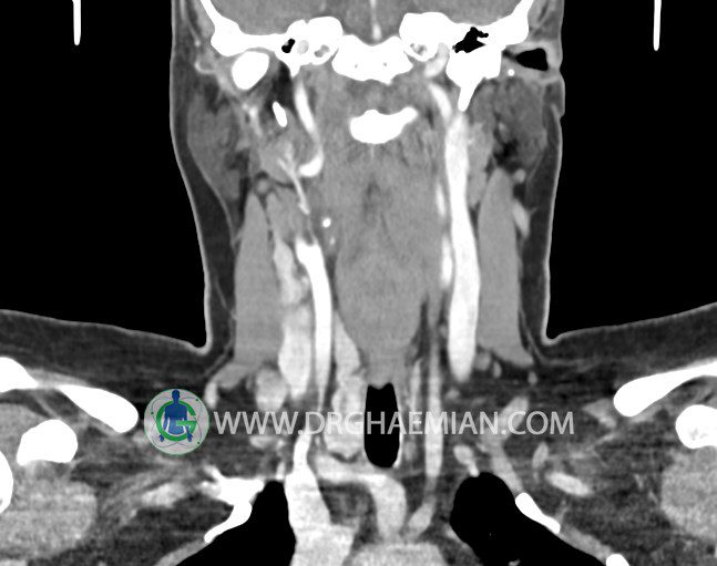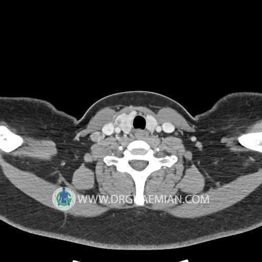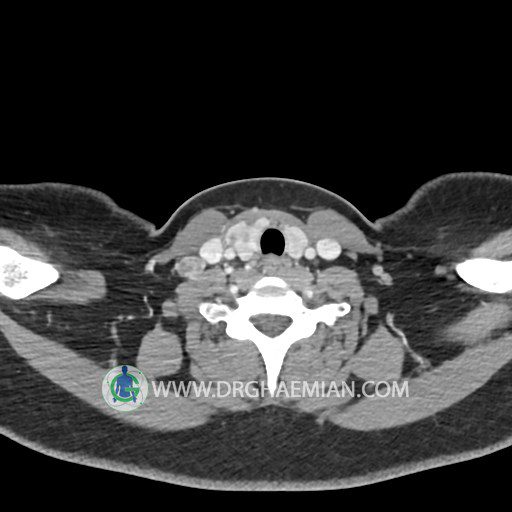 سی تی اسکن گردن یک روش تصویربرداری است که با استفاده از تشعات ایکس تصاویری با جزییات از ناحیه خالی گردن ایجاد میکند. در این کیس کارسینوم پاپیلاری تیروئید و متاستاز لنفاوی، لنفادنوپاتی مشاهده می شود.