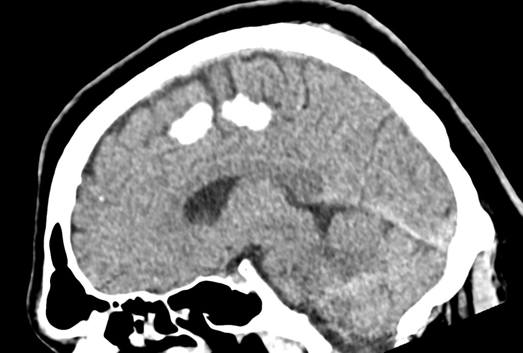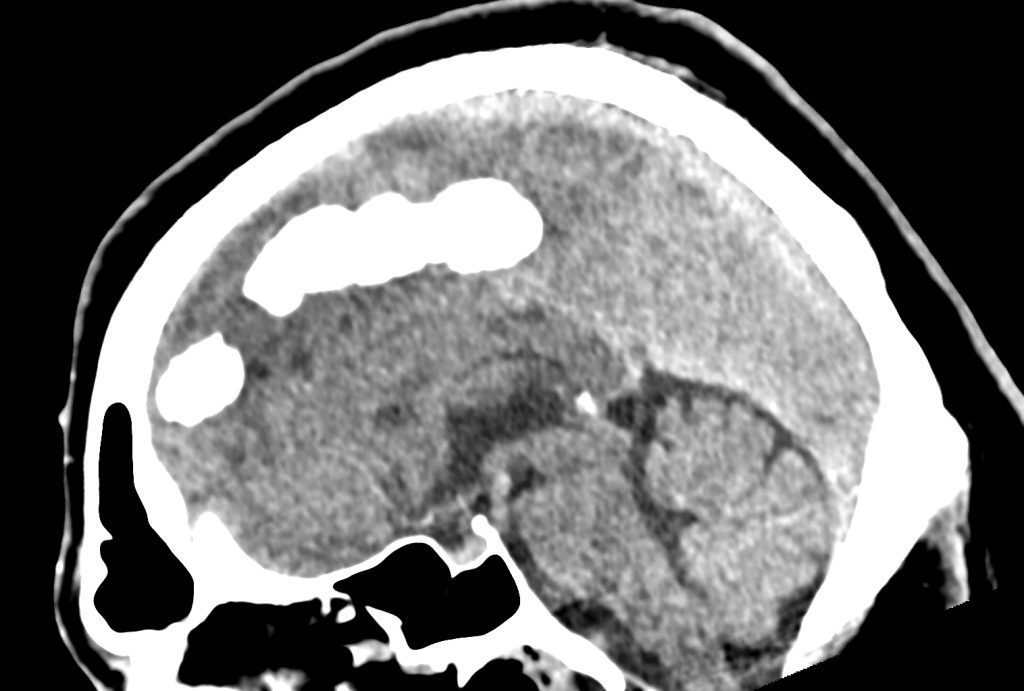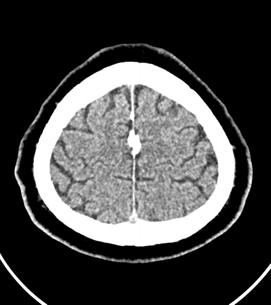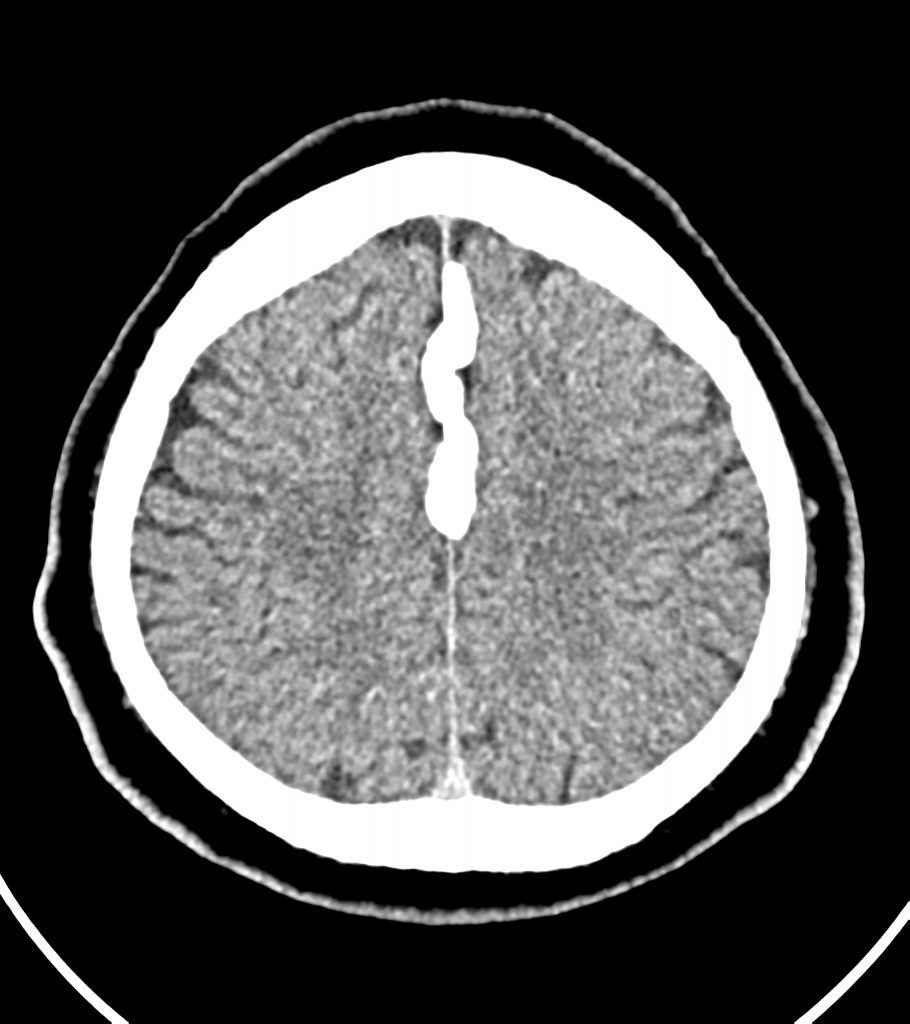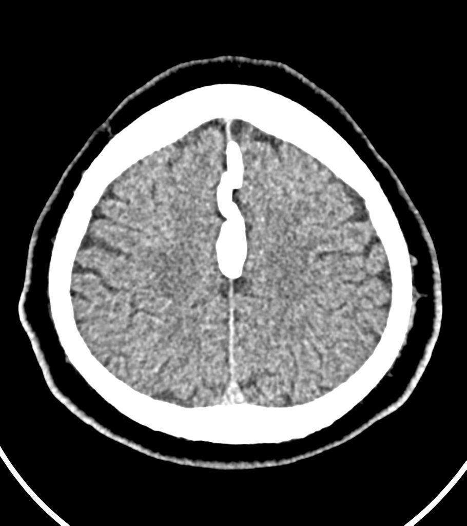 کلسيفيکاسيون دنس به ابعاد mm 10 x 60 در قسمت انتريور falx cerebri مشهود است .