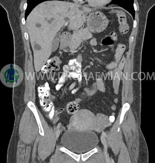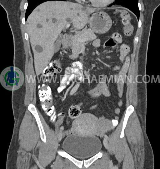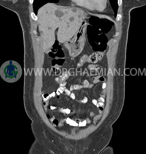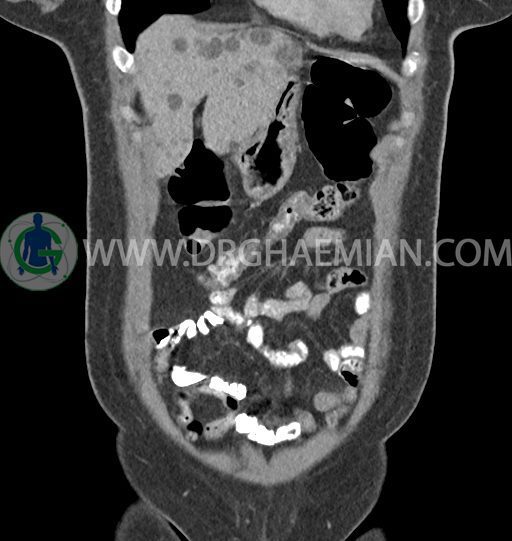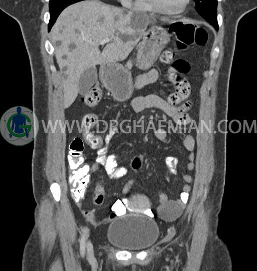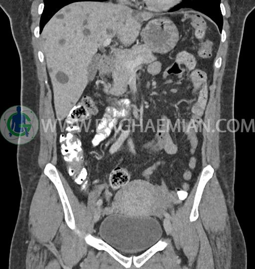مایع آزاد در حفره شکم و لگن رویت نمی شود.