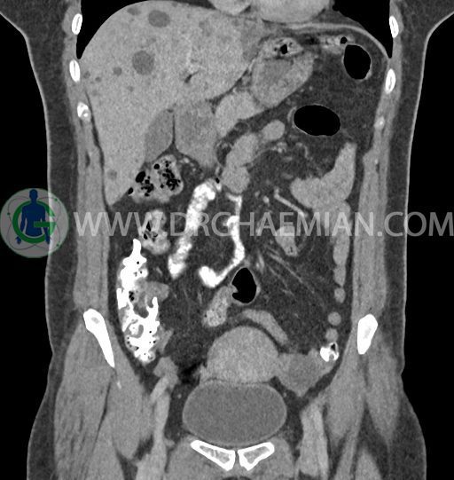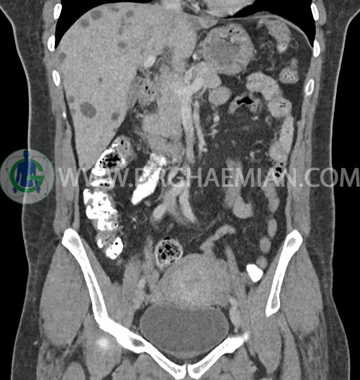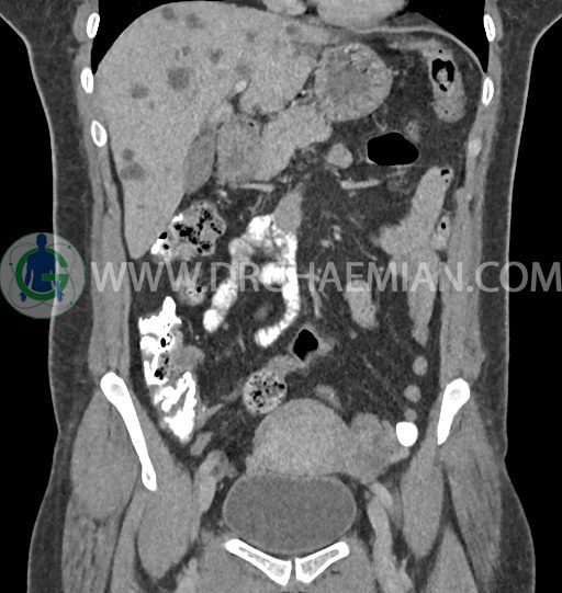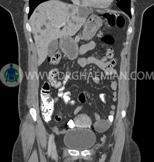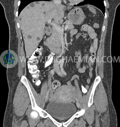 در سی تی اسکن اسپیرال شکم و لگن – 5Phasic (بدون کنتراست – با کنتراست در فاز آرتریال ، پورتال و تاخیری 5 دقیقه و 10 دقیقه، مولتی دیدکتور 16 با مقاطع ظریف و بازسازی های ساژیتال و کرونال) :