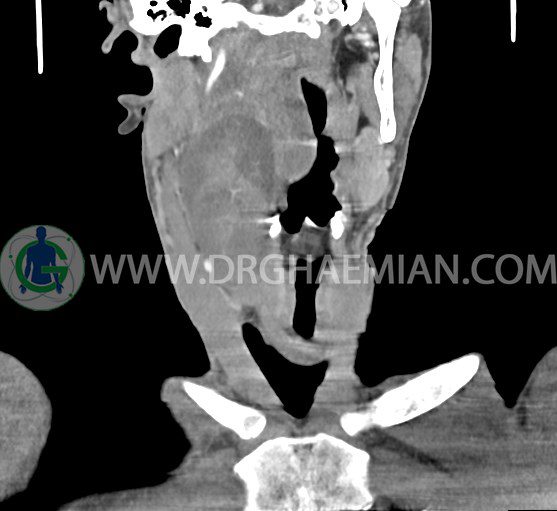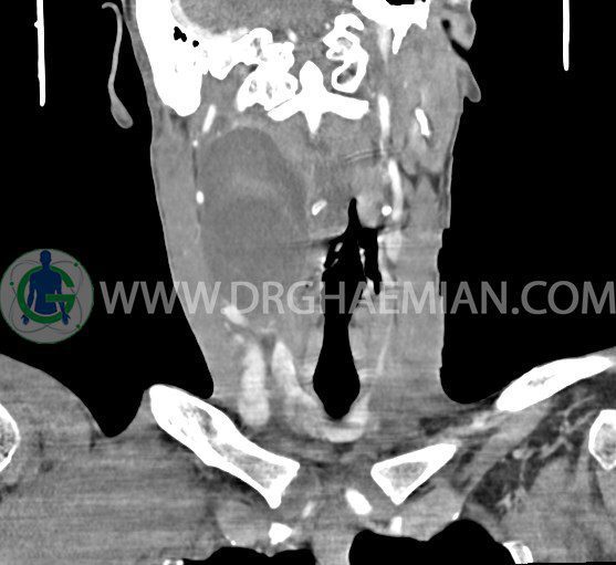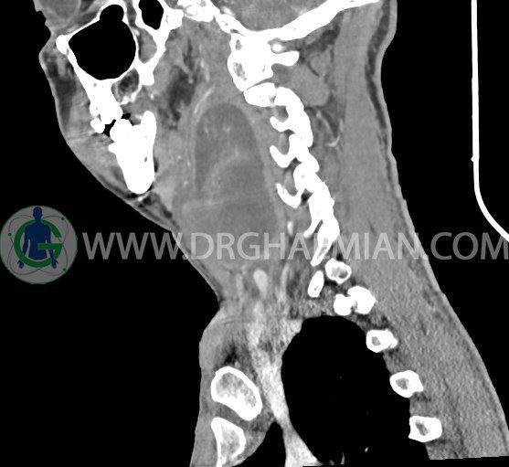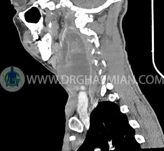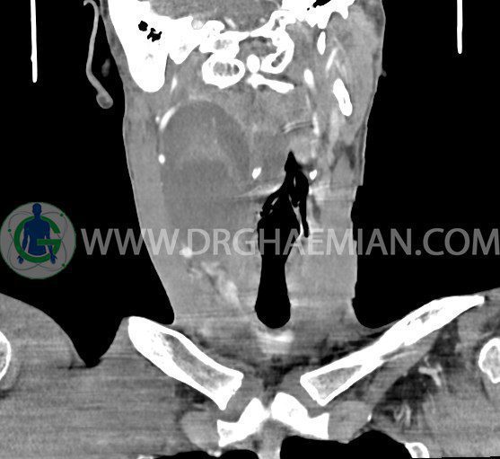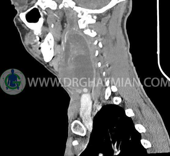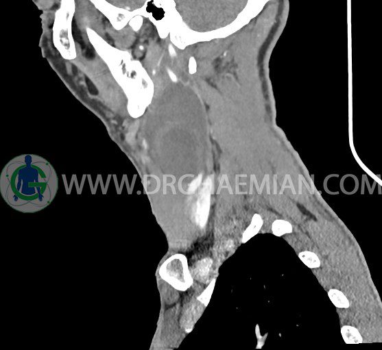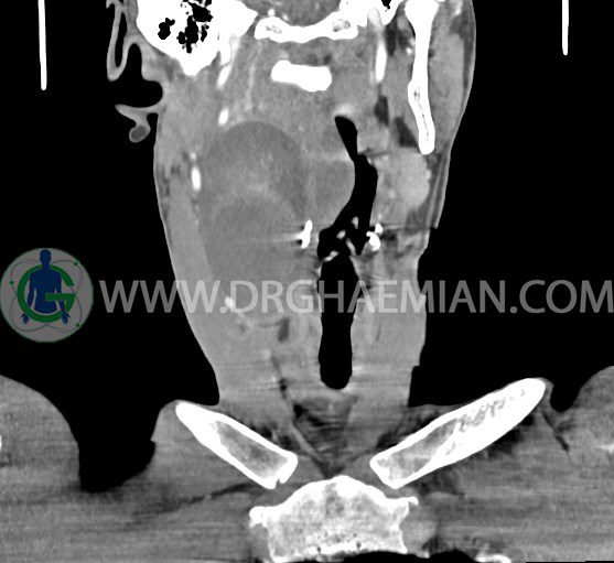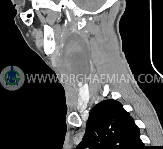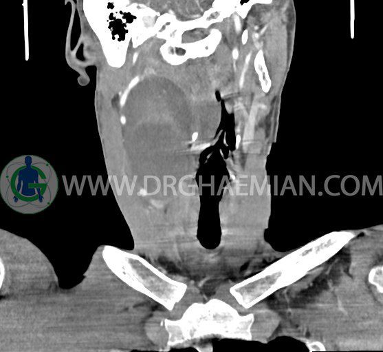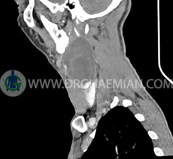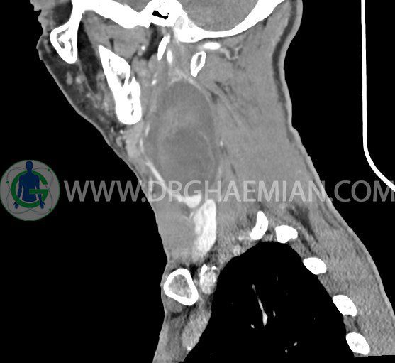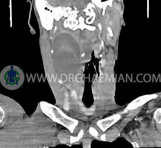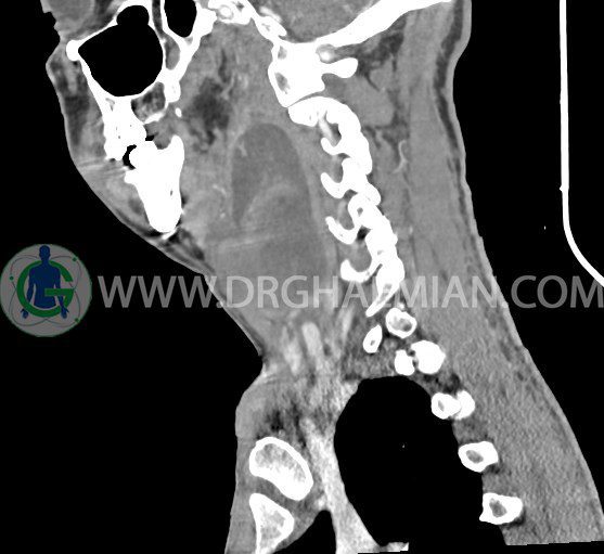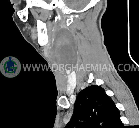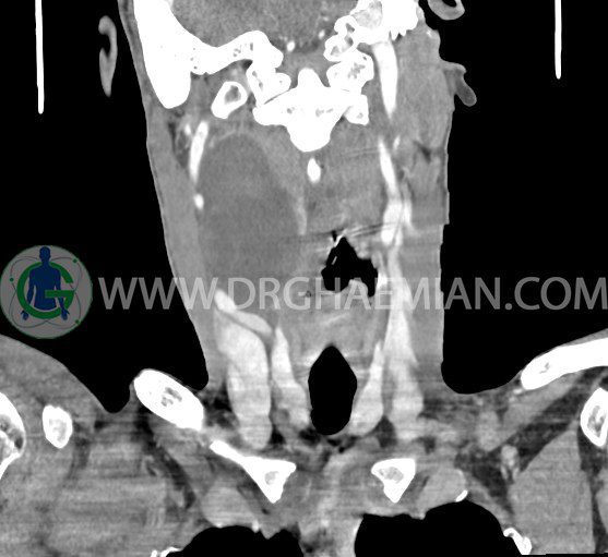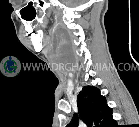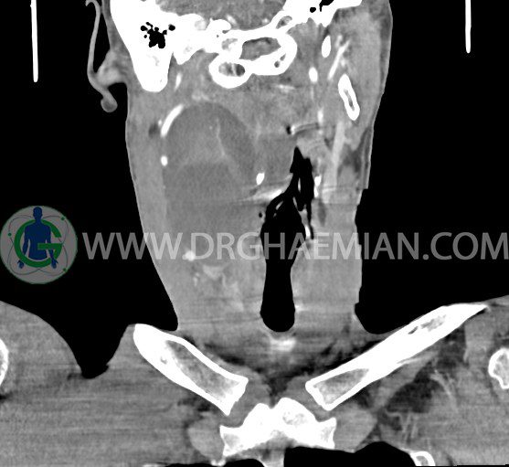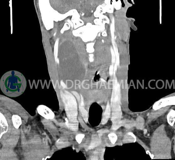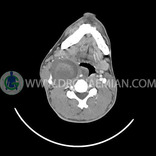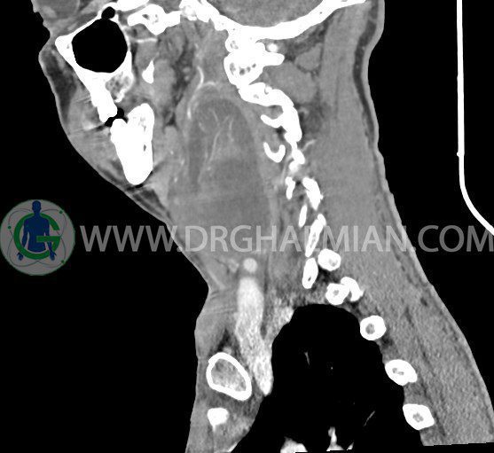 سی تی اسکن گردن (ناحیه گردنی ستون فقرات) تصاوری عرضی از گردن ایجاد می کند. این روش تصویر برداری از اشعه ایکس استفاده می کند. در این کیس کیست یزرگ گردن و باریک شدن نسبی مسیر ایروفارنژیال مشاهده می شود.