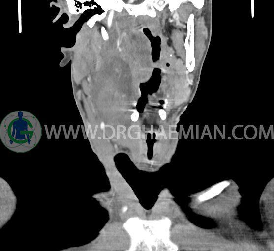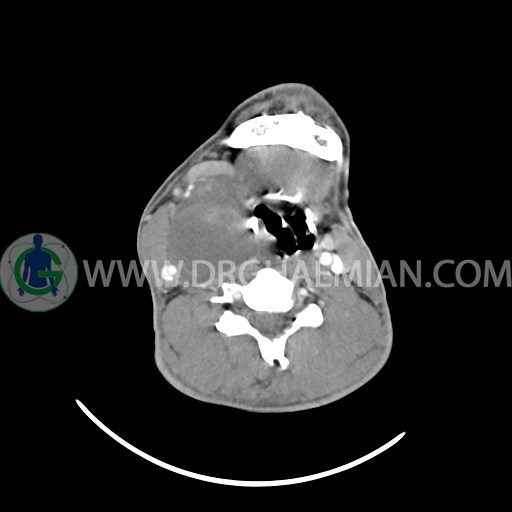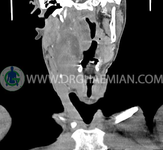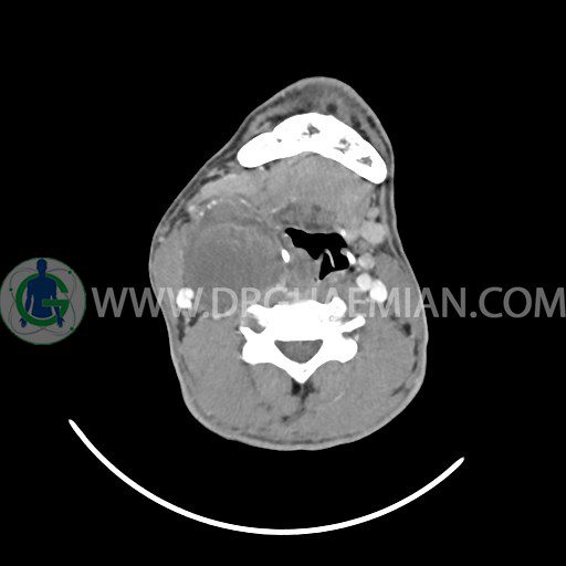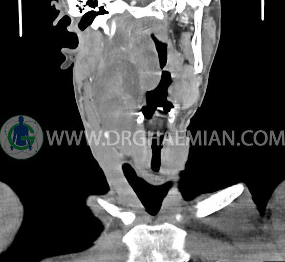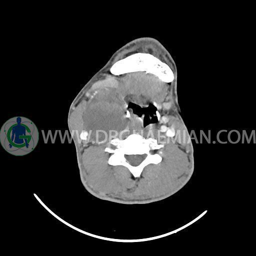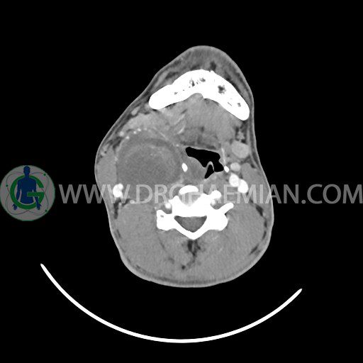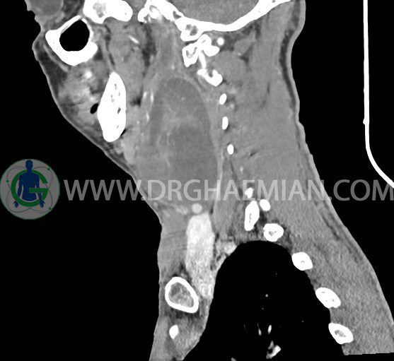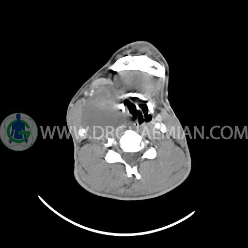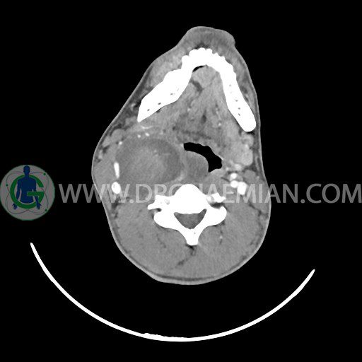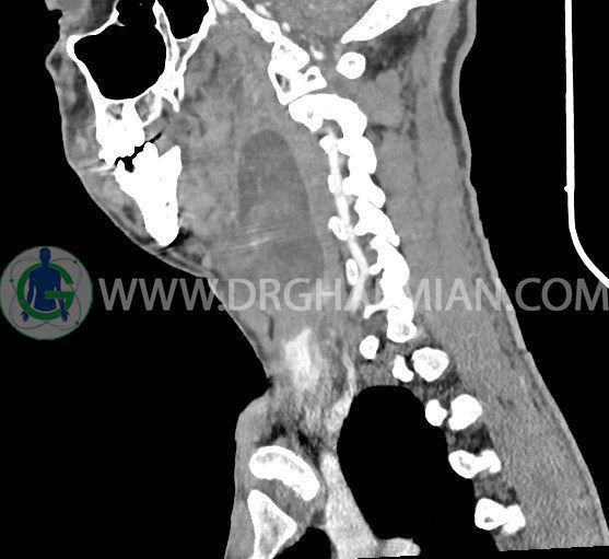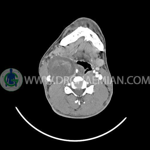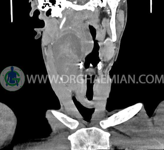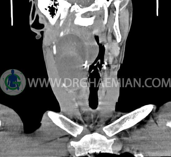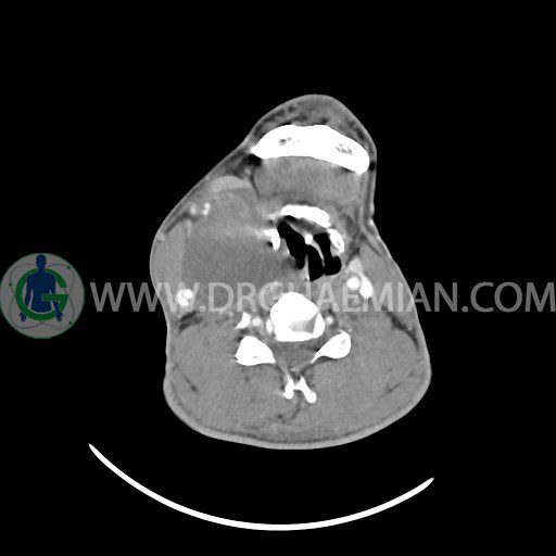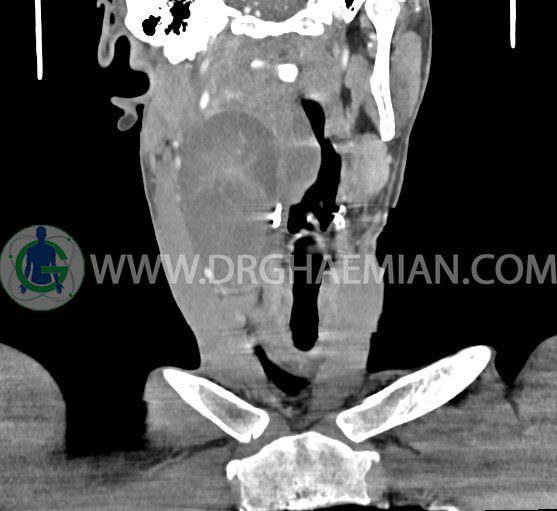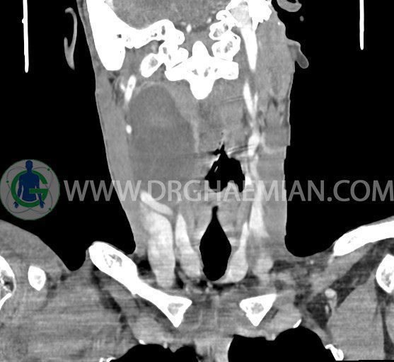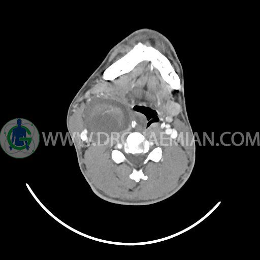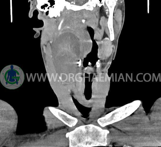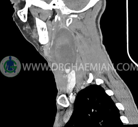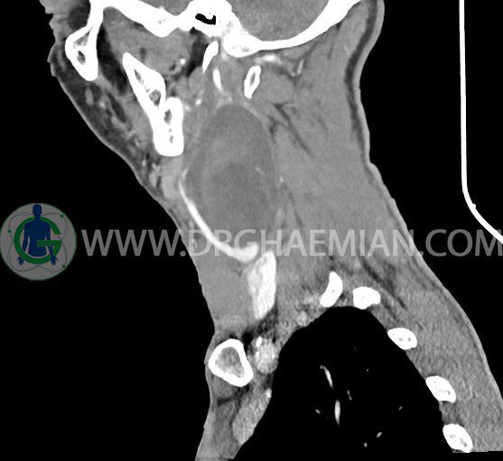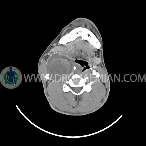 سی تی اسکن گردن (ناحیه گردنی ستون فقرات) تصاوری عرضی از گردن ایجاد می کند. این روش تصویر برداری از اشعه ایکس استفاده می کند. در این کیس کیست یزرگ گردن و باریک شدن نسبی مسیر ایروفارنژیال مشاهده می شود.