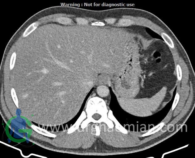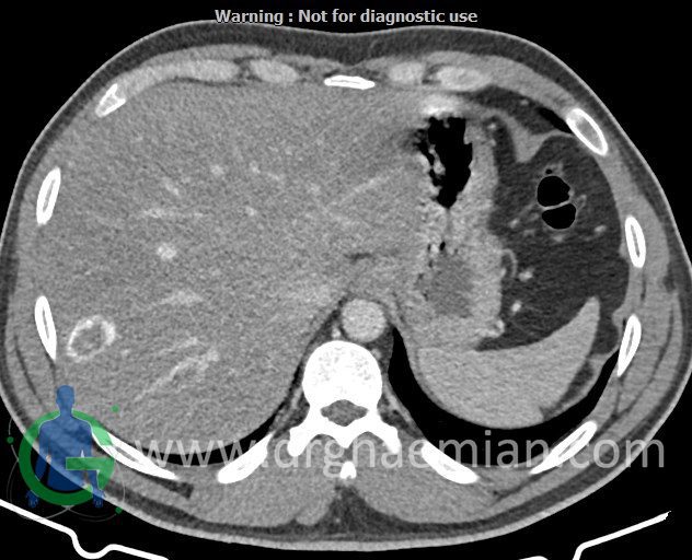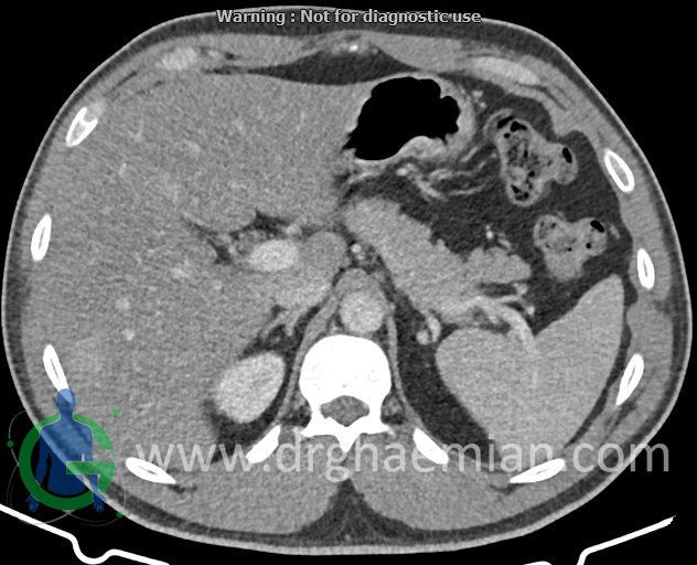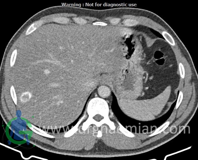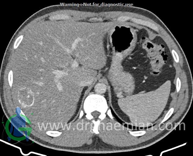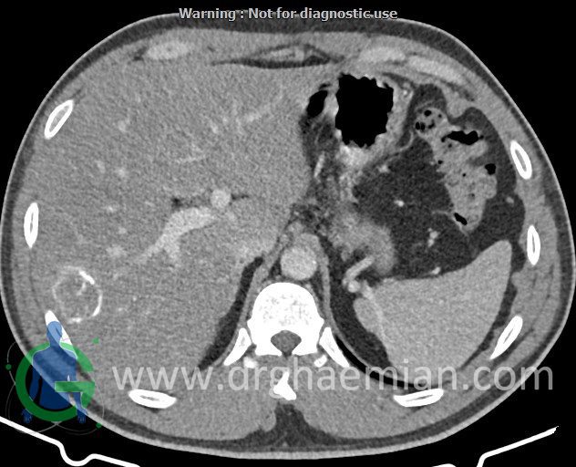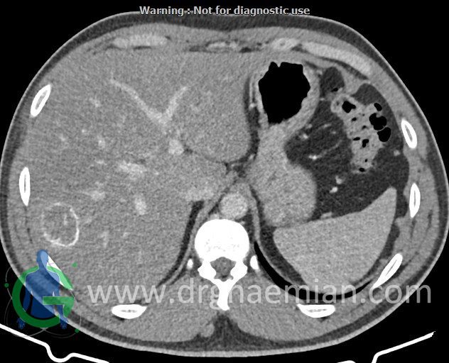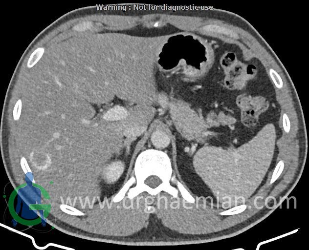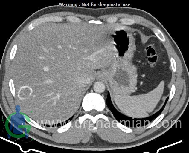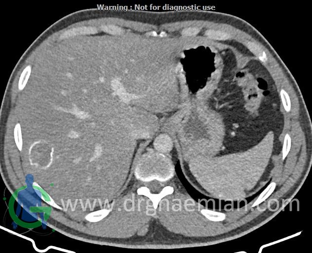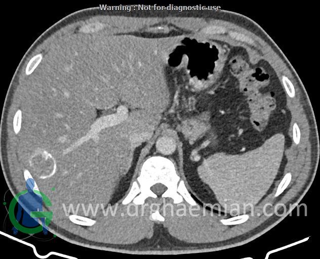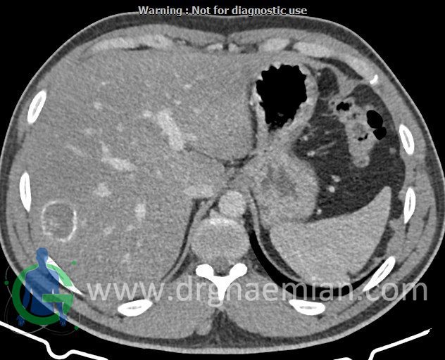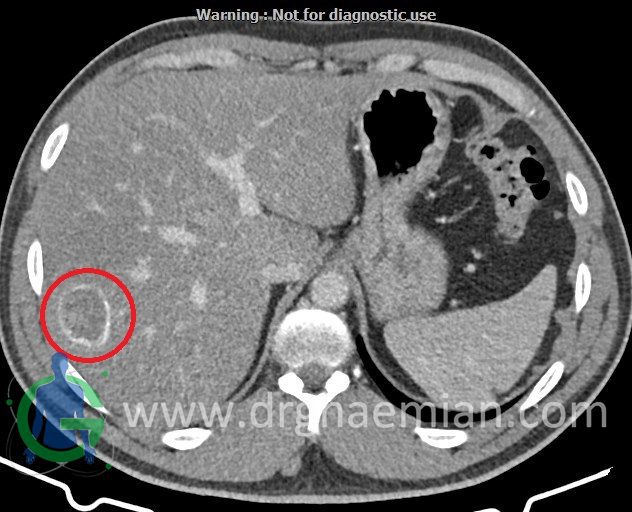 – ضایعه ی هیپودنس فاقد Enhancement با حدودی معین حاوی complete rim calcification جداری به ابعاد 38x27mm در سگمان 7 کبد مشهود است که مطرح کننده یtype III calcified hydatid cyst (died cyst) می باشد.