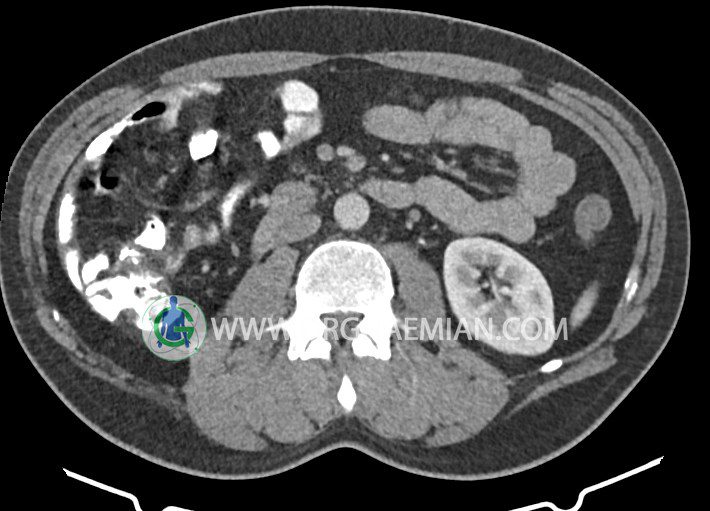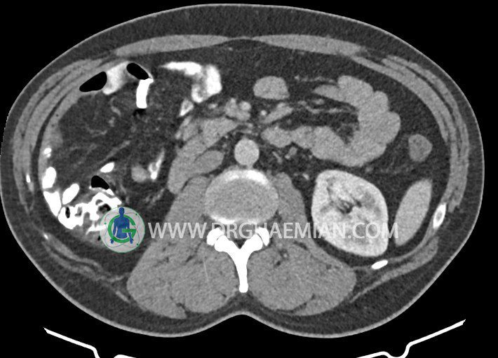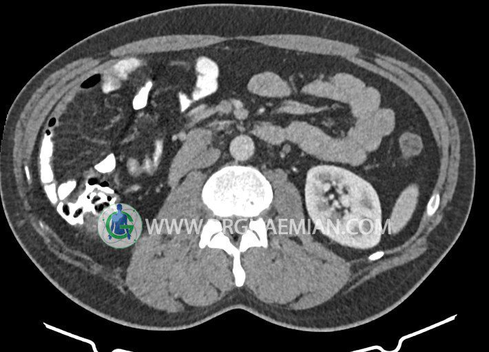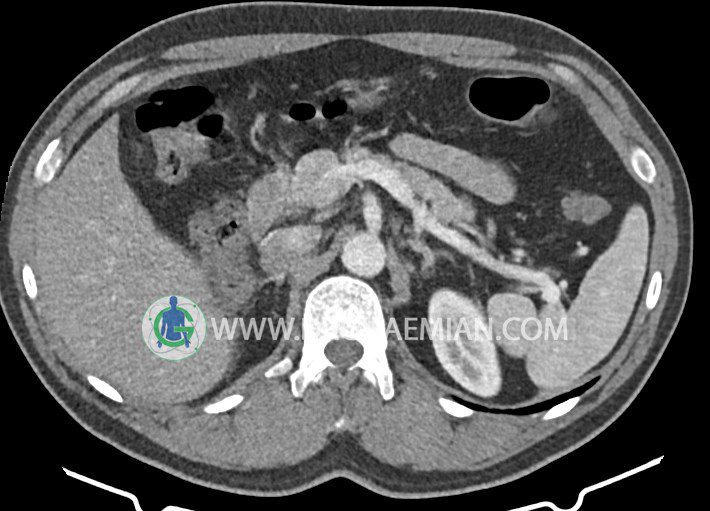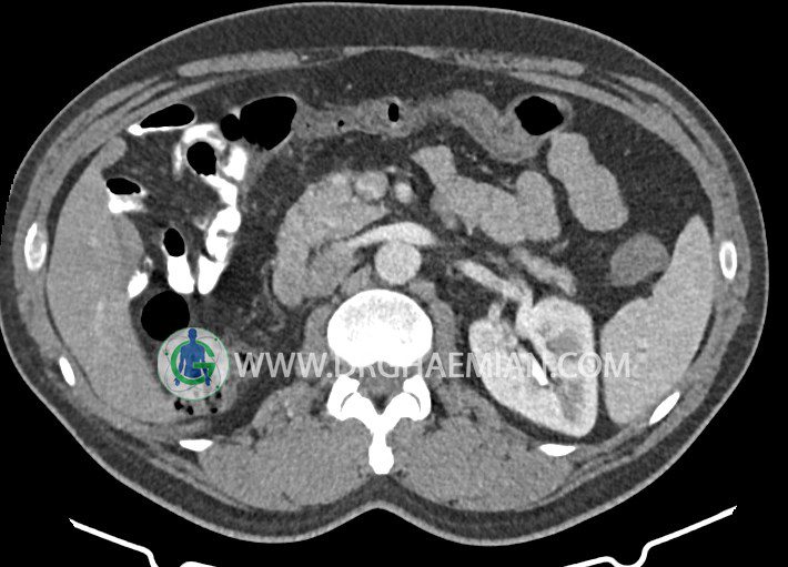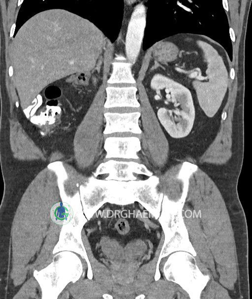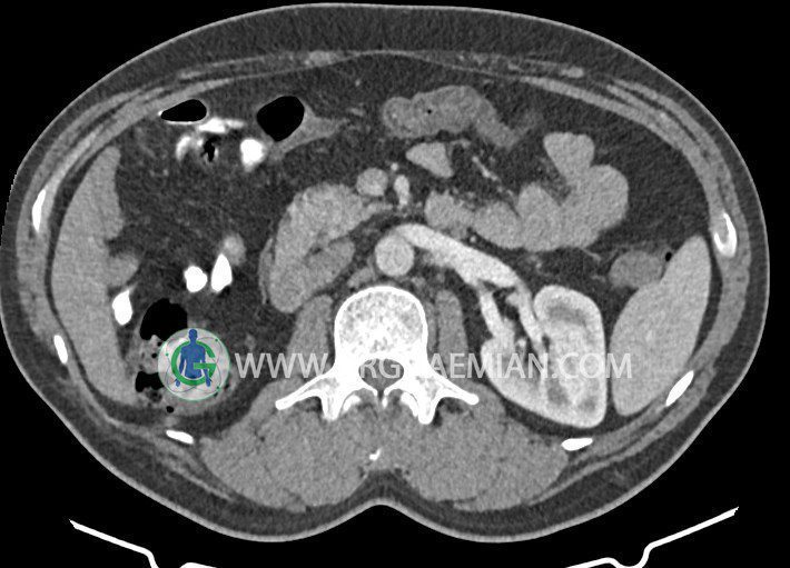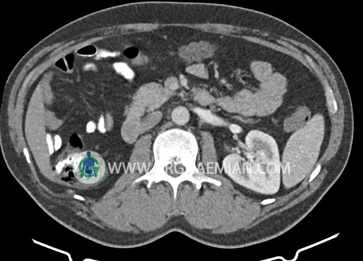 سی تی اسکن شکم یکی از روش های تصویربرداری با سی تی اسکن است. این روش با استفاده از اشعات ایکس تصاویر عرضی از ناحیه شکمی ایجاد میکند. در این کیس کیست کبدی به ابعاد mm 12 x 7، نشانه های نفرکتومی، تغییرات DJD در L5/S1 و هرنی نافی کوچک مشاهده می شود.