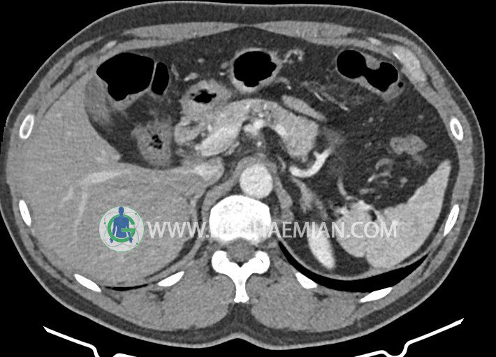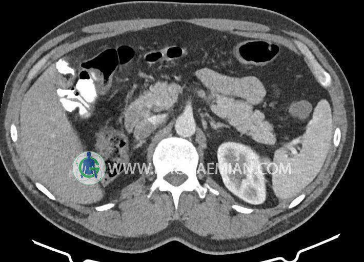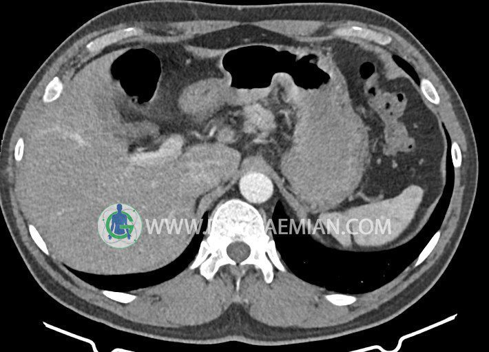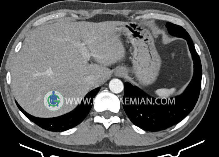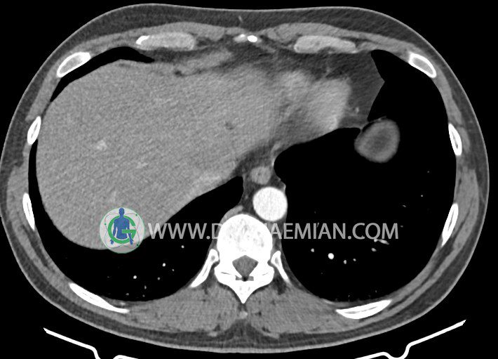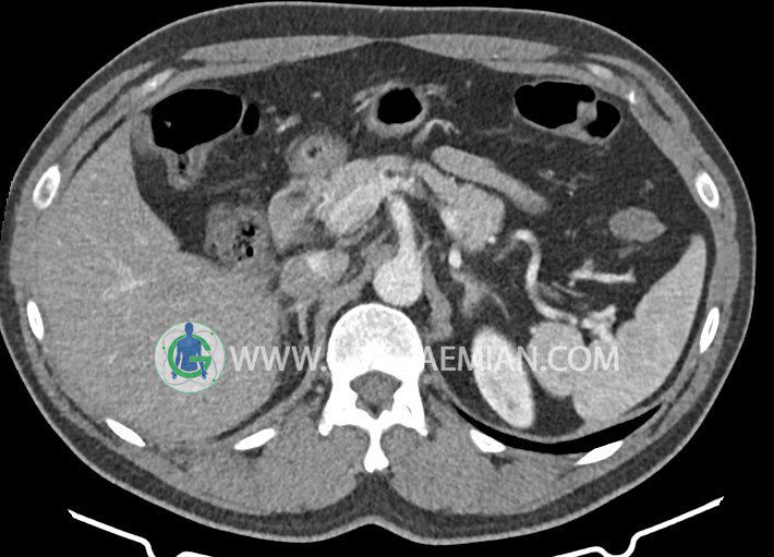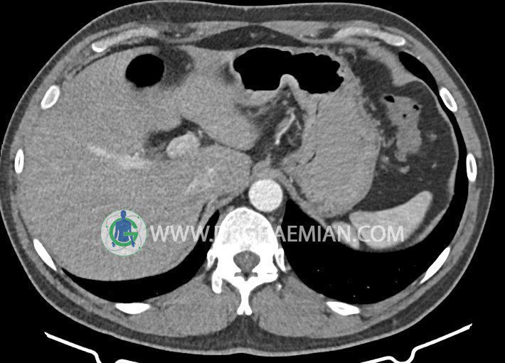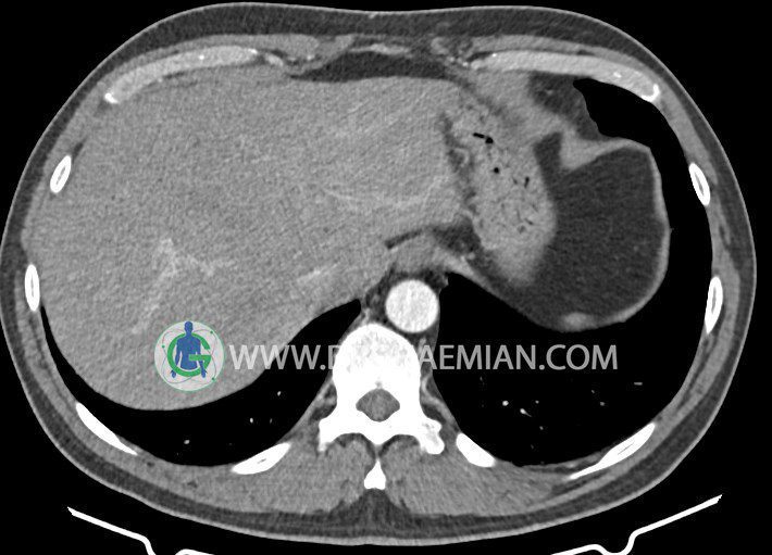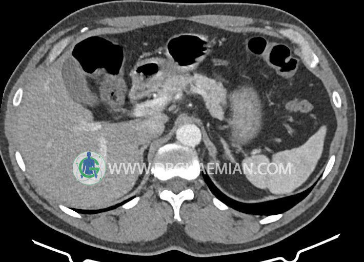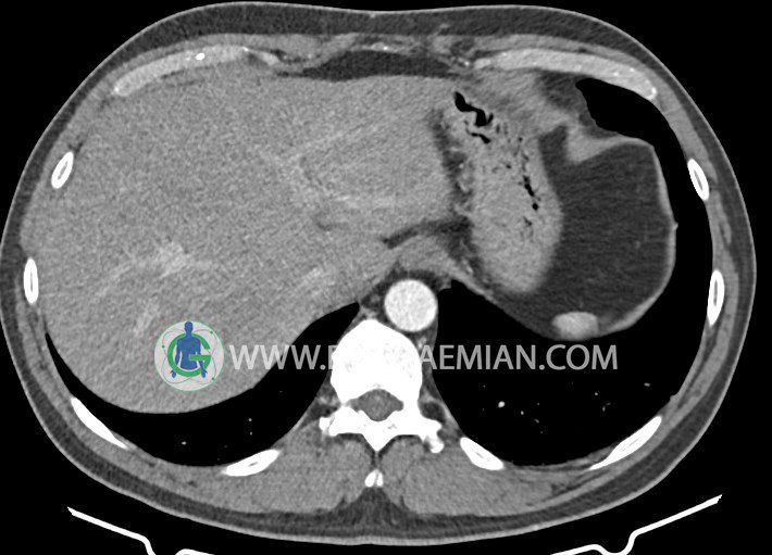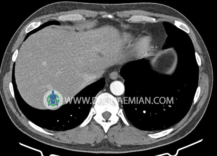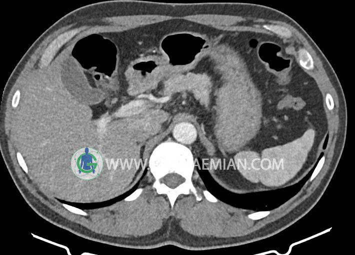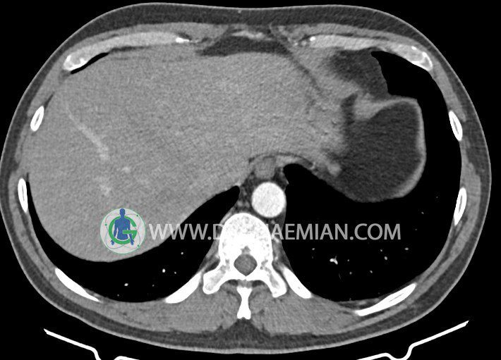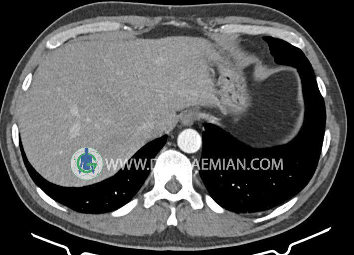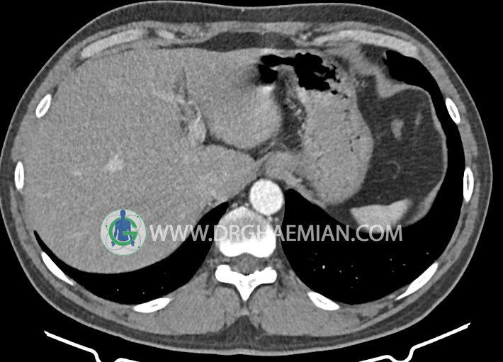 – توده هيپودنس کوچک ( HU = 15 ) به ابعاد mm 12 x 7 در سگمان 2 کبد ، بدون enhancement پس از تزريق کنتراست مطرح کننده کیست کبدی