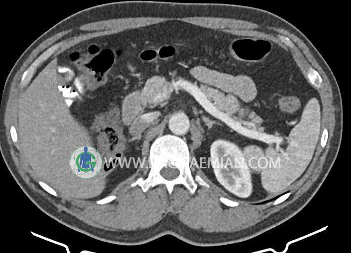 مايع آزاد در حفره شکم و لگن رويت نمی شود.
