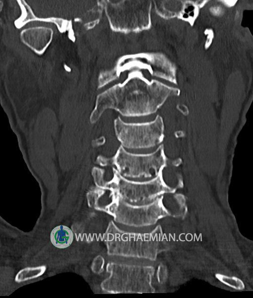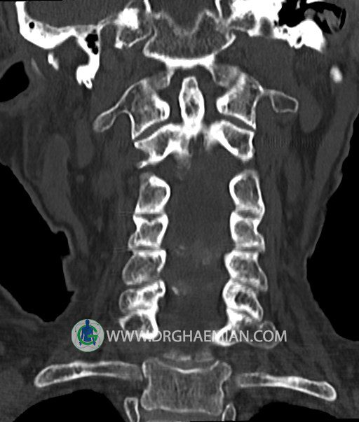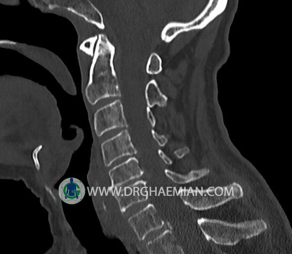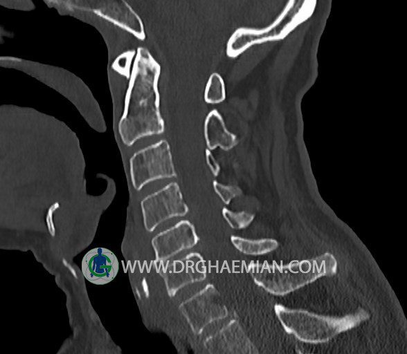 سی تی اسکن ناحیه فوقانی ستون فقرات یک روش تصویربرداری است که با استفاده از تششعات تصاویری با جزییات از ناحیه خالی گردن ایجاد میکند. در این کیس OPLL گردن (استخوانی شدن رباط طولی خلفی) و تغییرات DJD و نشانه های فشار و تنگی کانال نخاعی دیده می شود.