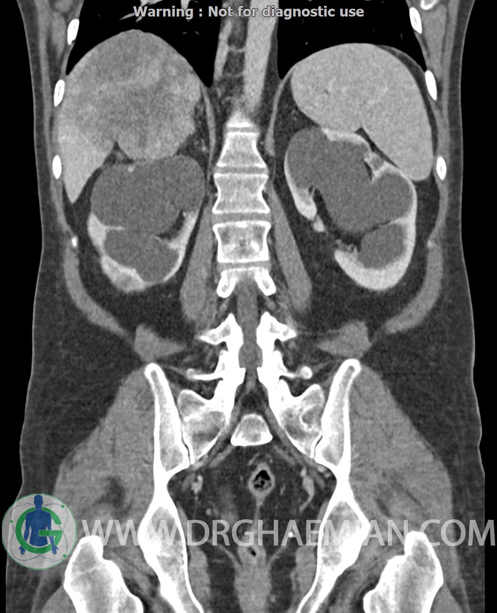 توده هتروژن بزرگ با حدود لوبوله به ابعاد 105x125x140mm در محل ادرنال راست چسبیده به قطب فوقانی کلیه راست و bulging به درون قسمت خلفی لوب راست کبد مشهود است .